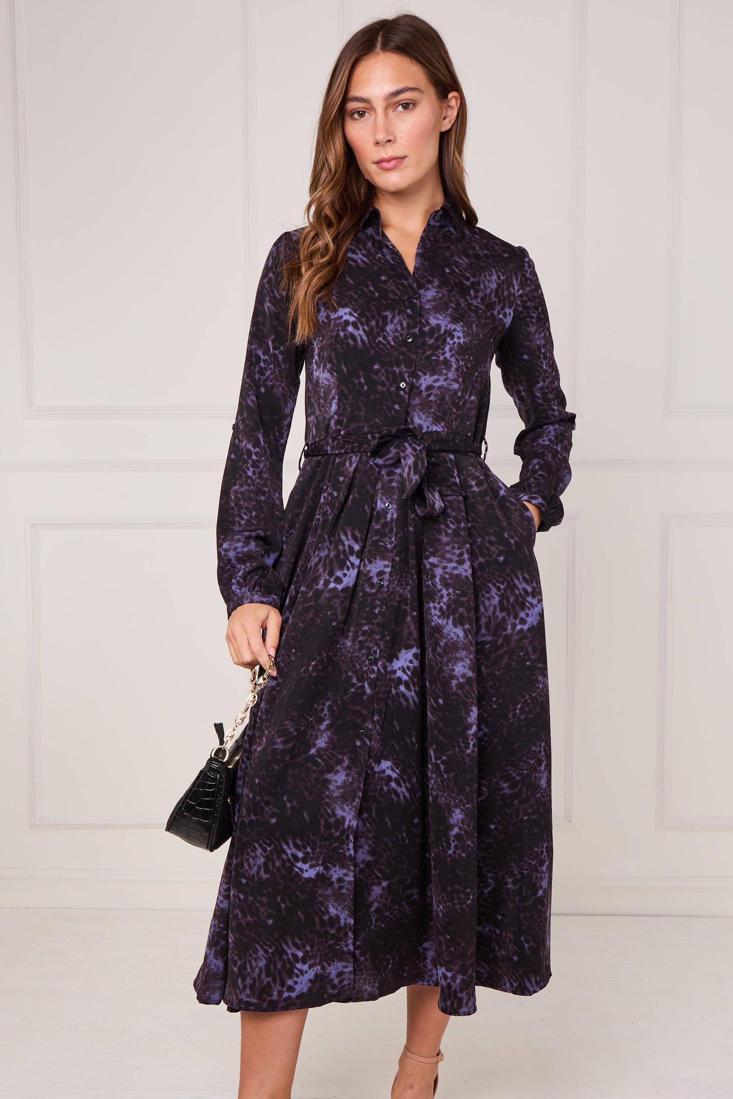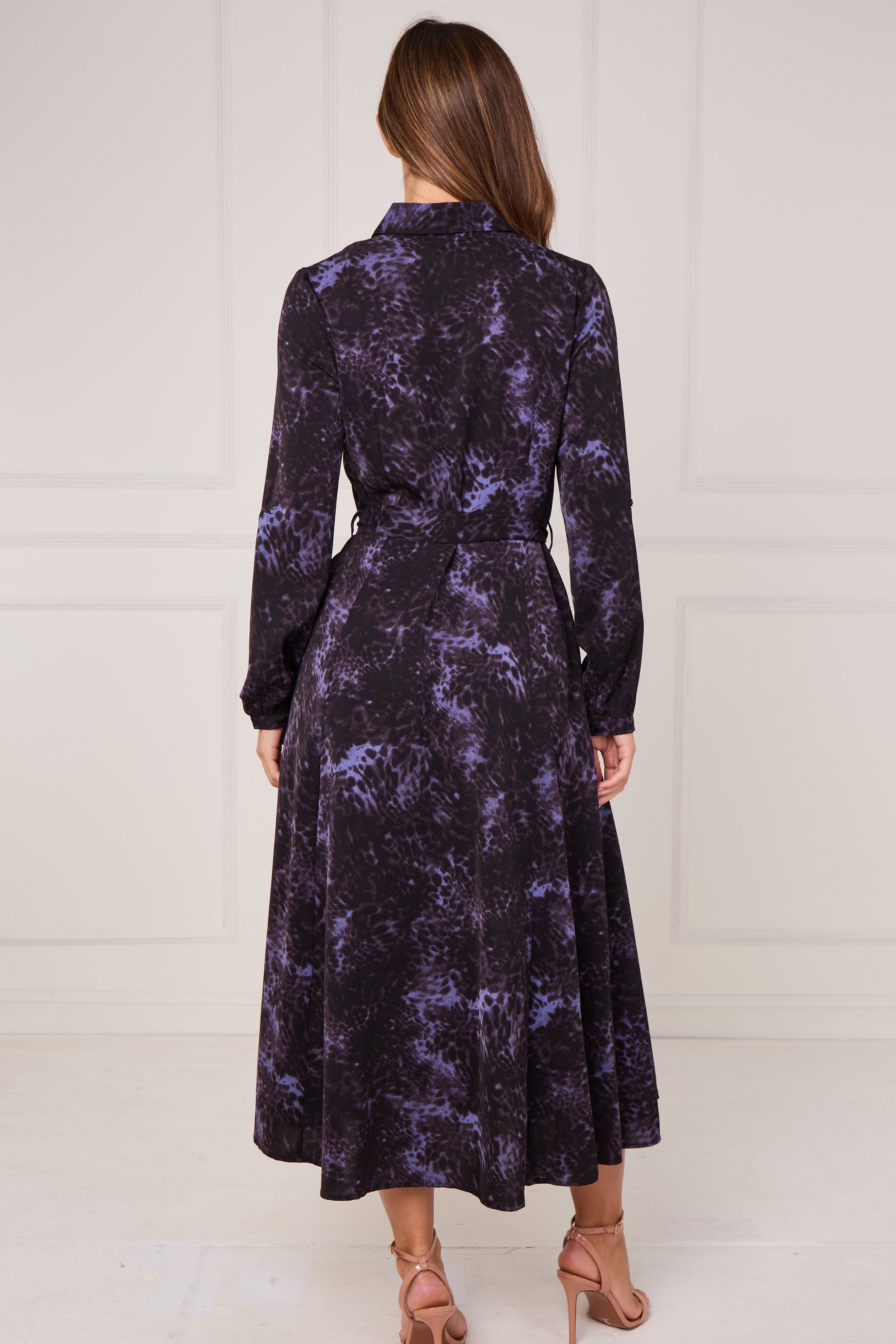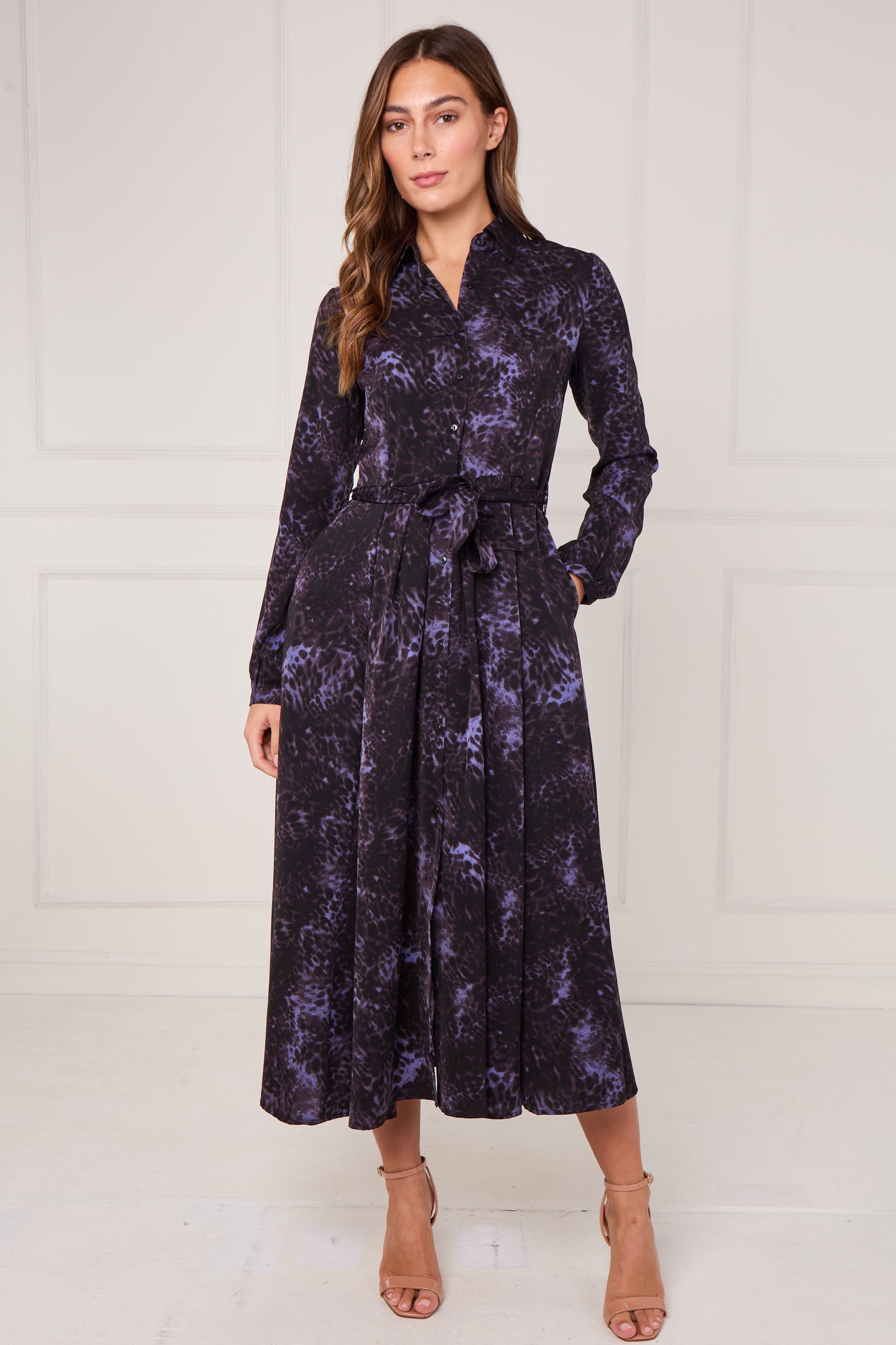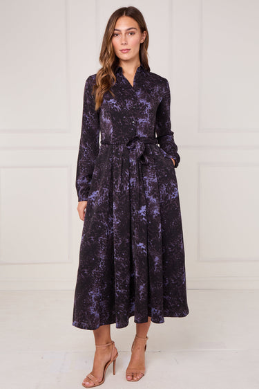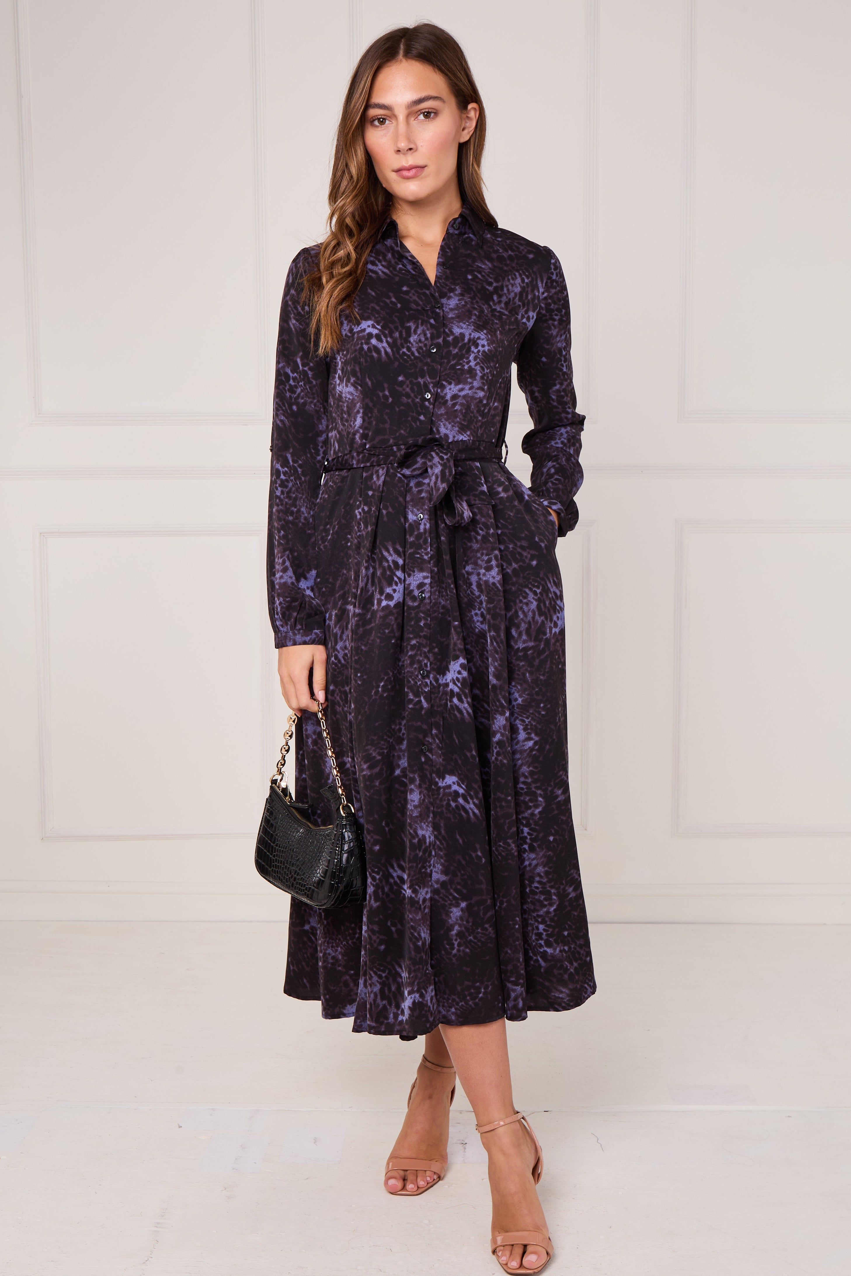 Crafted in a soft, fluid fabric, this black midaxi shirt dress features a striking violet abstract print that elevates the silhouette with a refined, contemporary edge. Designed with a full button-down front, long sleeves, a matching waist belt and discreet side pockets, it falls into a gracefully flowing skirt that moves beautifully with every step. Perfect for evening plans, special occasions or polished daytime styling, it brings effortless sophistication to any wardrobe.