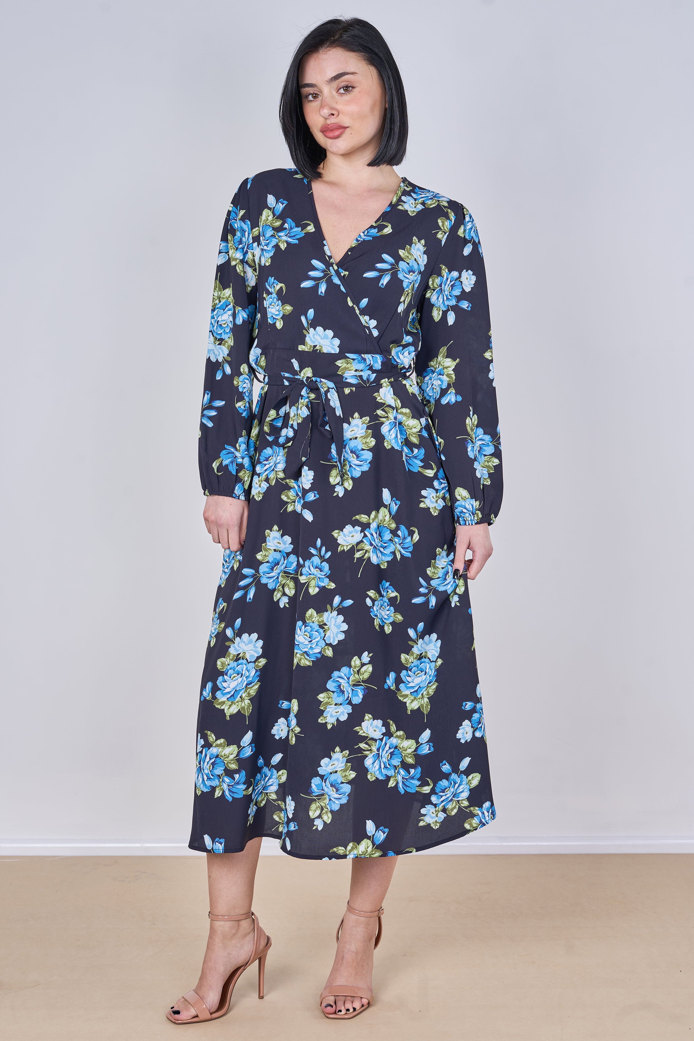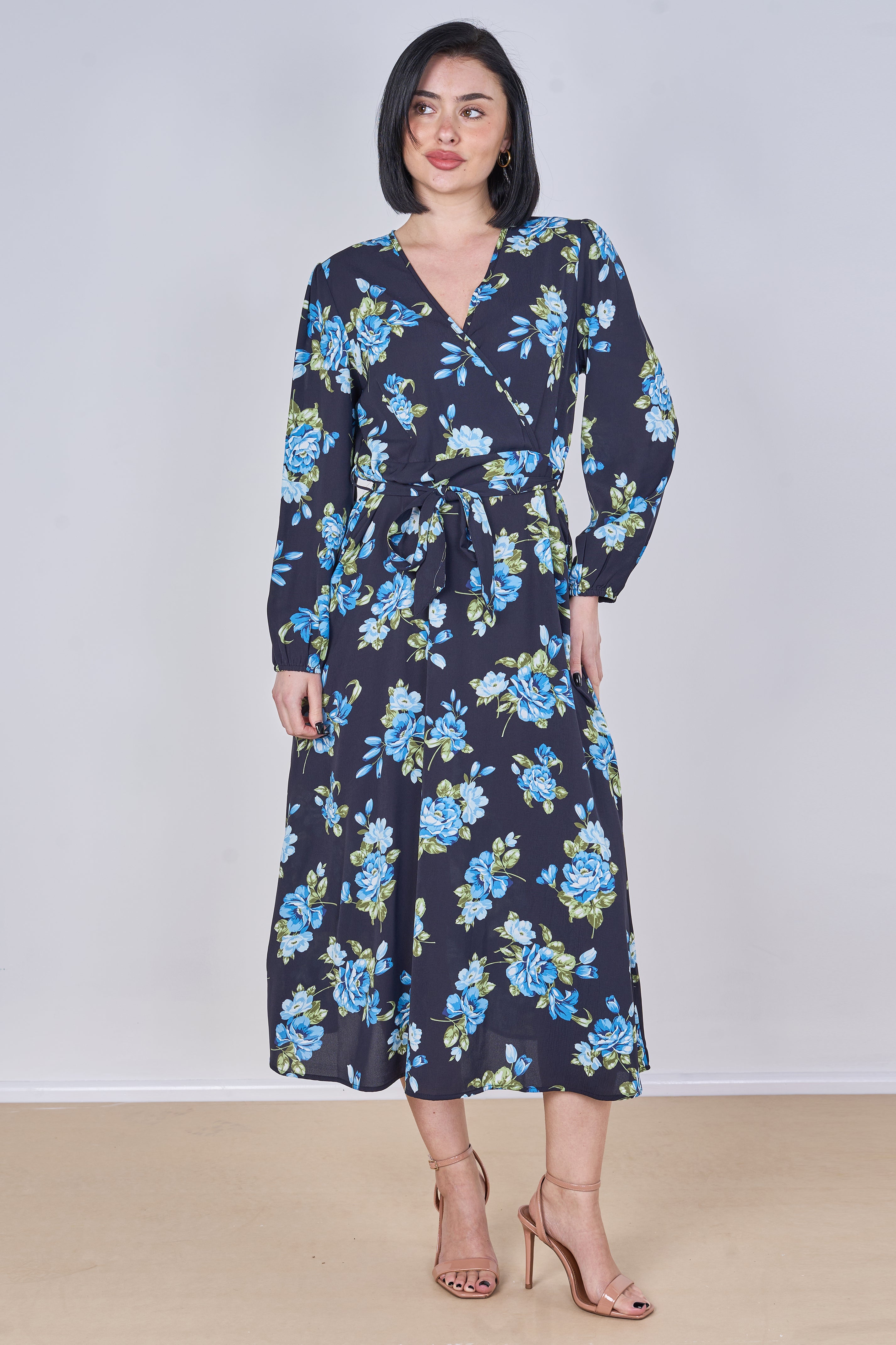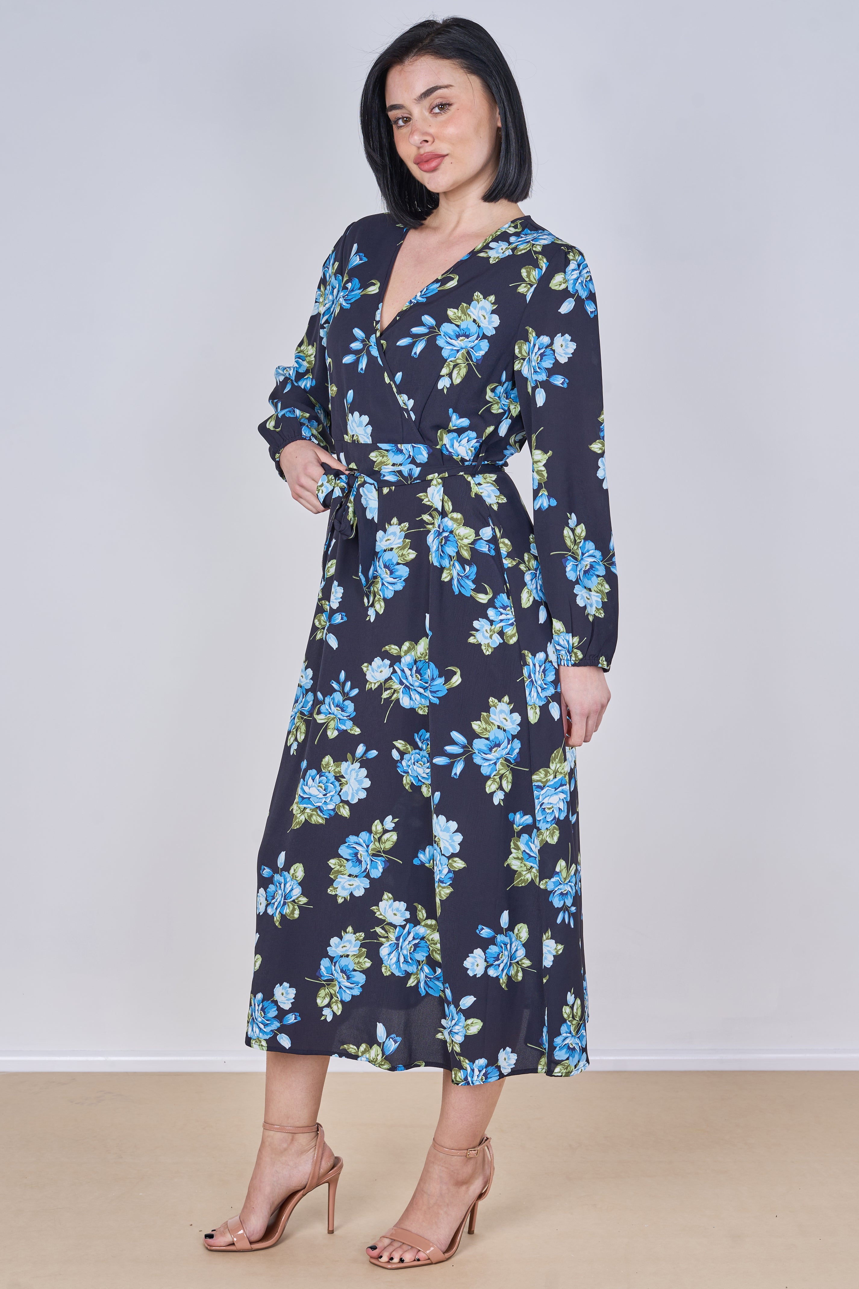 Effortlessly elegant and feminine, this black midi dress features a beautiful blue rose floral print that adds a fresh yet romantic touch to your wardrobe. Designed with a flattering crossover V-neckline and an adjustable tie waist belt, it enhances your silhouette while ensuring all-day comfort. The long sleeves and flowing midi length create a graceful and versatile look perfect for both daytime outings and evening occasions, while two side pockets add a practical and convenient finish. Style it with heels for a polished look or pair it with flats for an effortlessly chic everyday outfit.