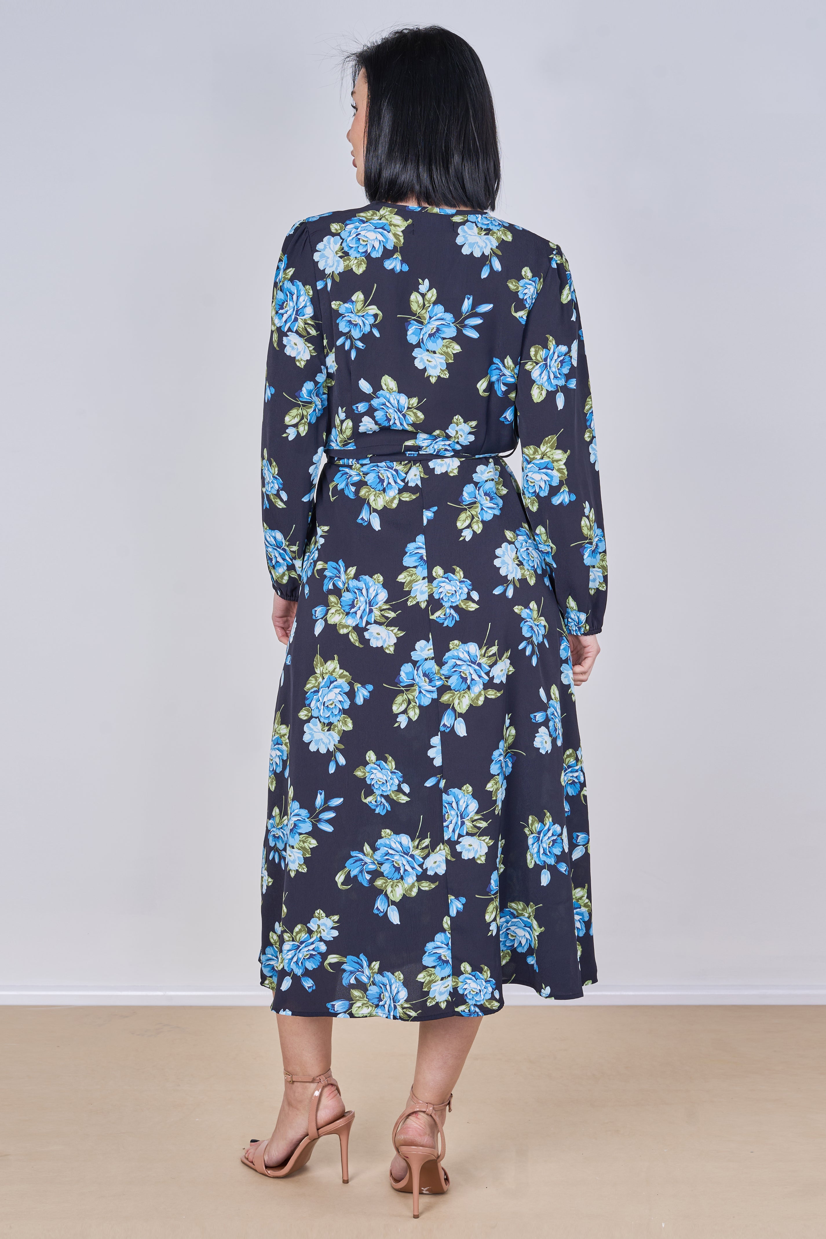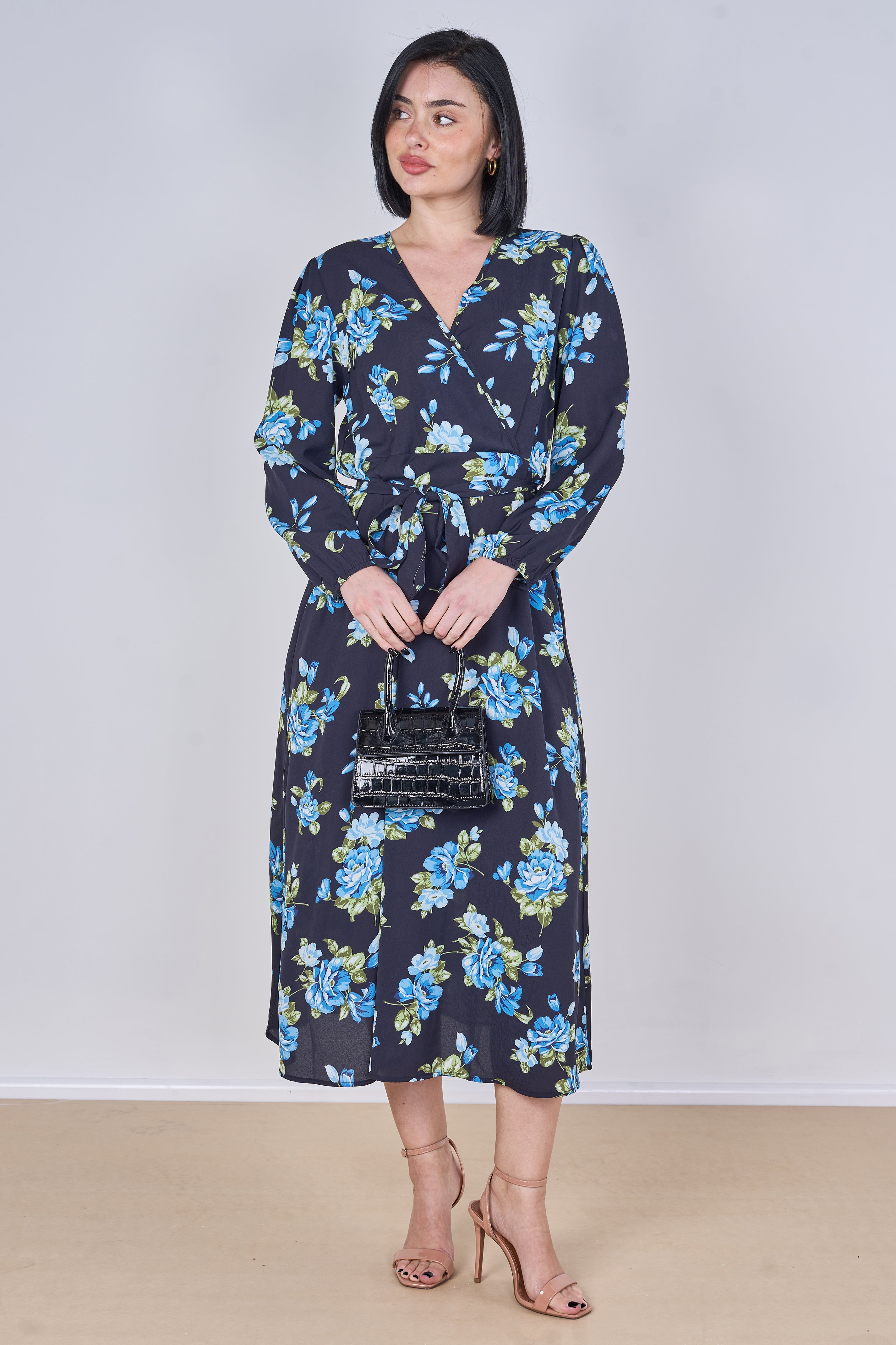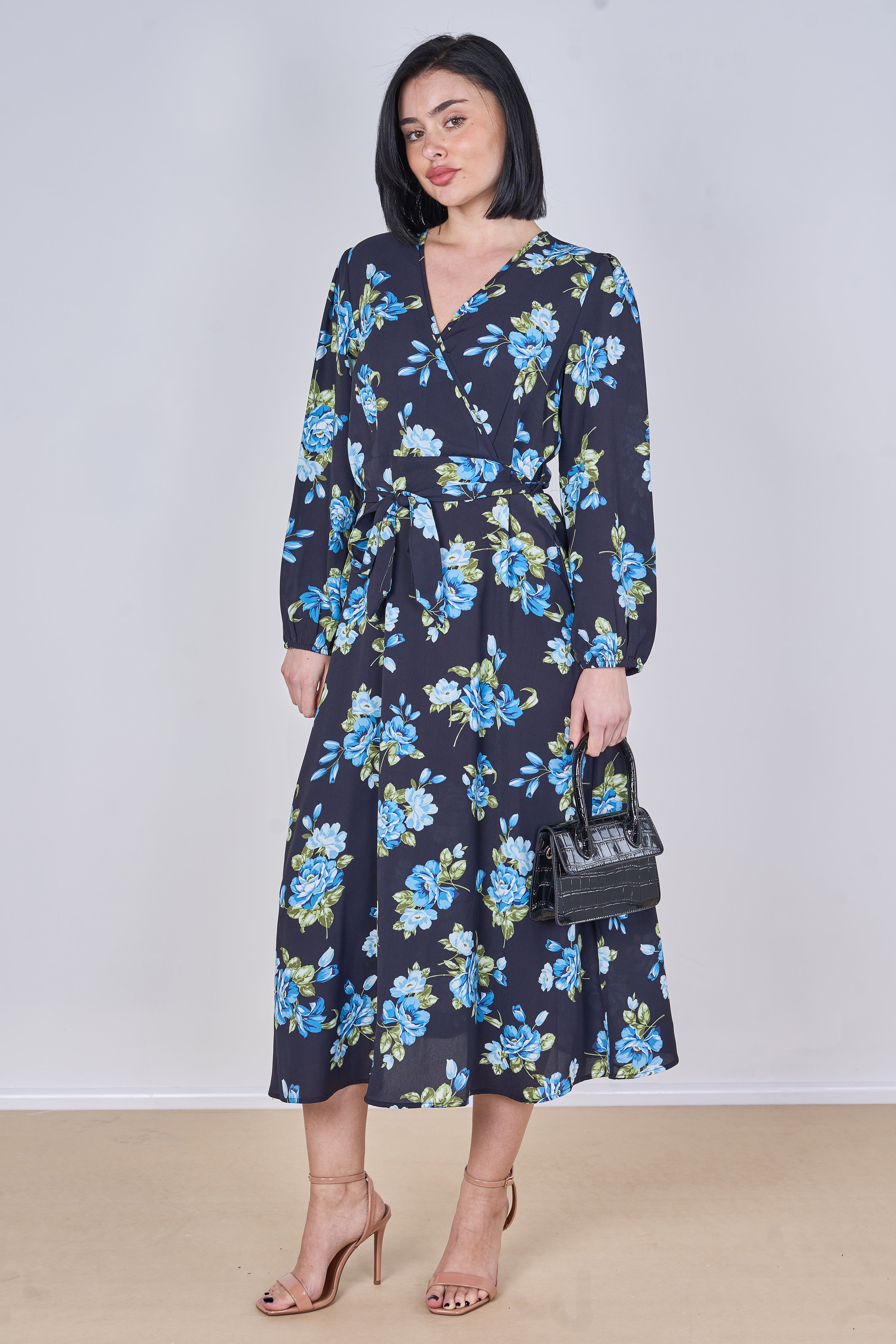 Effortlessly elegant and feminine, this black midi dress features a beautiful blue rose floral print that adds a fresh yet romantic touch to your wardrobe. Designed with a flattering crossover V-neckline and an adjustable tie waist belt, it enhances your silhouette while ensuring all-day comfort. The long sleeves and flowing midi length create a graceful and versatile look perfect for both daytime outings and evening occasions, while two side pockets add a practical and convenient finish. Style it with heels for a polished look or pair it with flats for an effortlessly chic everyday outfit.