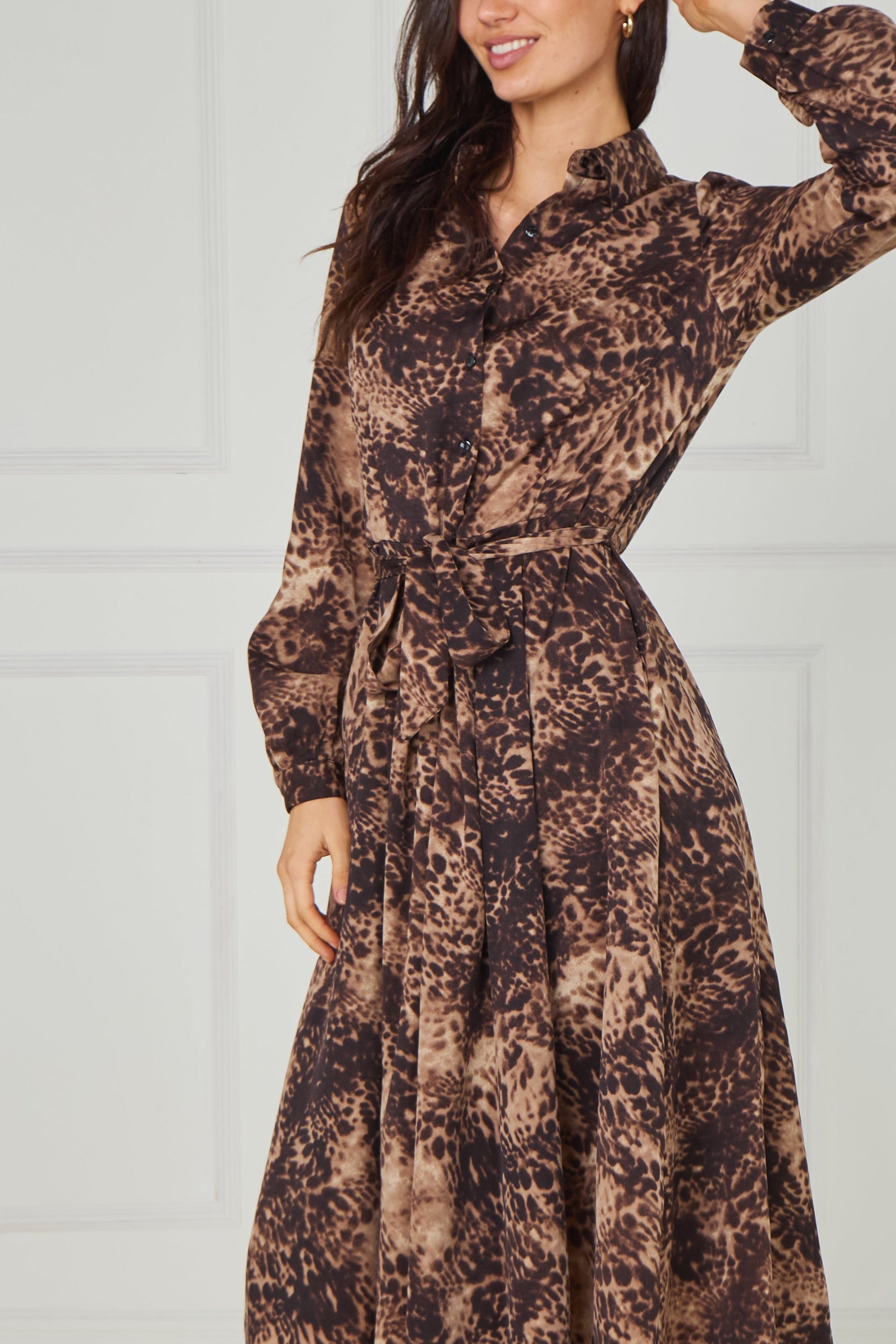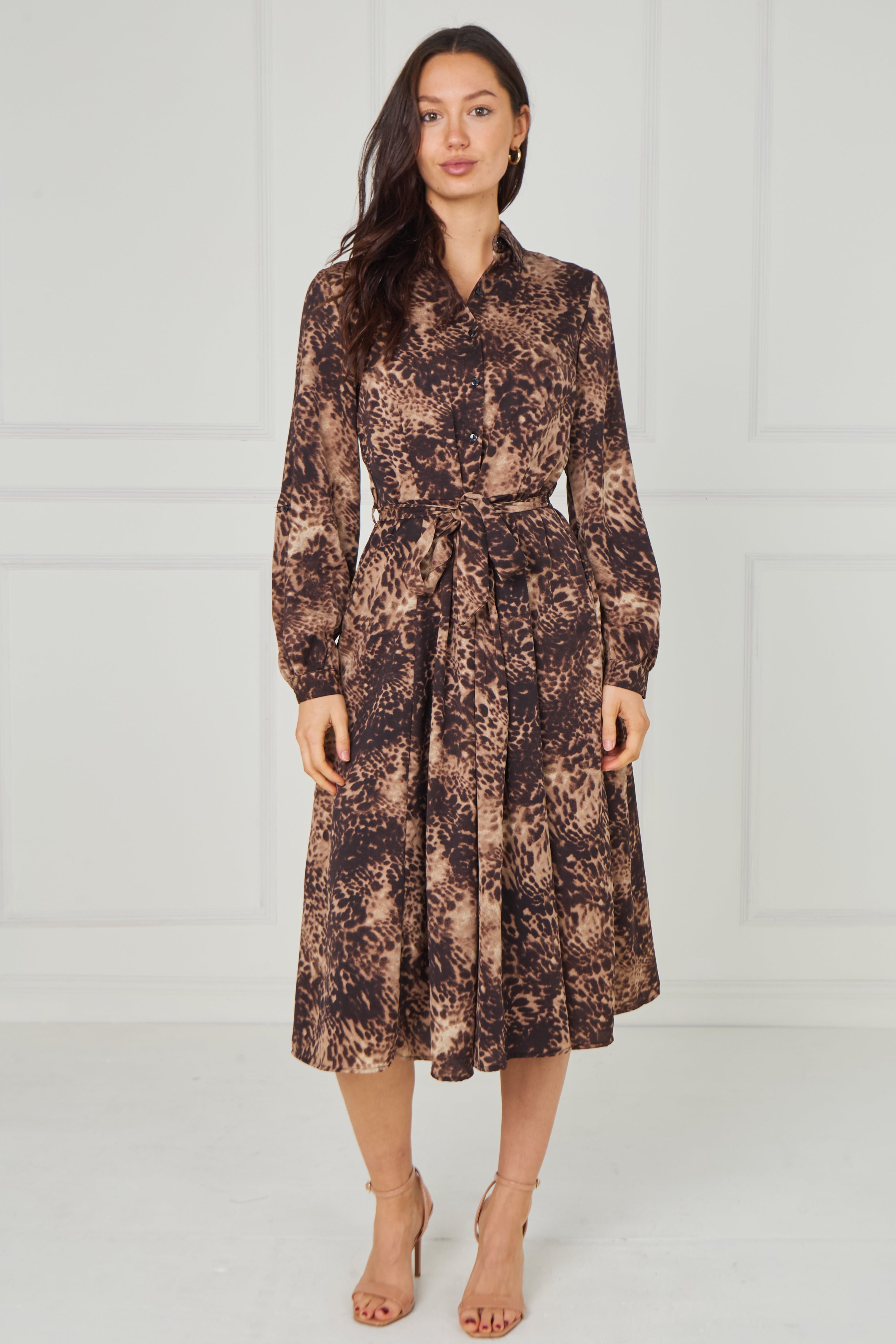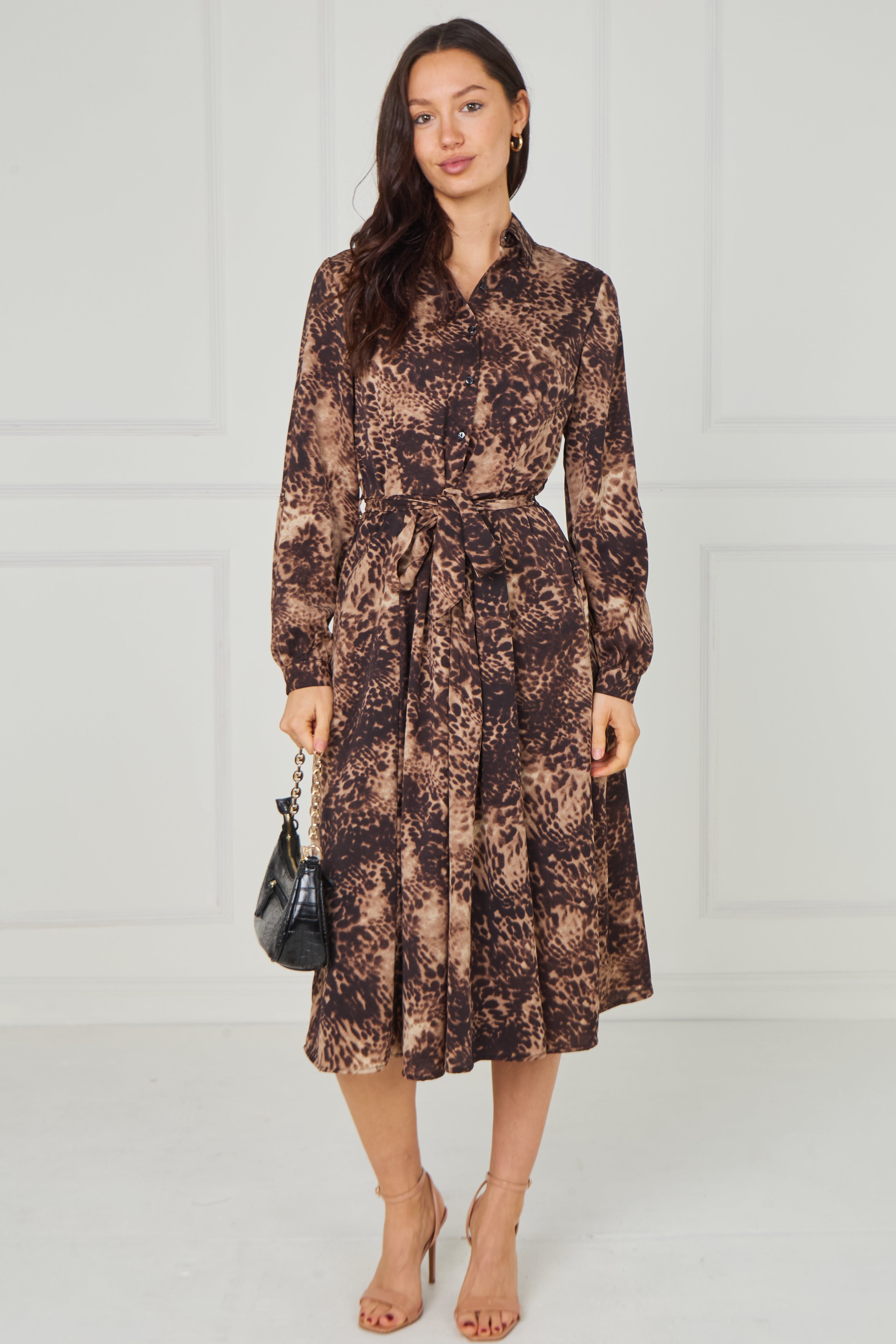 This Brown Leopard Smudge Print Midi Shirt Dress features a full button-down front, a classic shirt collar, long sleeves with buttoned cuffs, and a removable self-tie belt that lets you adjust the fit to define the waist. Designed with two functional side pockets for everyday practicality, the dress flows into a comfortable midi-length skirt that moves beautifully with each step. The brown leopard smudge print adds subtle texture and a stylish edge, making this versatile piece perfect for workdays, brunch outings, casual events, or dressed-up evening occasions depending on how you style it.