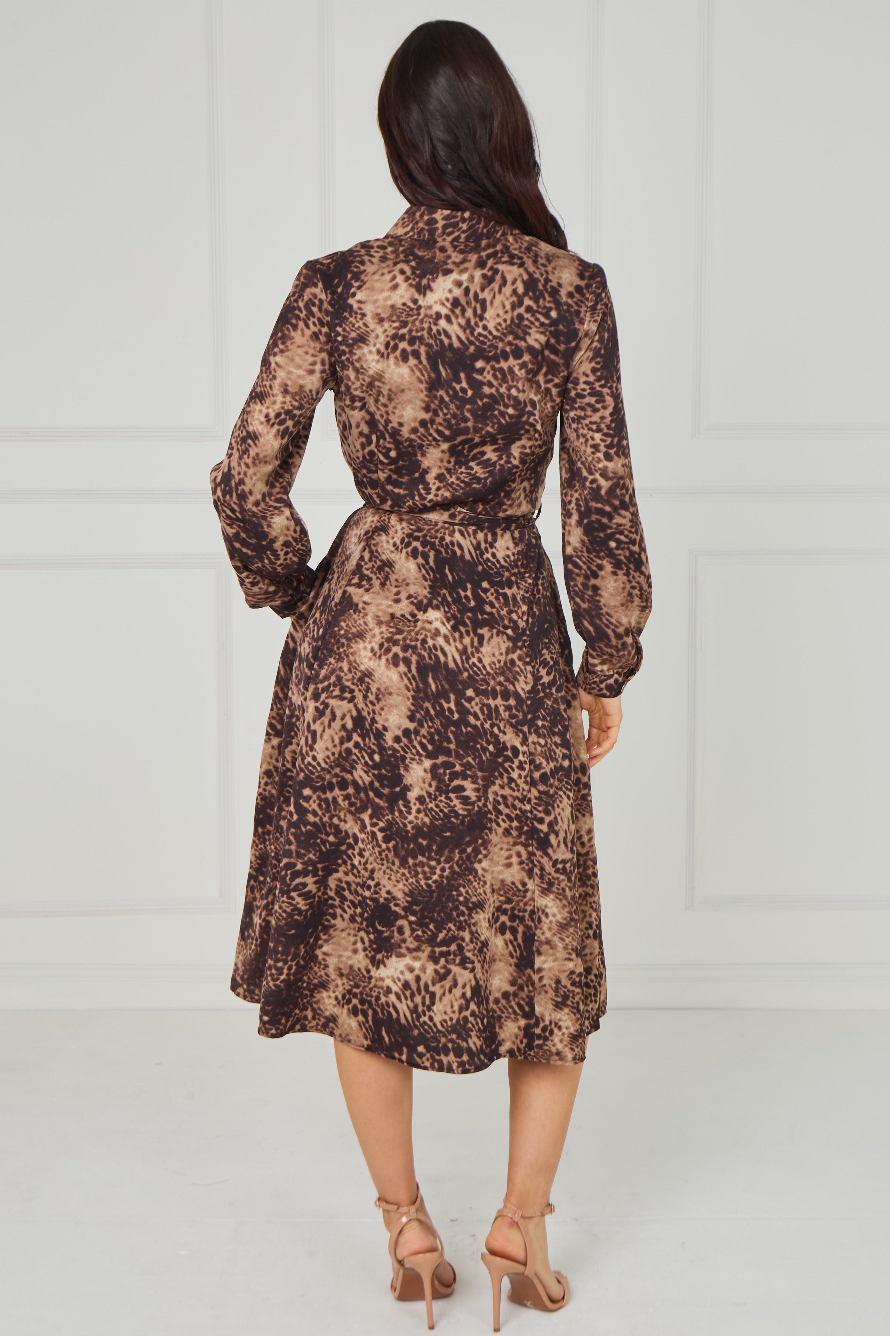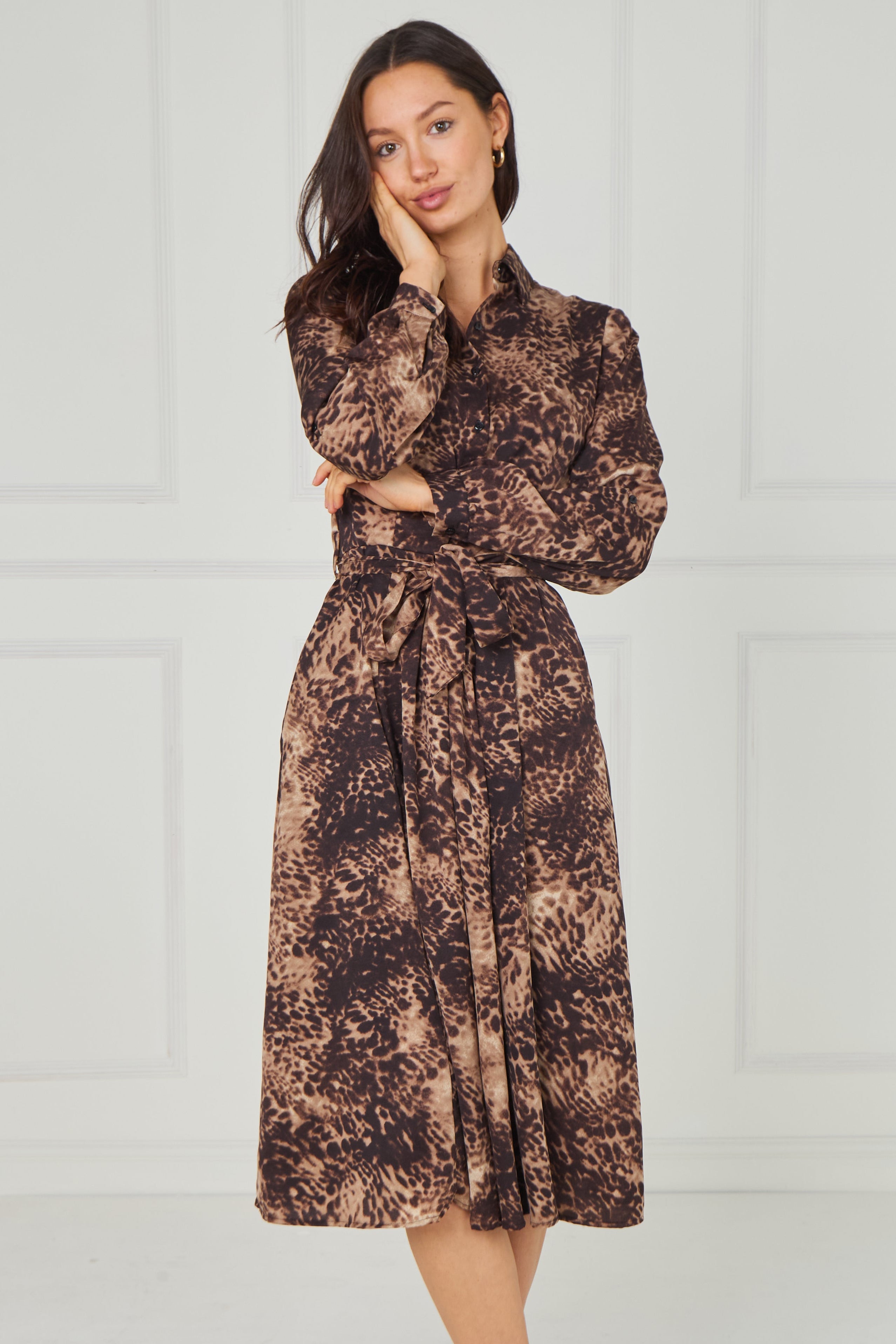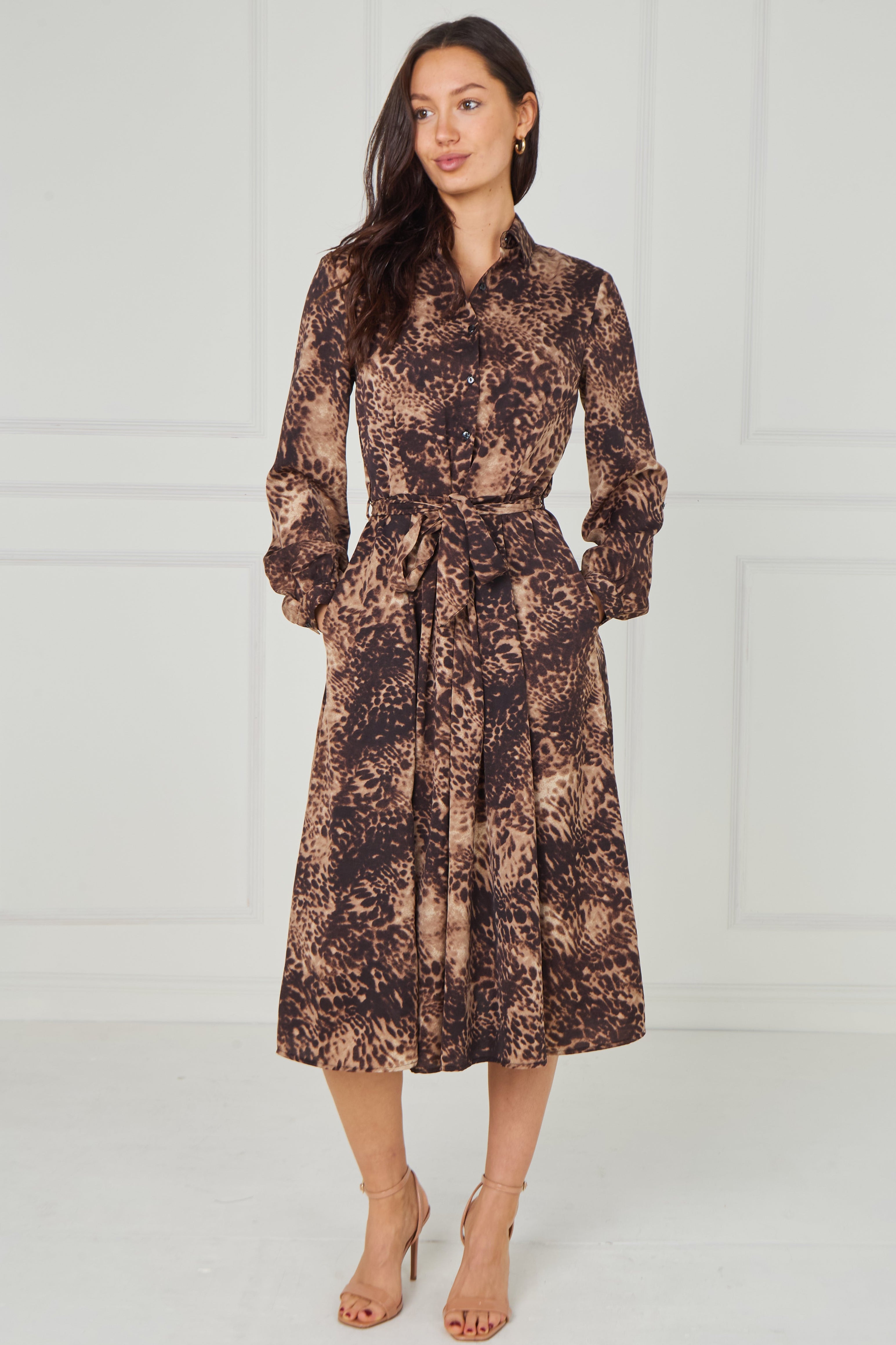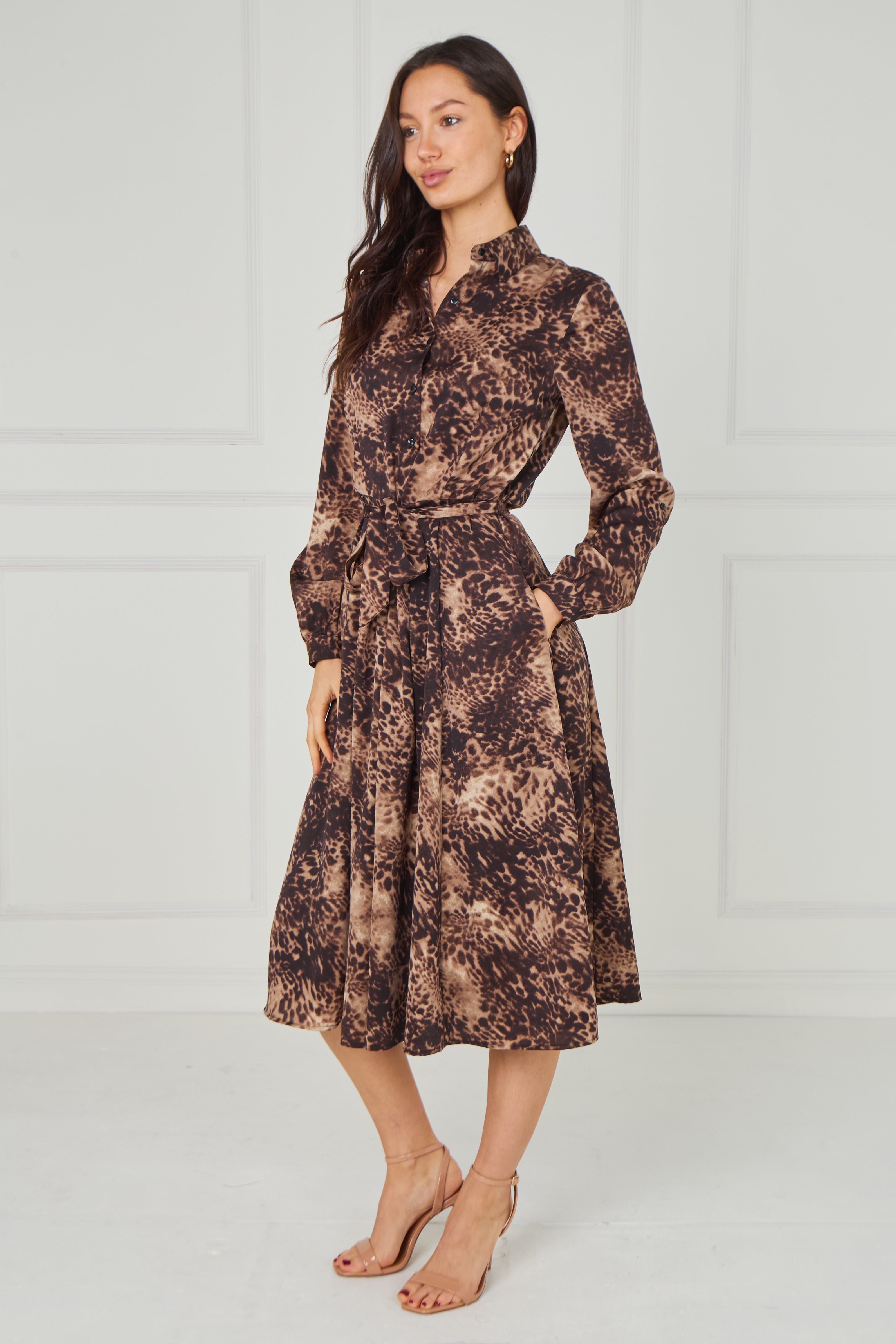 This Brown Leopard Smudge Print Midi Shirt Dress features a full button-down front, a classic shirt collar, long sleeves with buttoned cuffs, and a removable self-tie belt that lets you adjust the fit to define the waist. Designed with two functional side pockets for everyday practicality, the dress flows into a comfortable midi-length skirt that moves beautifully with each step. The brown leopard smudge print adds subtle texture and a stylish edge, making this versatile piece perfect for workdays, brunch outings, casual events, or dressed-up evening occasions depending on how you style it.