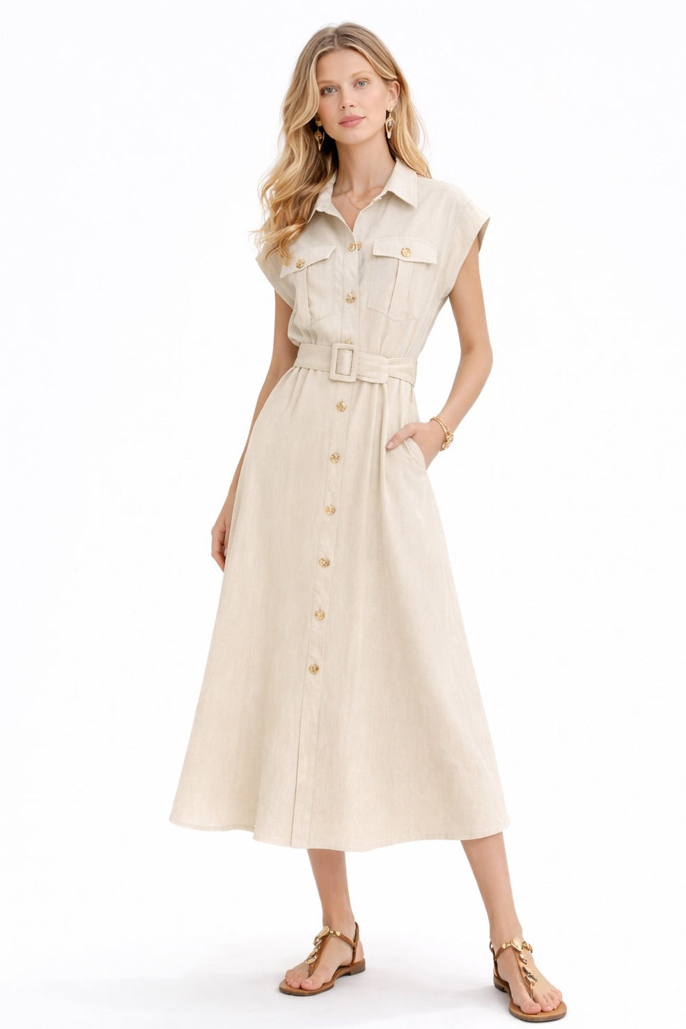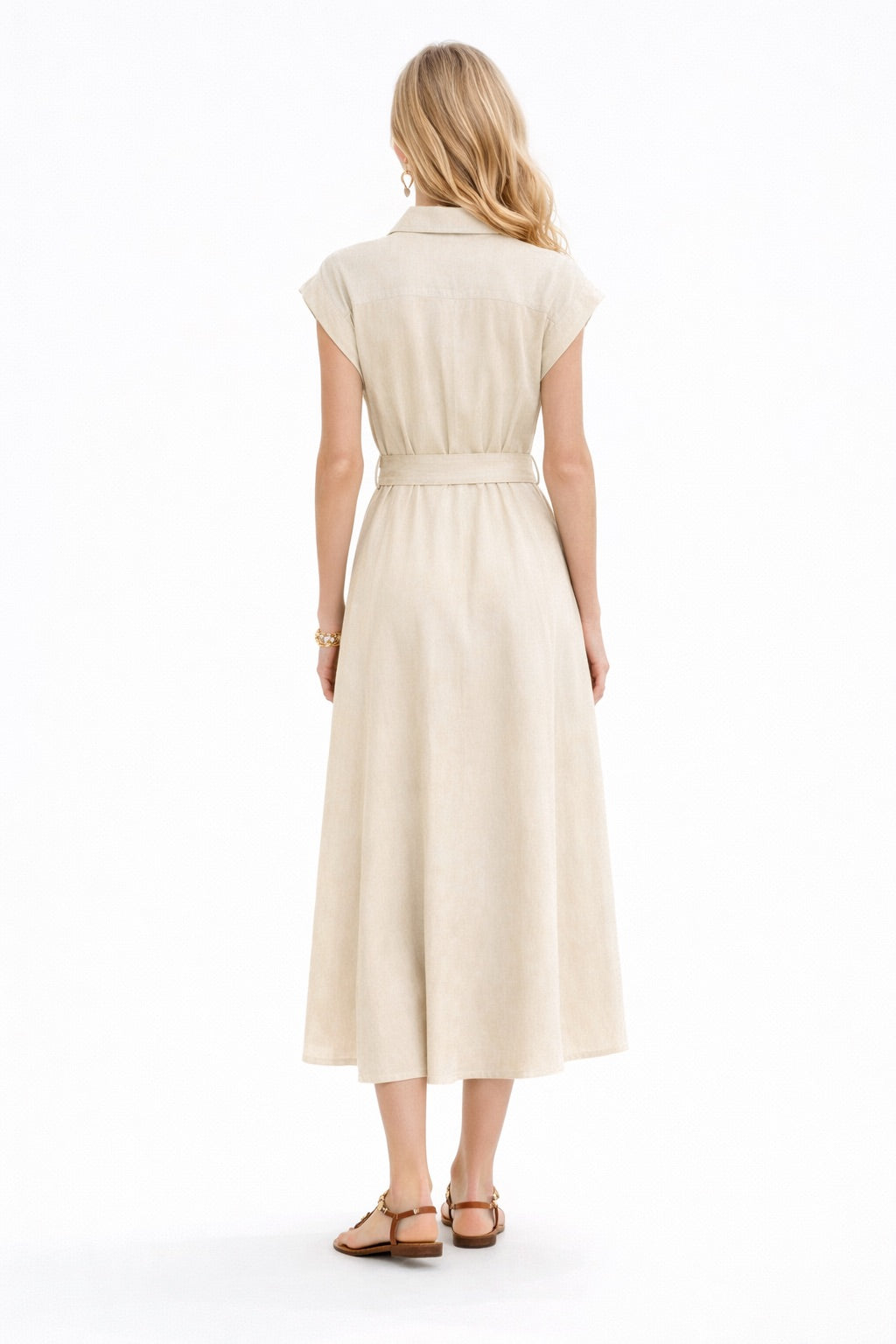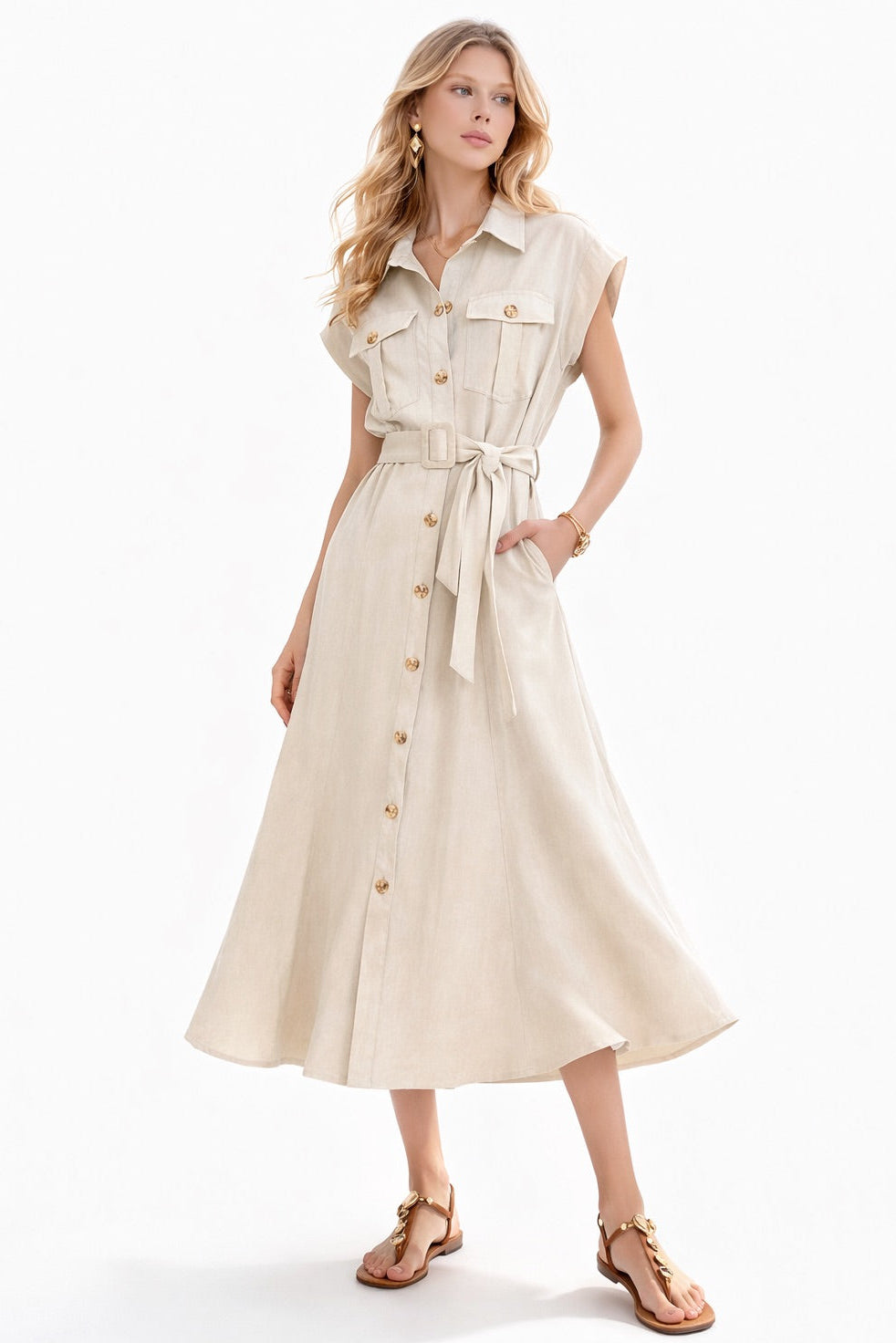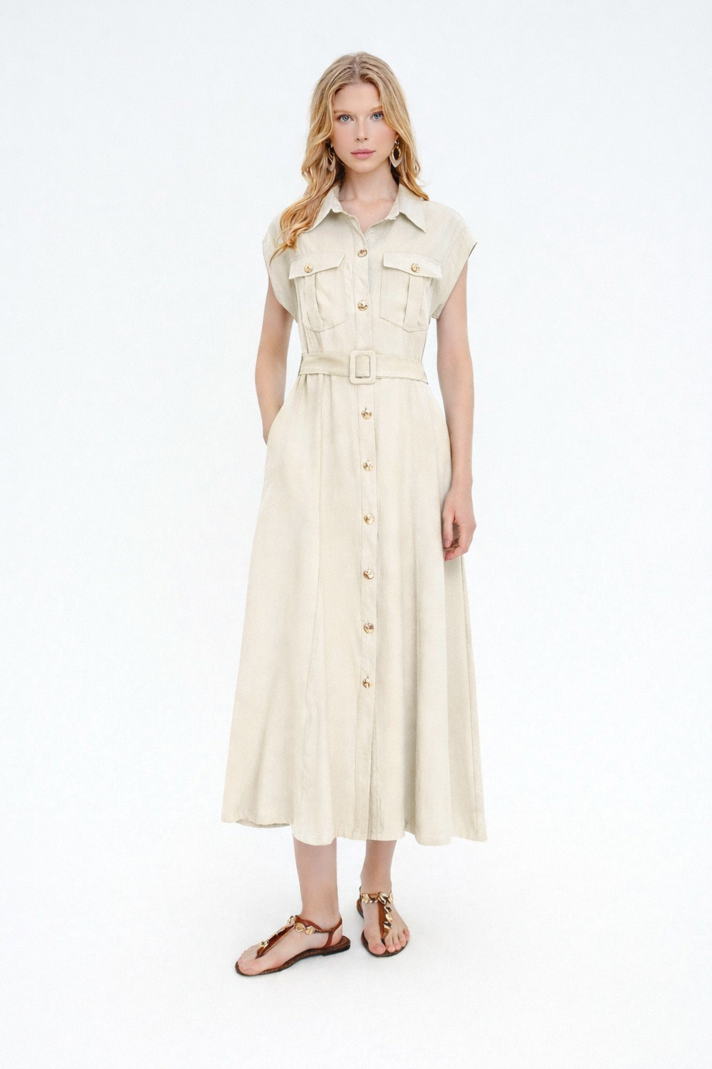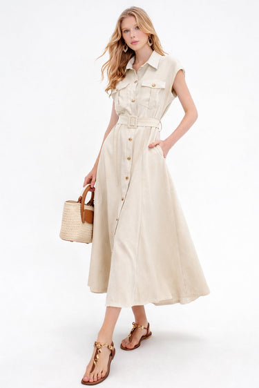 Effortlessly refined with a modern utility edge, the Cream Sand Utility Belted Midi Shirt Dress features a soft cream-beige tone inspired by warm sand hues. Designed with a structured shirt collar, button-through front, and flap chest pockets, it blends polished tailoring with relaxed elegance. The matching belt with a statement buckle cinches the waist for a flattering silhouette, while the midi-length skirt flows beautifully with movement. Finished with two side pockets for everyday practicality, this versatile piece is perfect for elevated daytime styling or chic, understated occasions.