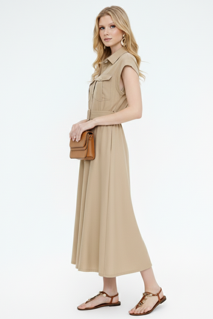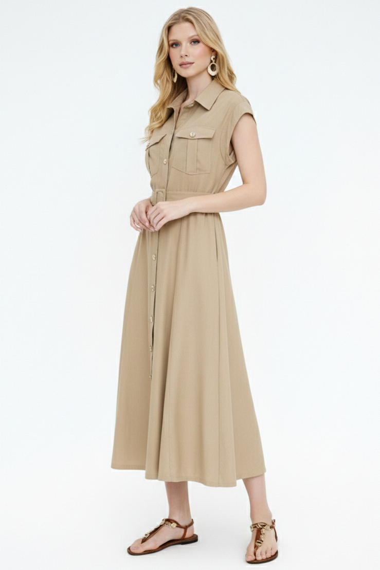 This is a timeless, safari-inspired staple crafted in a warm sandy beige tone for effortless everyday elegance. Designed with a classic shirt collar, cap sleeves, and a full button-through front, it features structured chest pockets and an adjustable self-fabric belt that cinches the waist for a flattering silhouette. The softly flared midi-length skirt offers beautiful movement, while two side pockets add essential practicality without compromising style. Perfect for work, weekends, or holiday styling, this versatile piece pairs seamlessly with sandals for a relaxed look or heels for a more polished finish.