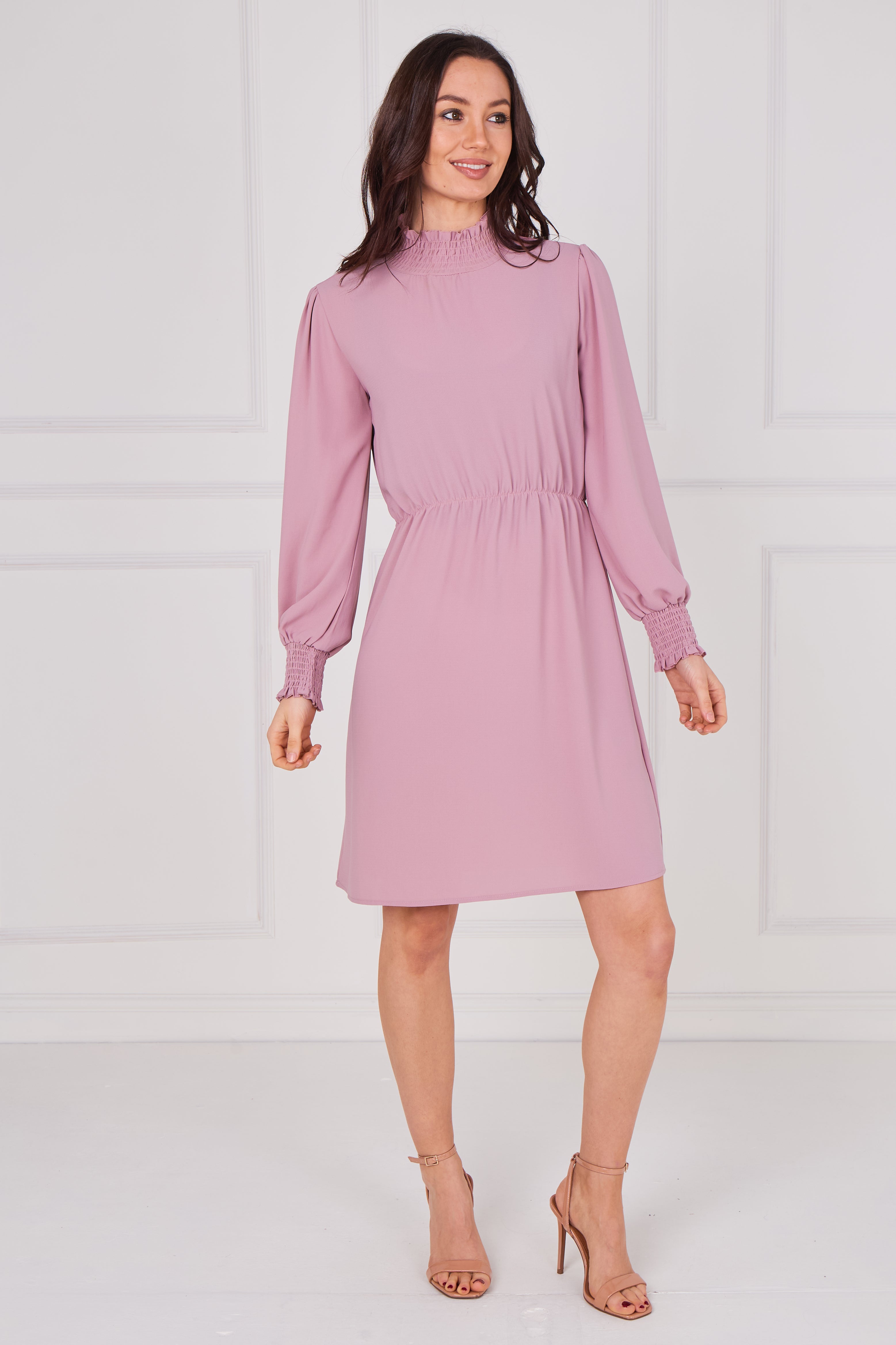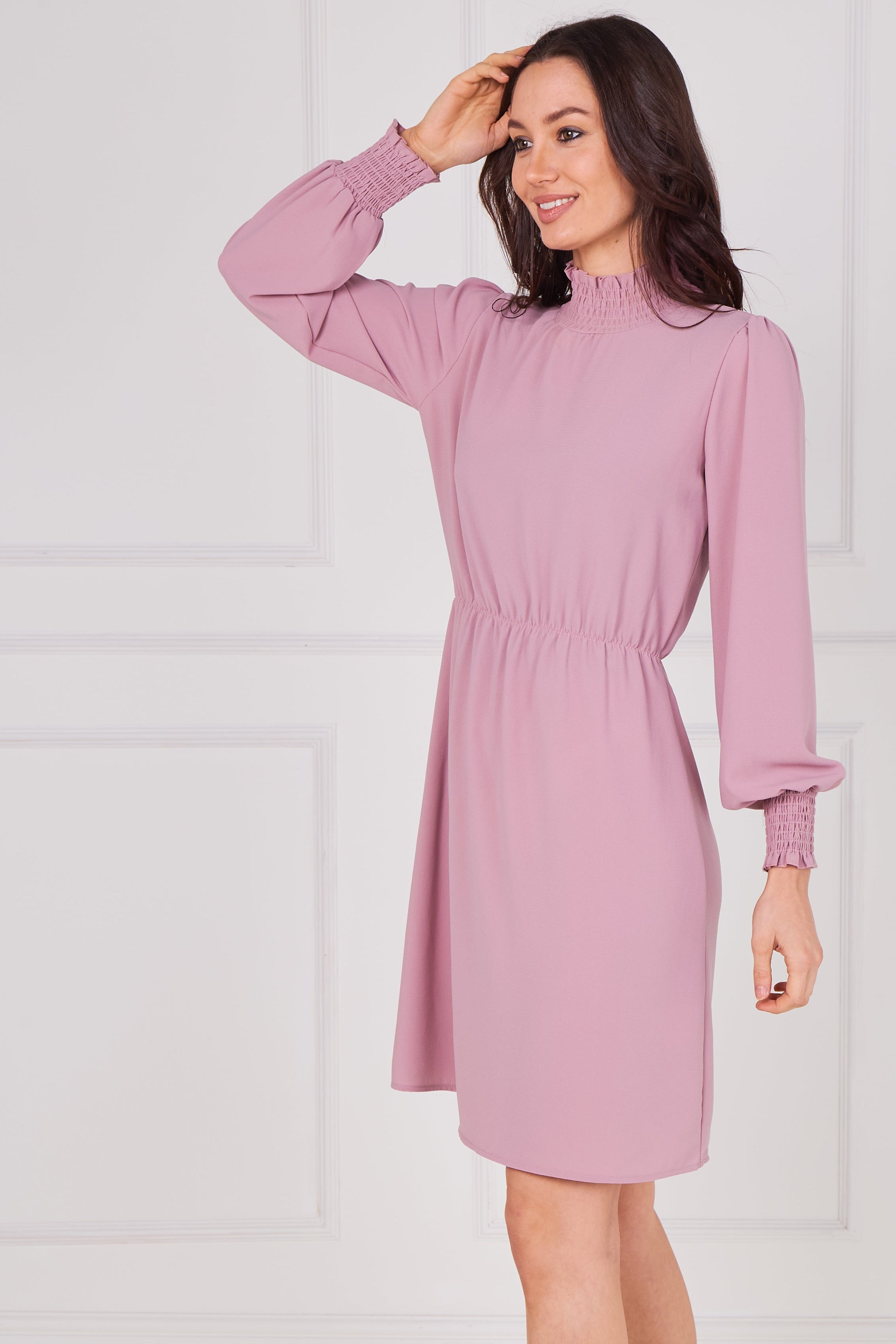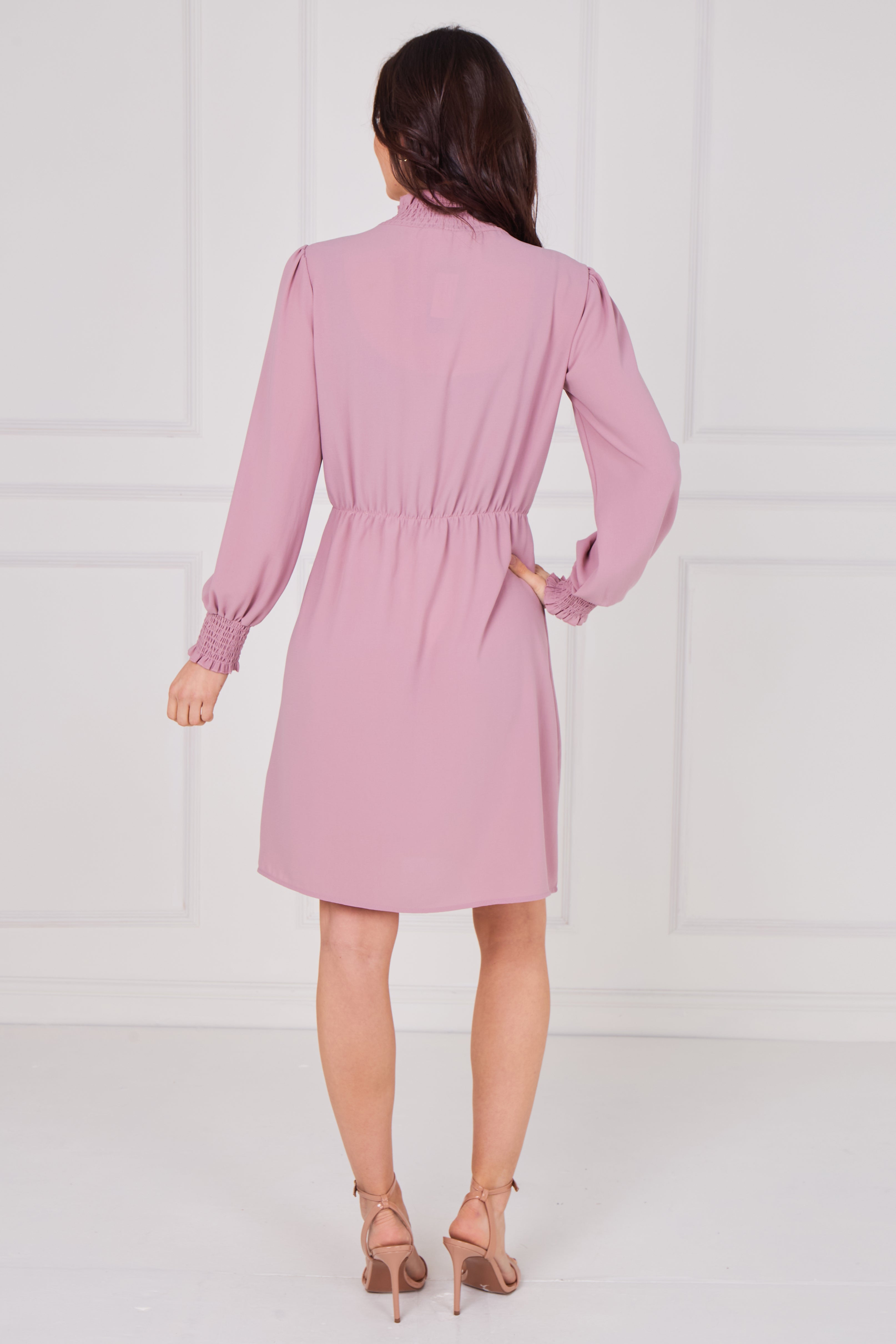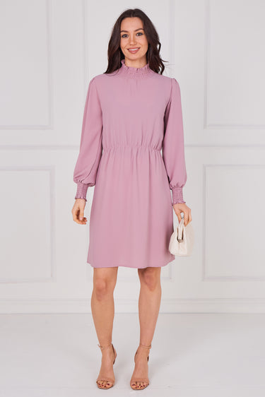 Dusty Rose Shirred Neck Long Sleeve Dress