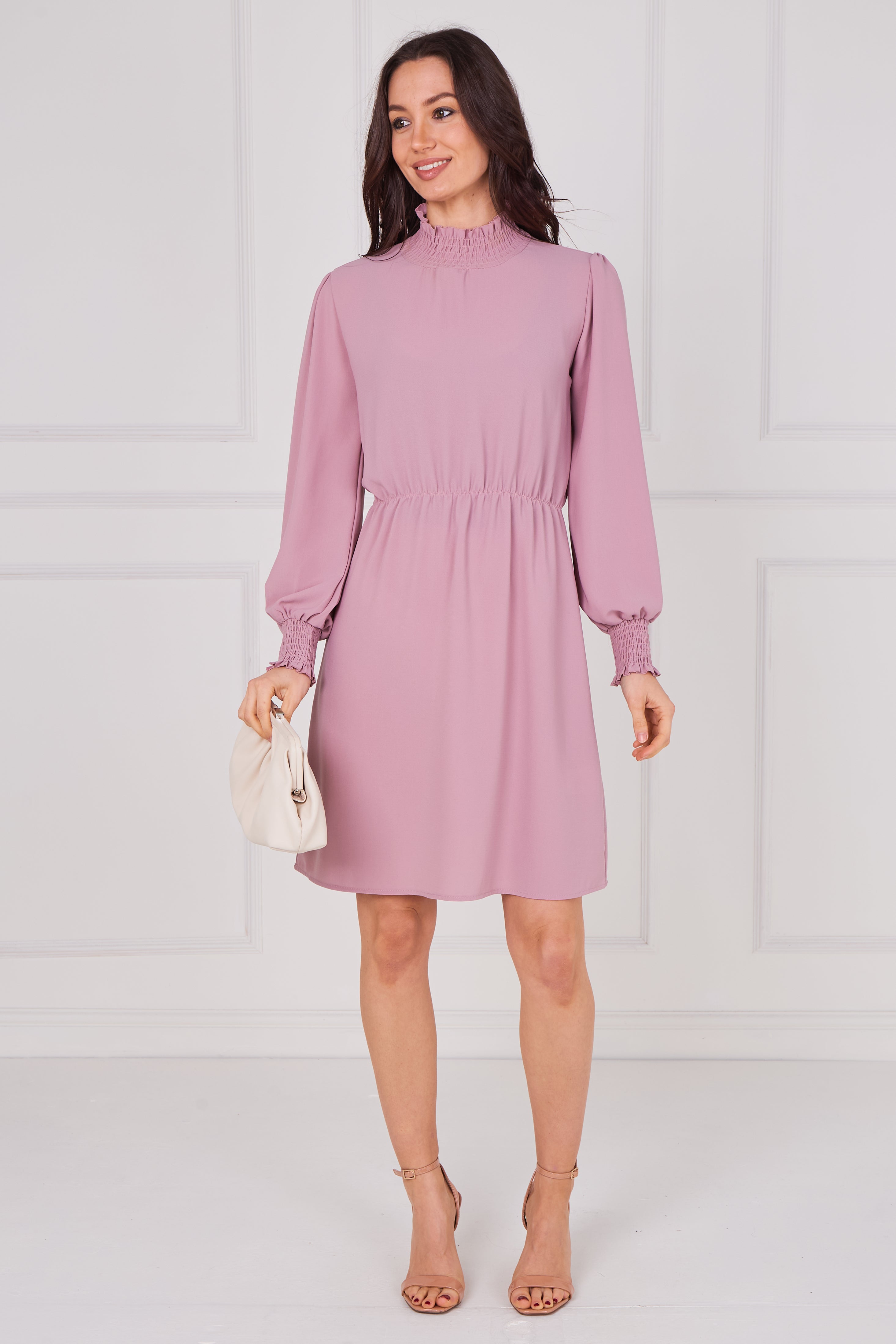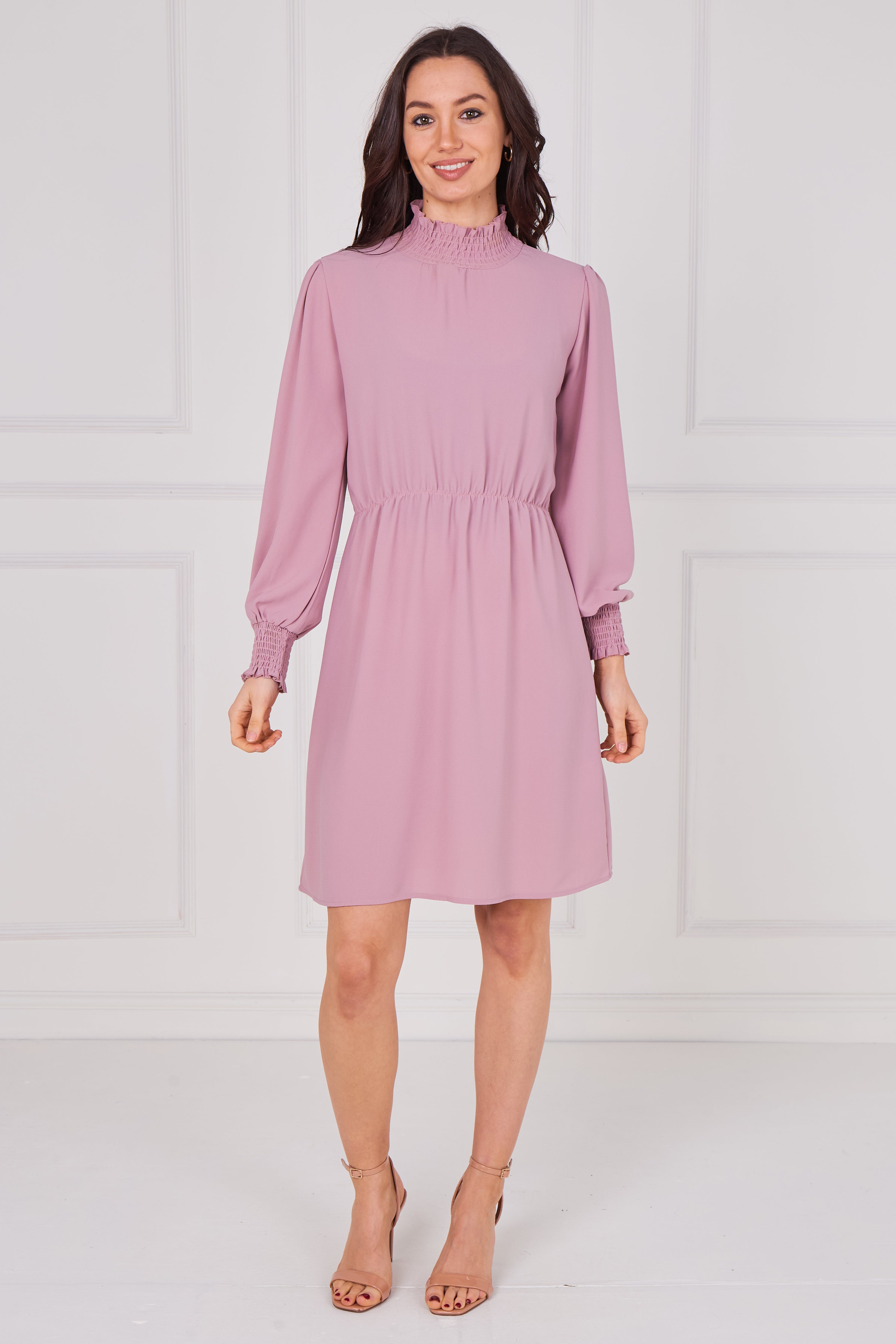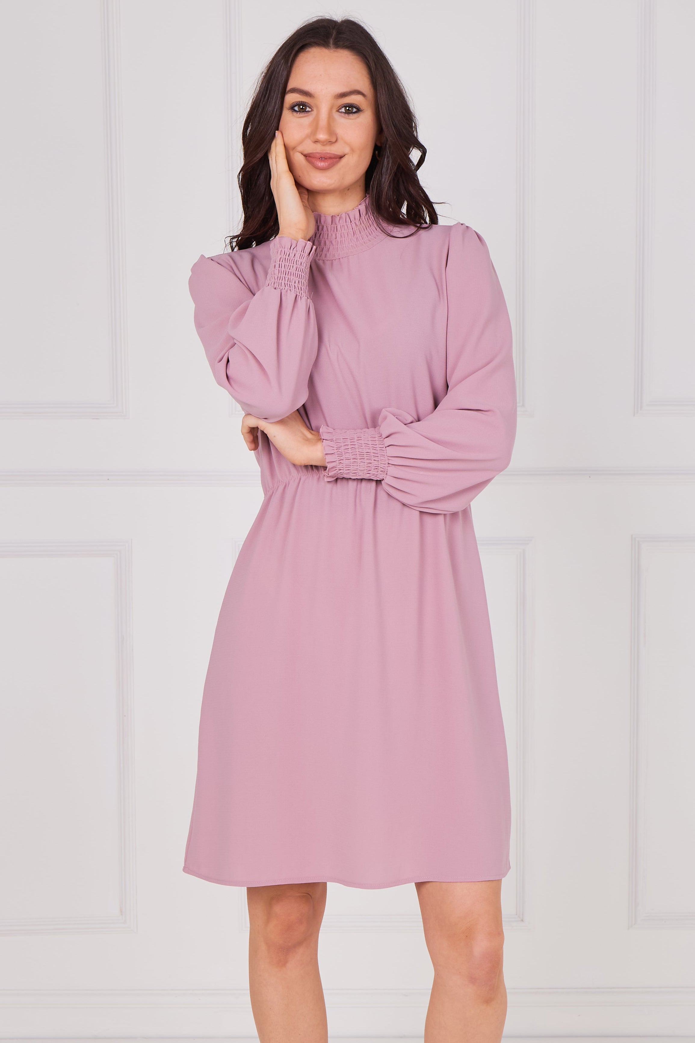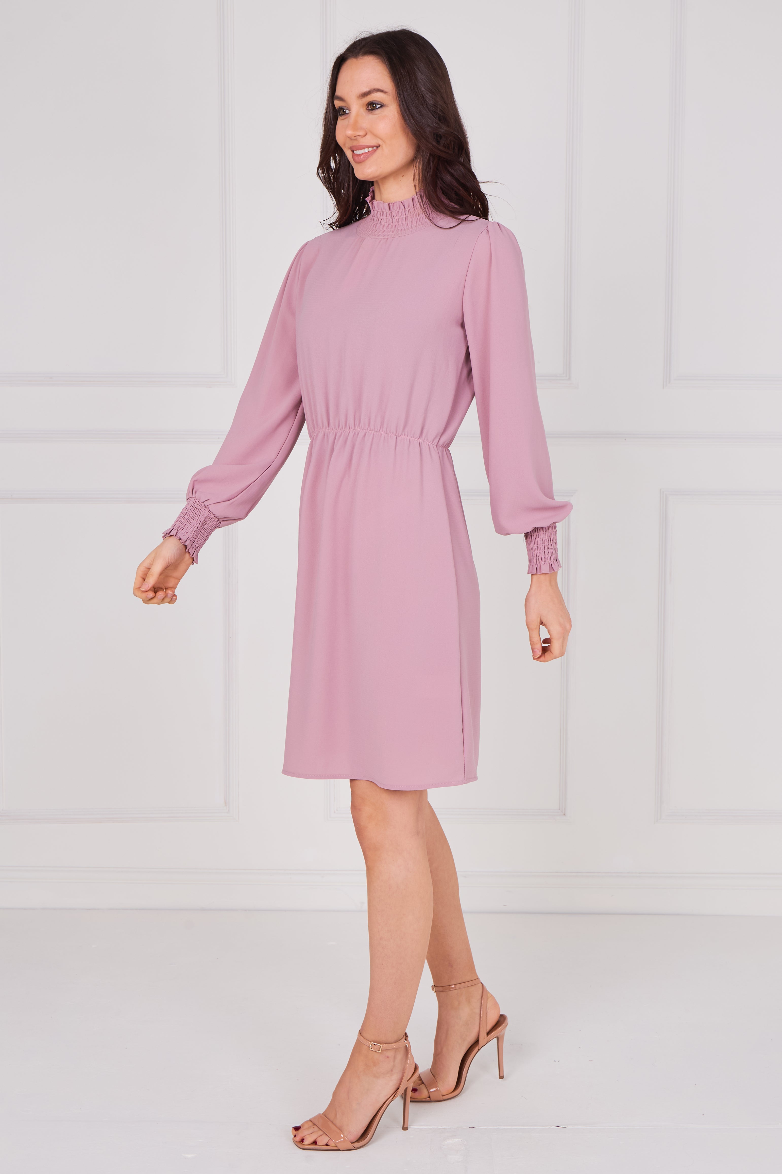 Dusty Rose Shirred Neck Long Sleeve Dress