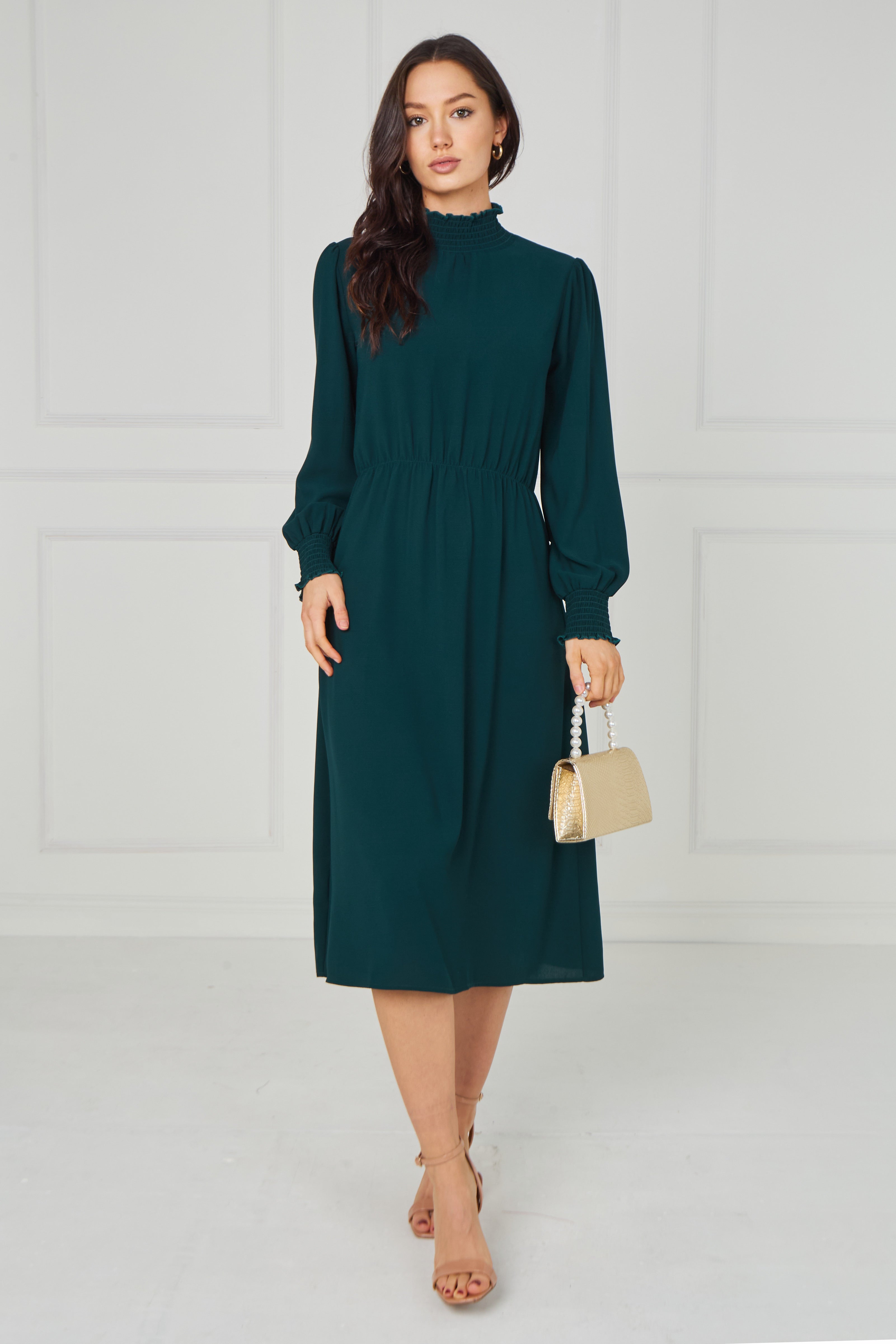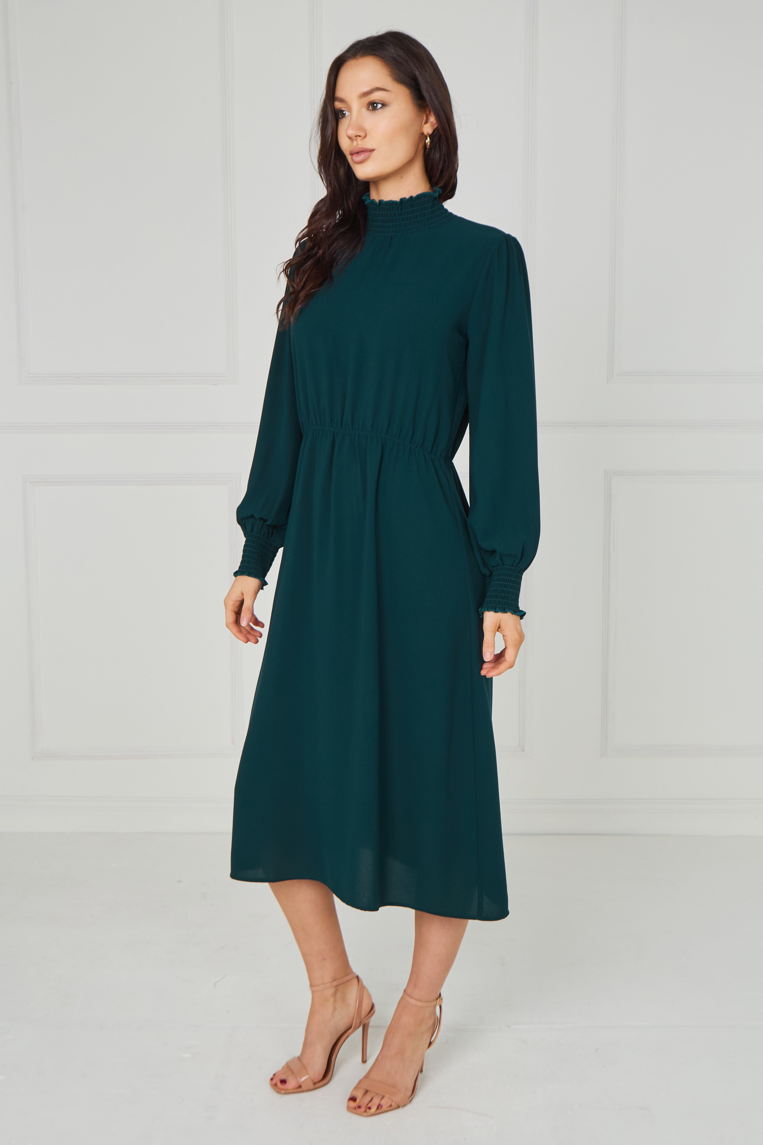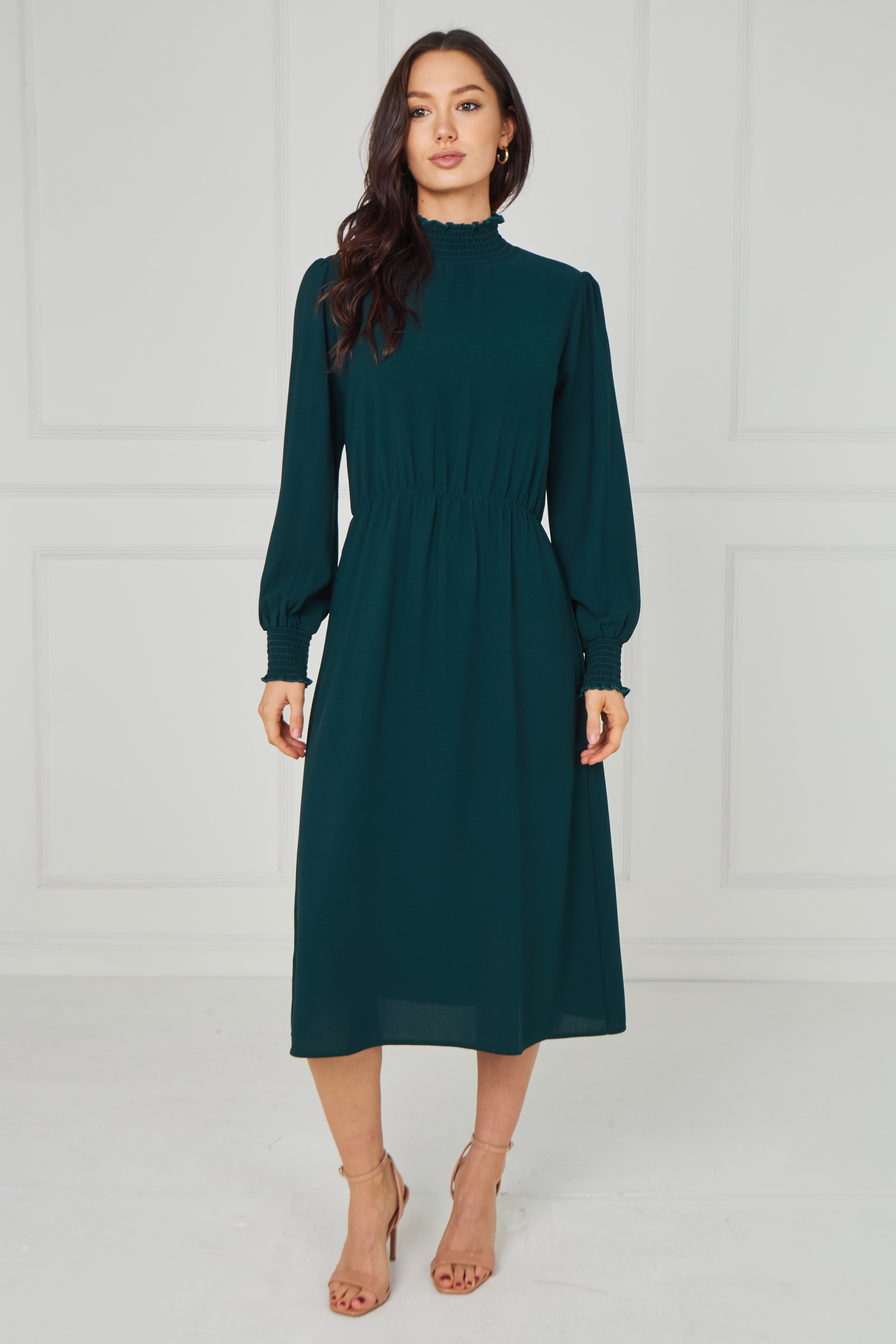 Timeless and effortlessly sophisticated, this Emerald Green Shirred High Neck Midaxi Dress is a refined addition to your wardrobe. Designed in a rich emerald green hue, it features a delicate shirred high neckline and softly gathered long sleeves with elasticated cuffs for an elegant, feminine finish. The gently elasticated waist enhances the silhouette while ensuring comfortable all-day wear, and the flowing midaxi-length skirt creates graceful movement with every step. Perfect for special occasions, evening events, workwear, or elevated everyday styling, this versatile piece pairs beautifully with heels or boots.