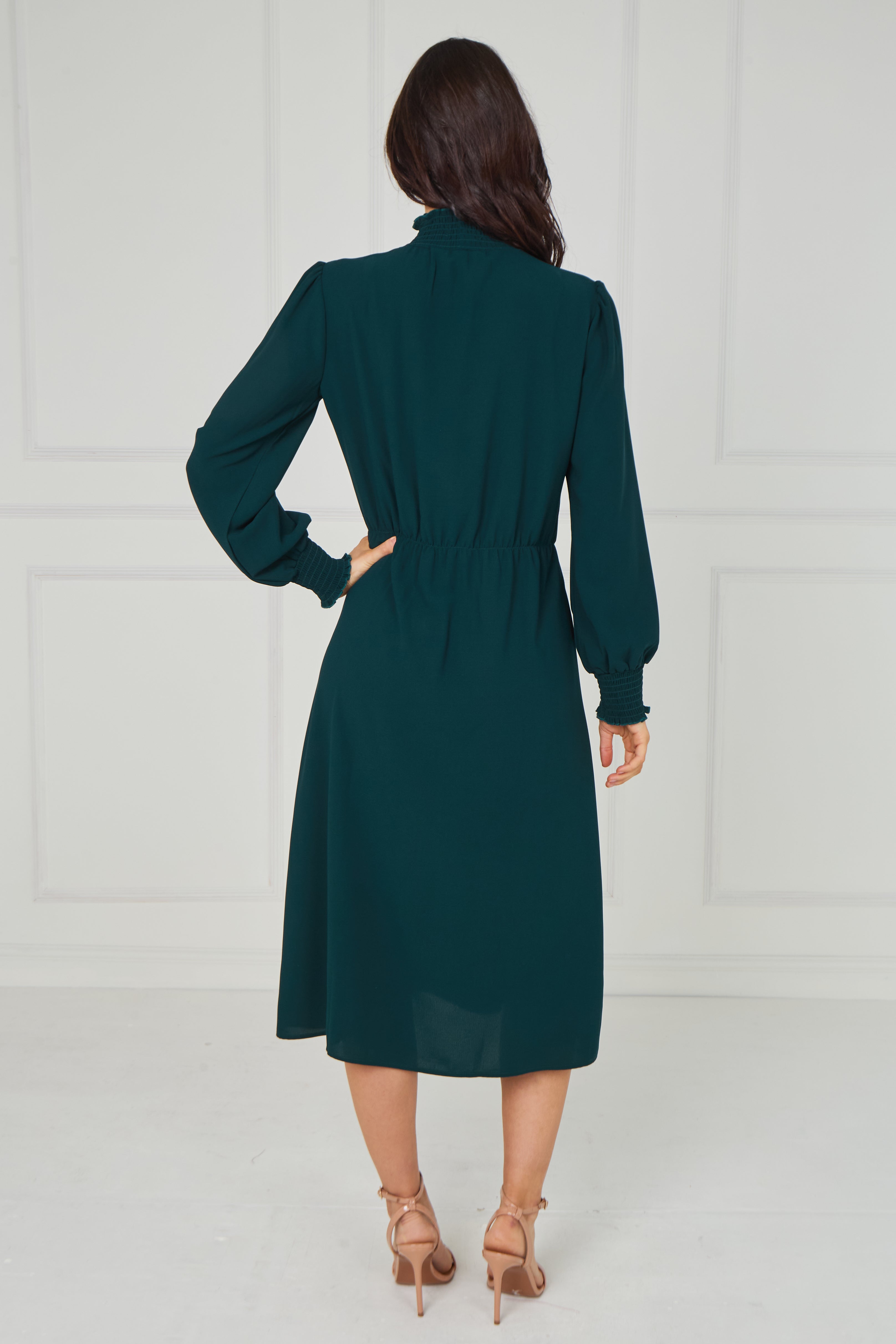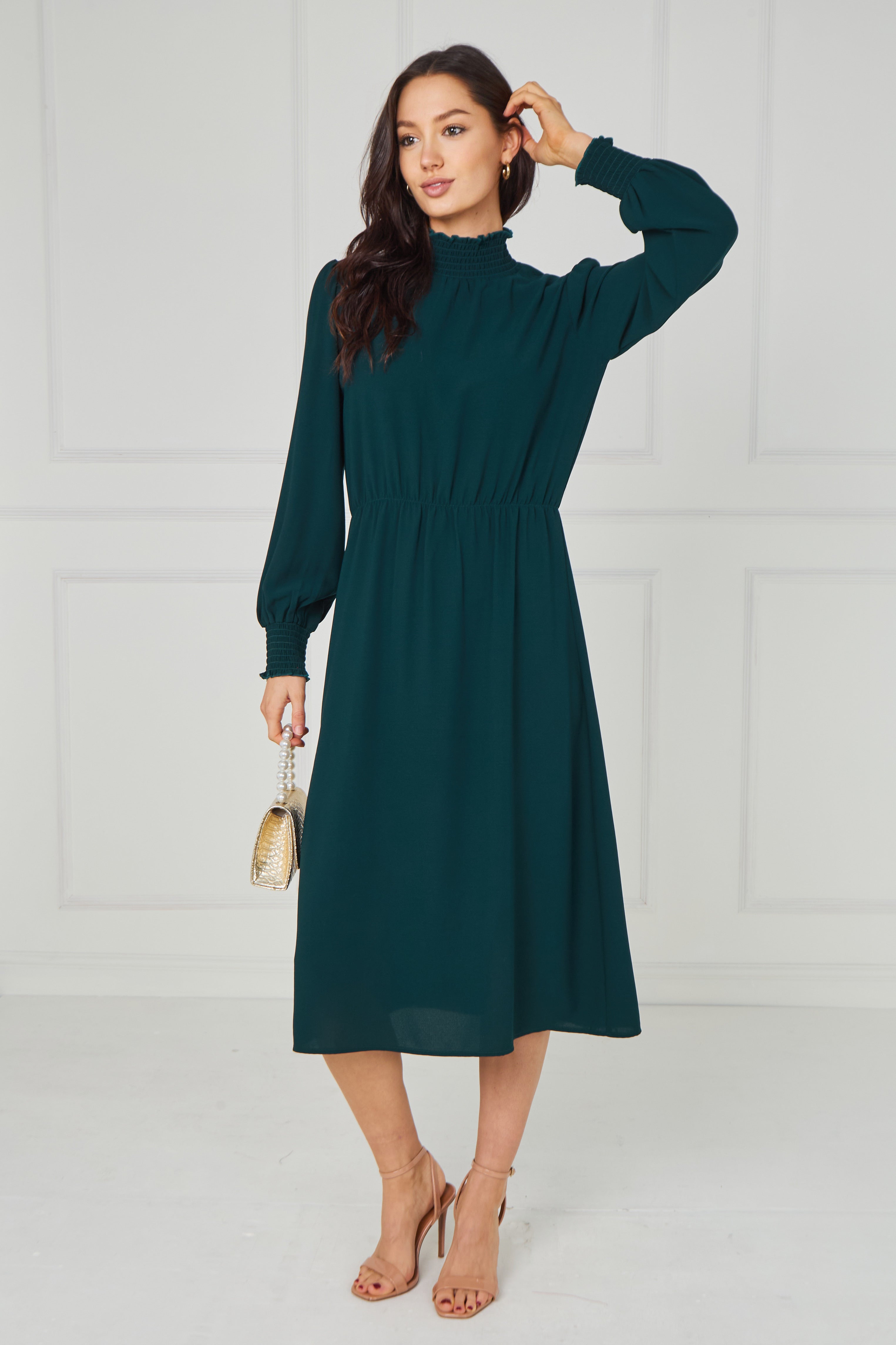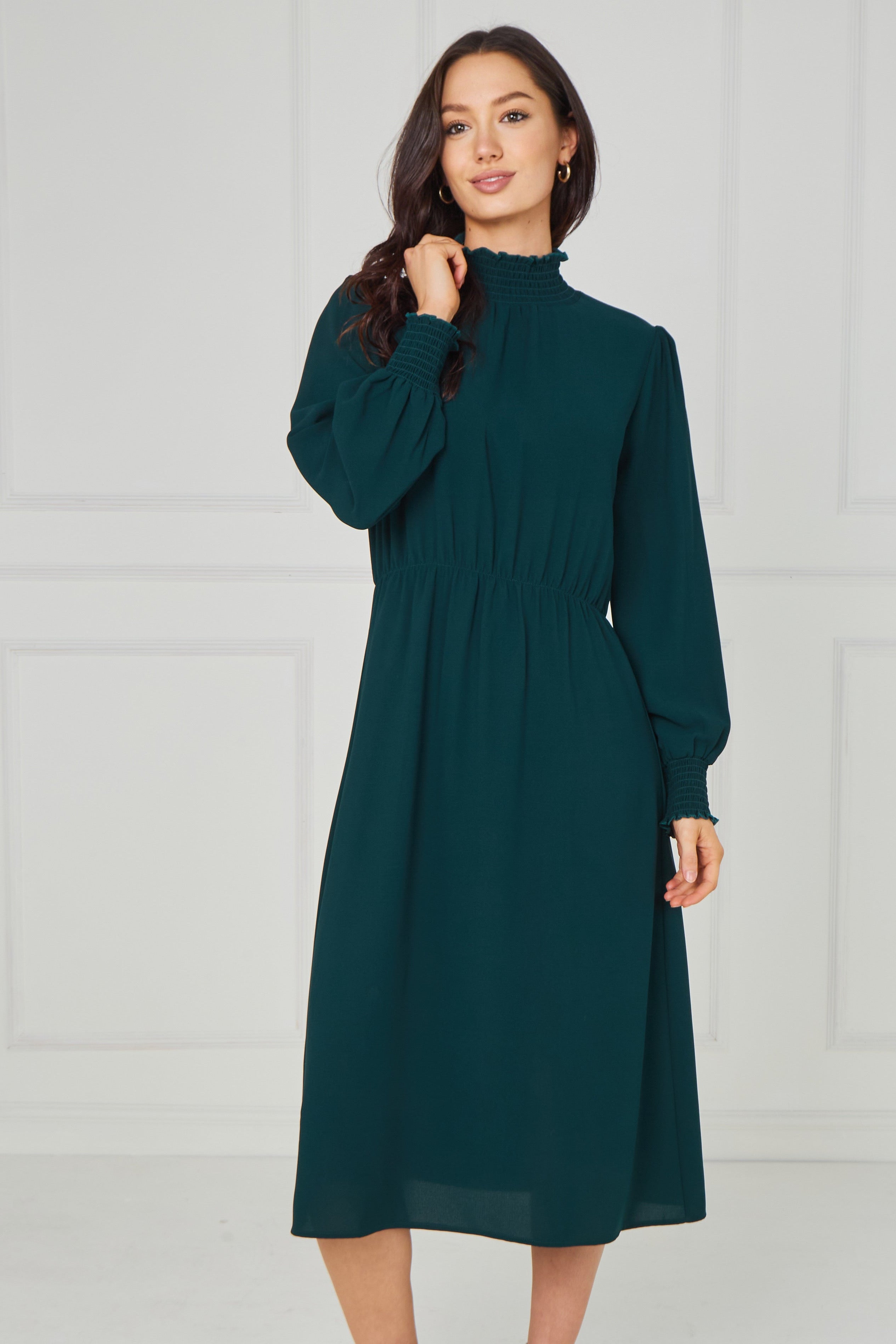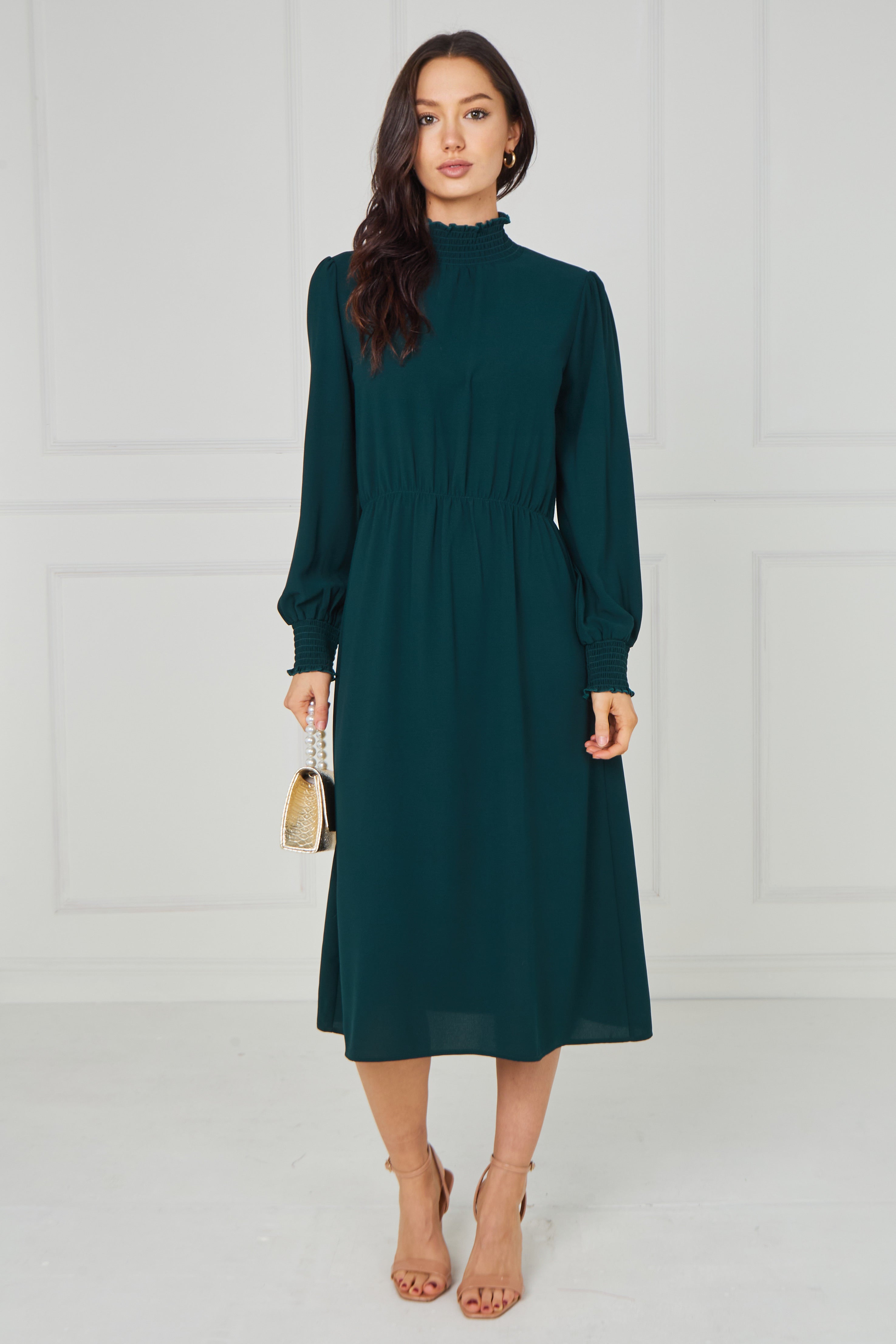 Timeless and effortlessly sophisticated, this Emerald Green Shirred High Neck Midaxi Dress is a refined addition to your wardrobe. Designed in a rich emerald green hue, it features a delicate shirred high neckline and softly gathered long sleeves with elasticated cuffs for an elegant, feminine finish. The gently elasticated waist enhances the silhouette while ensuring comfortable all-day wear, and the flowing midaxi-length skirt creates graceful movement with every step. Perfect for special occasions, evening events, workwear, or elevated everyday styling, this versatile piece pairs beautifully with heels or boots.