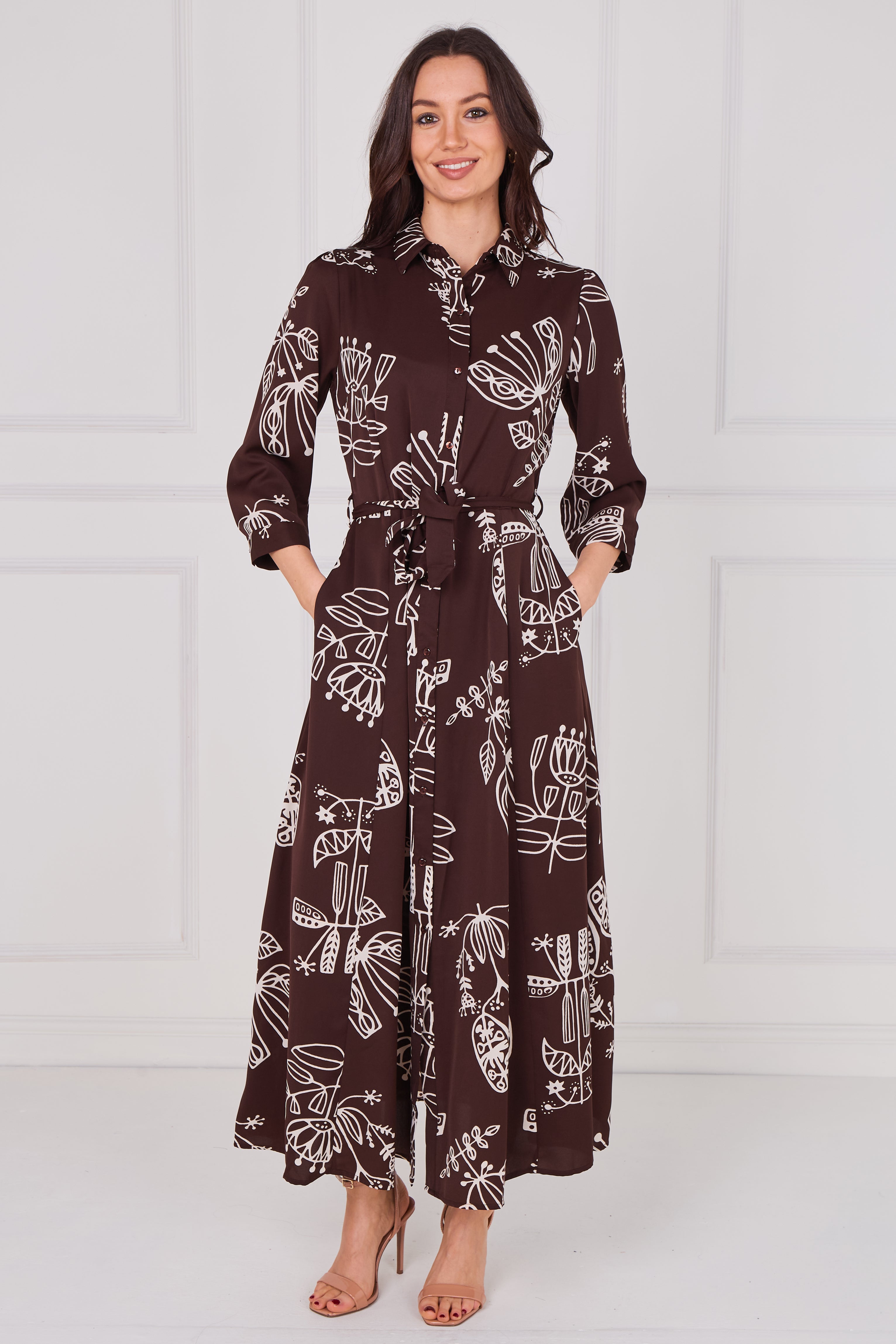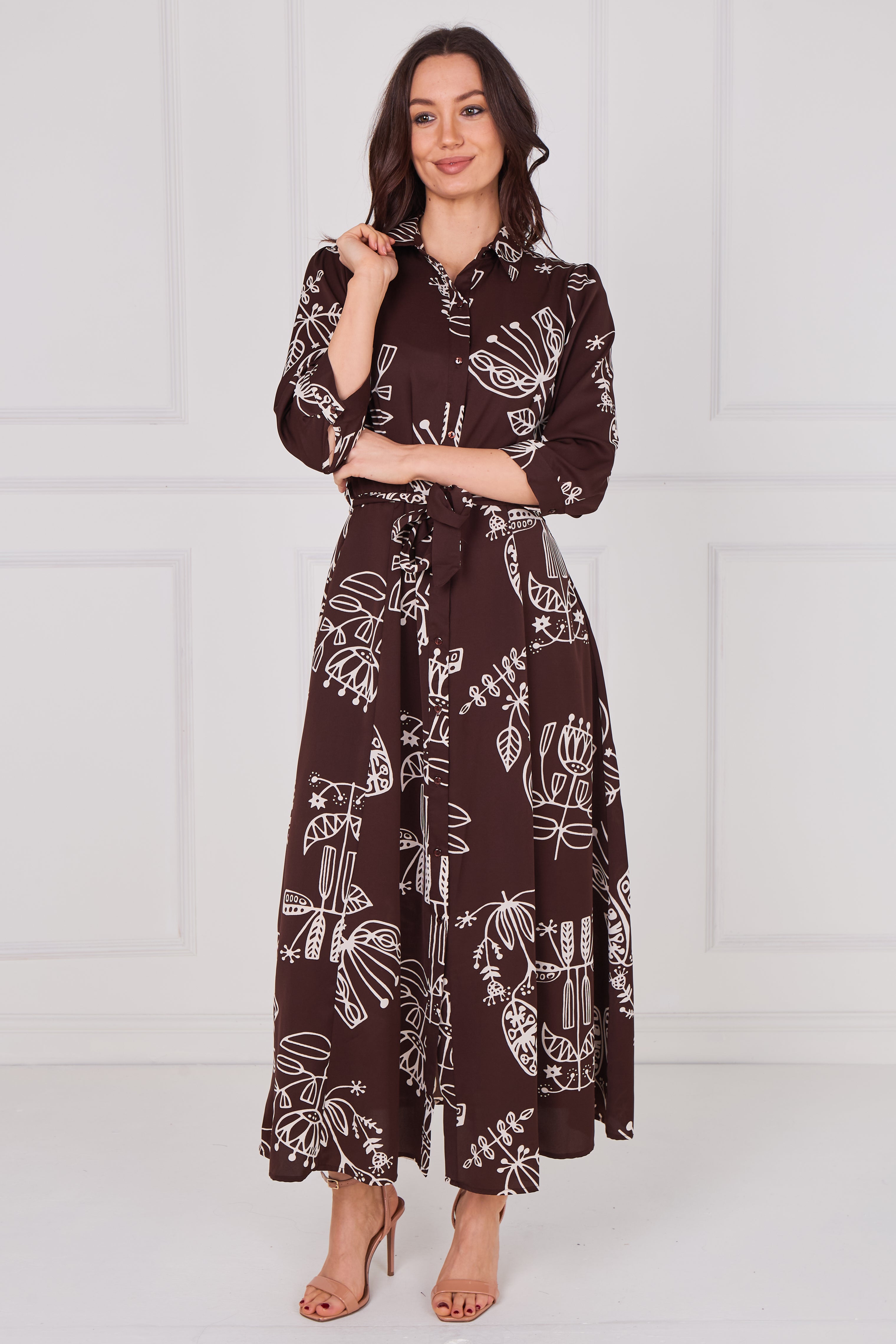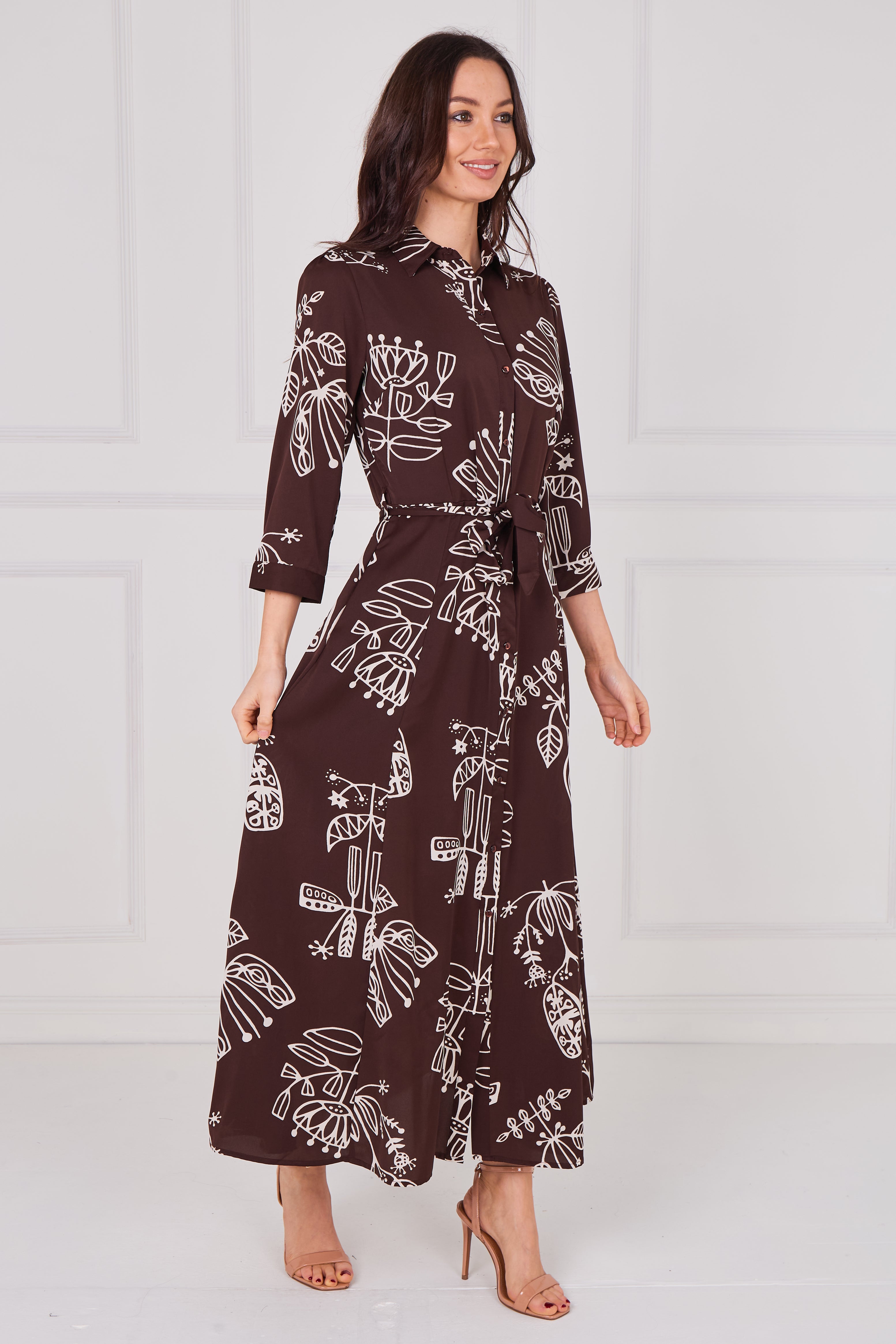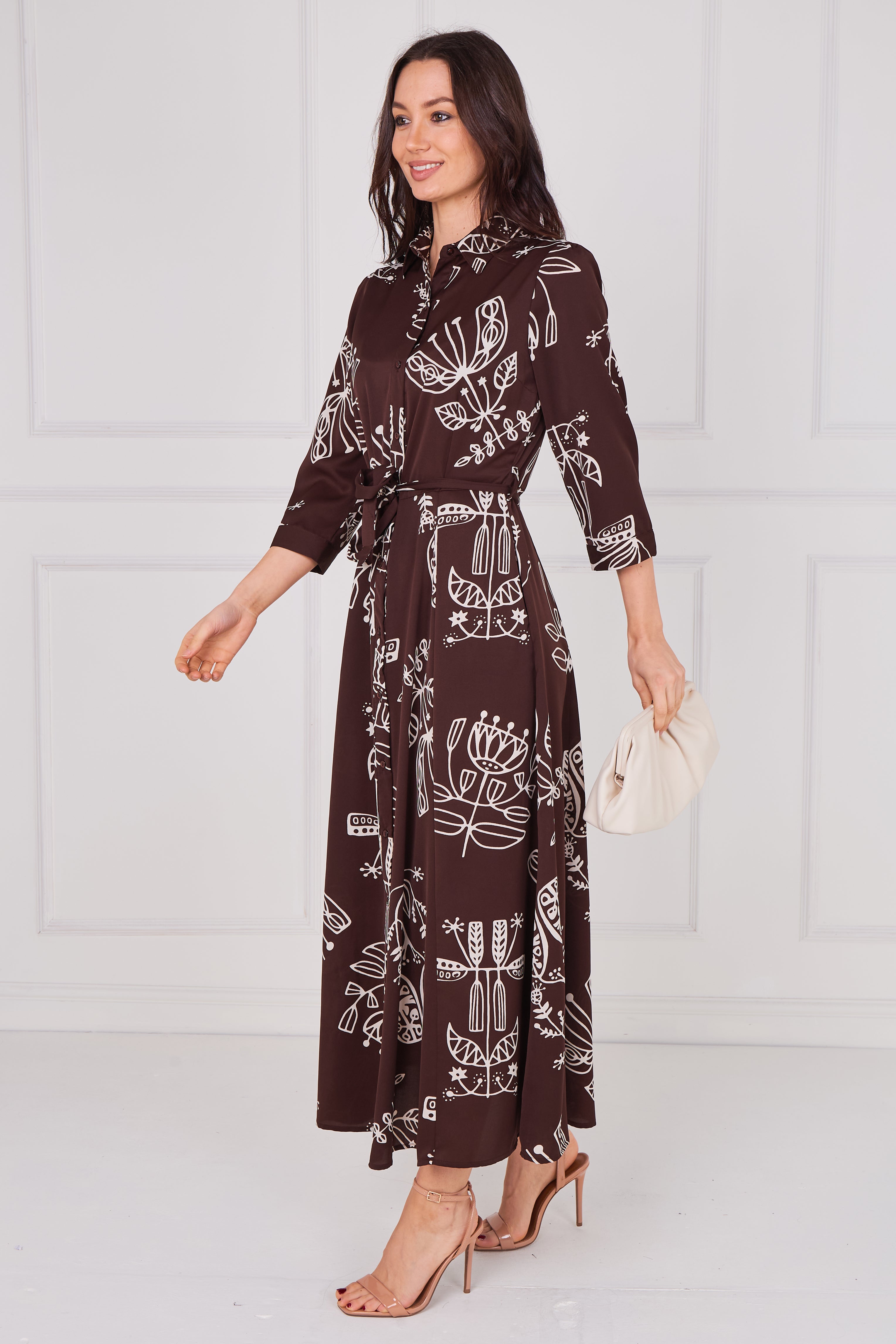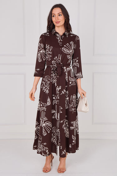 This is a refined statement piece designed in a rich espresso brown base with contrasting ivory artisan-inspired botanical print for a modern yet timeless look. Featuring a classic shirt collar, full button-through front, three-quarter length sleeves, and a detachable waist tie belt to create a flattering silhouette, this elegant midaxi dress blends tailored structure with effortless movement. The lightweight fabric drapes beautifully, making it perfect for workwear, elevated daytime styling, dinner dates, and transitional seasonal occasions. Pair with nude, tan, or chocolate-toned heels for a polished outfit that feels sophisticated, confident, and contemporary.