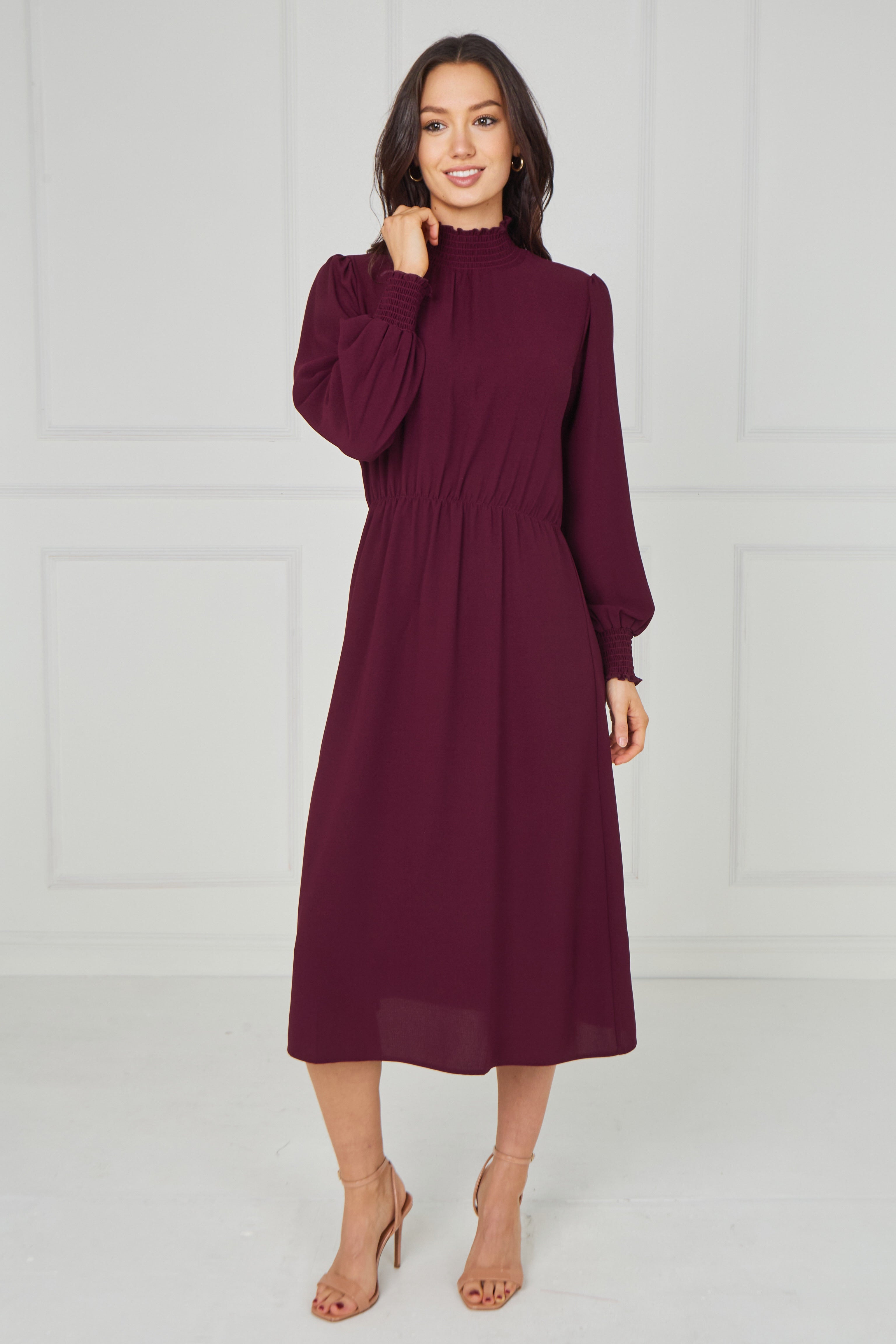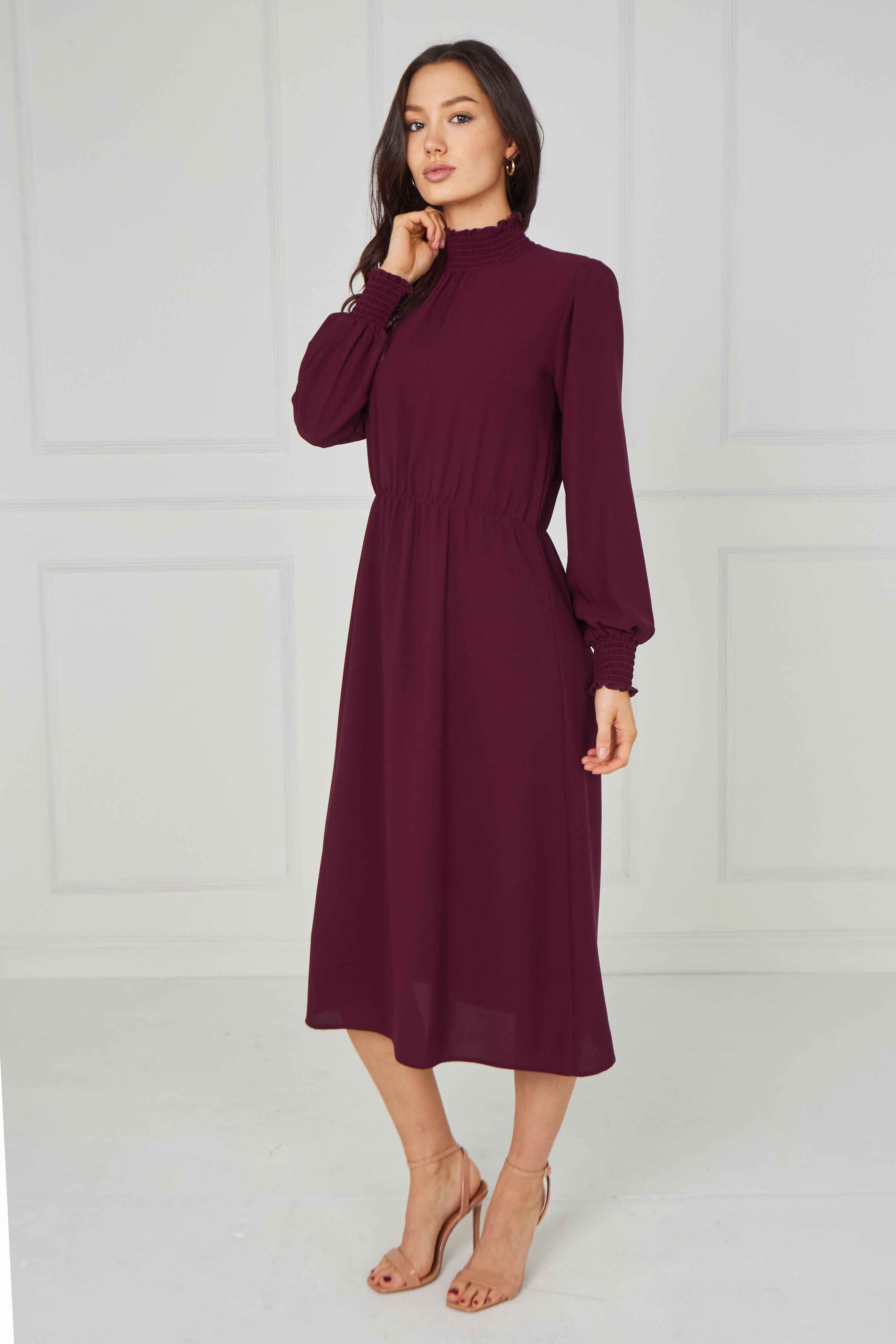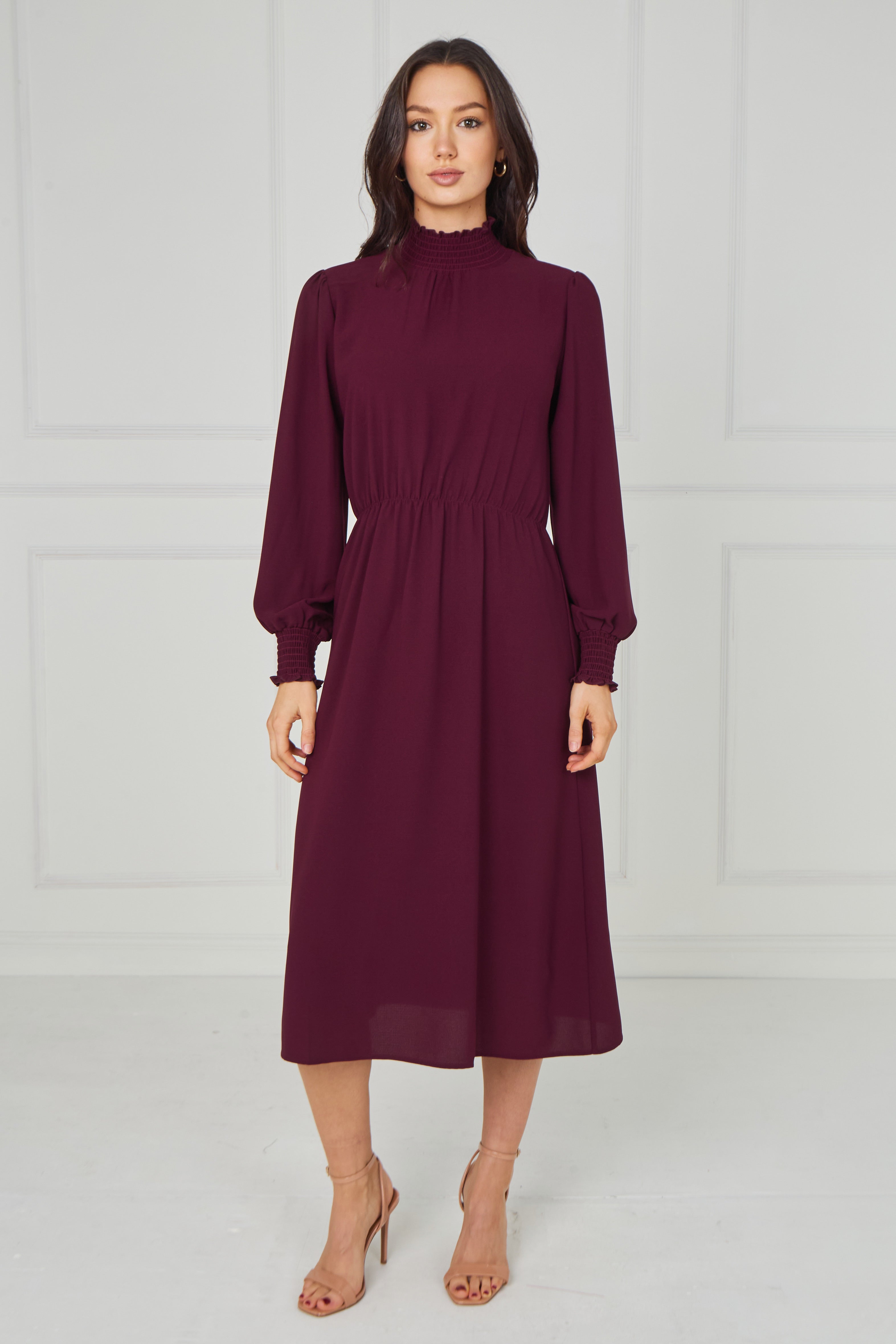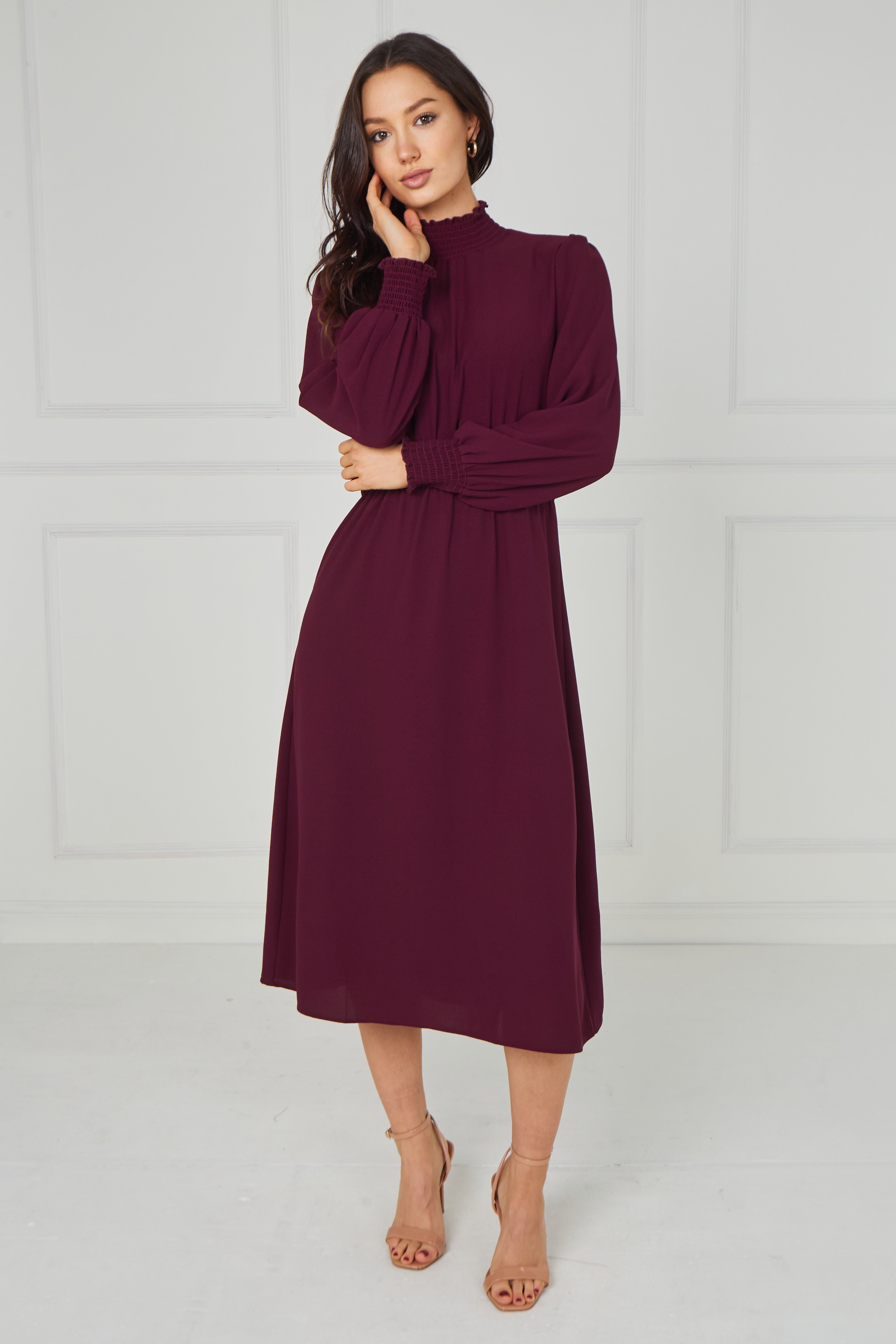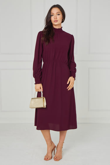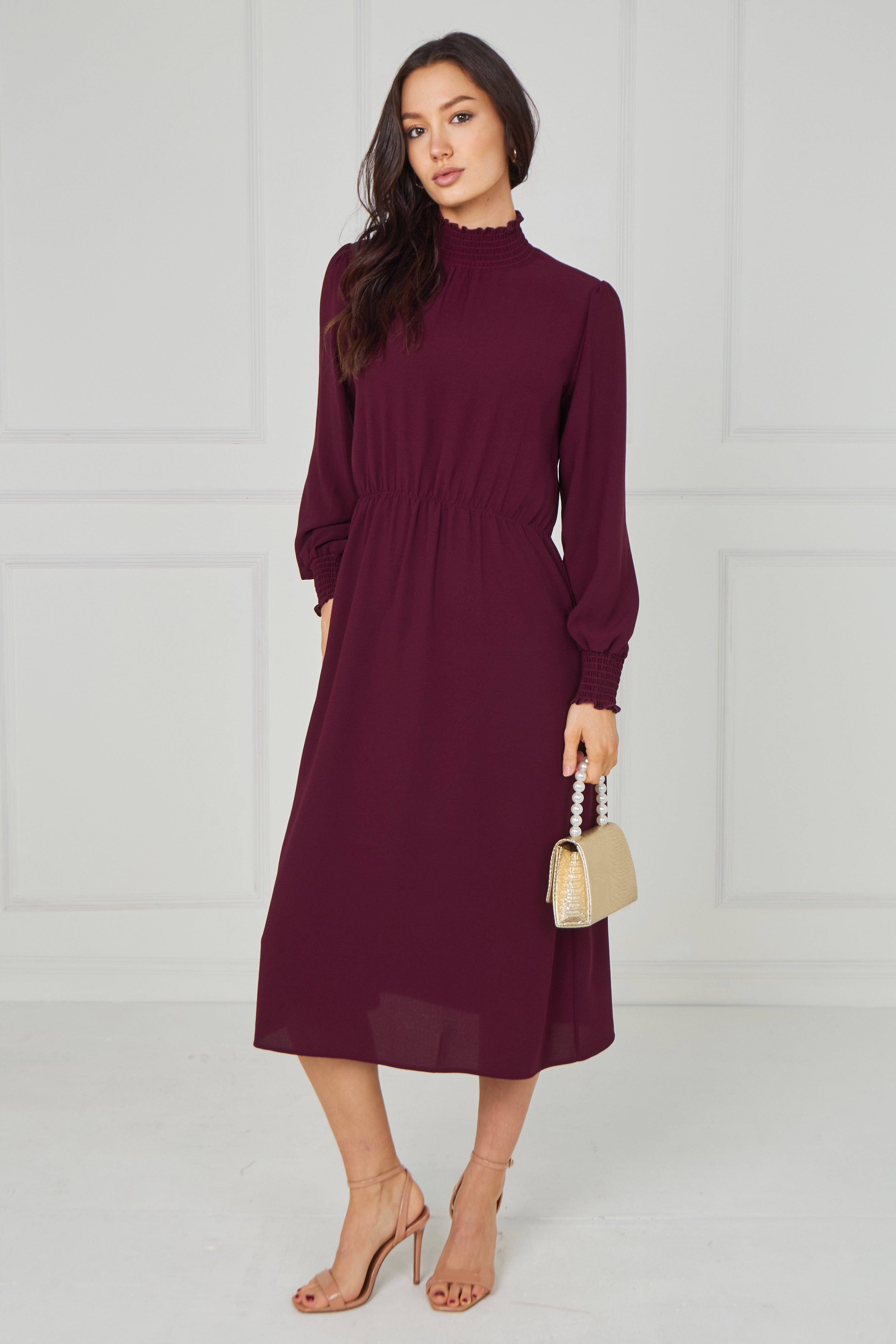 Rich, refined, and quietly striking, this Merlot High Neck Midaxi Dress is all about understated impact. Cut in a deep wine-toned shade, it features a softly shirred neckline and matching cuff detail that add subtle texture without overpowering the silhouette. The gently gathered waist creates shape while maintaining a fluid drape through the skirt, giving it an effortless, elongated feel. Falling to a flattering midaxi length, it moves beautifully and transitions seamlessly from daytime polish to evening sophistication. Style with minimal heels and gold accents for a clean, confident finish.