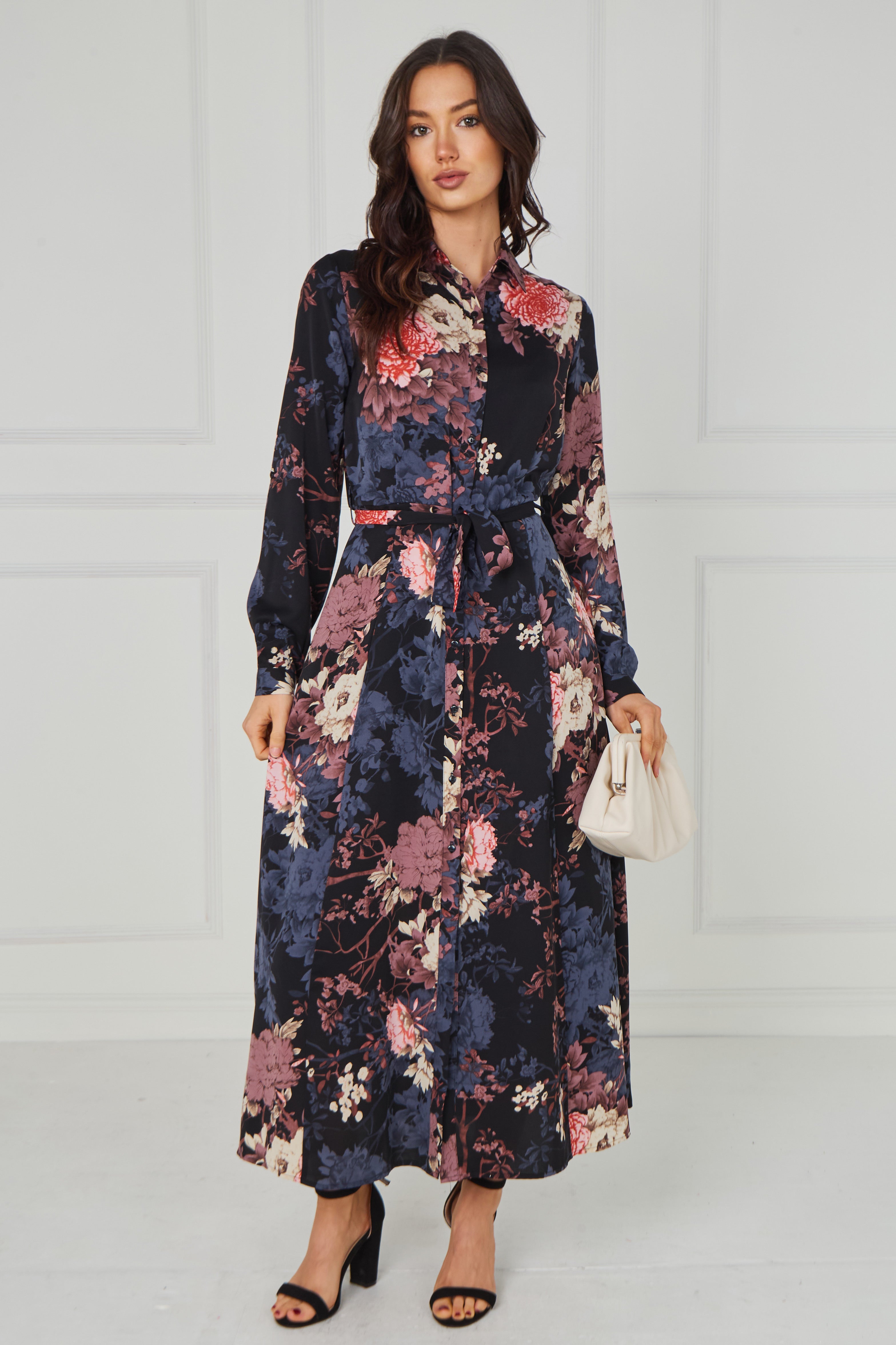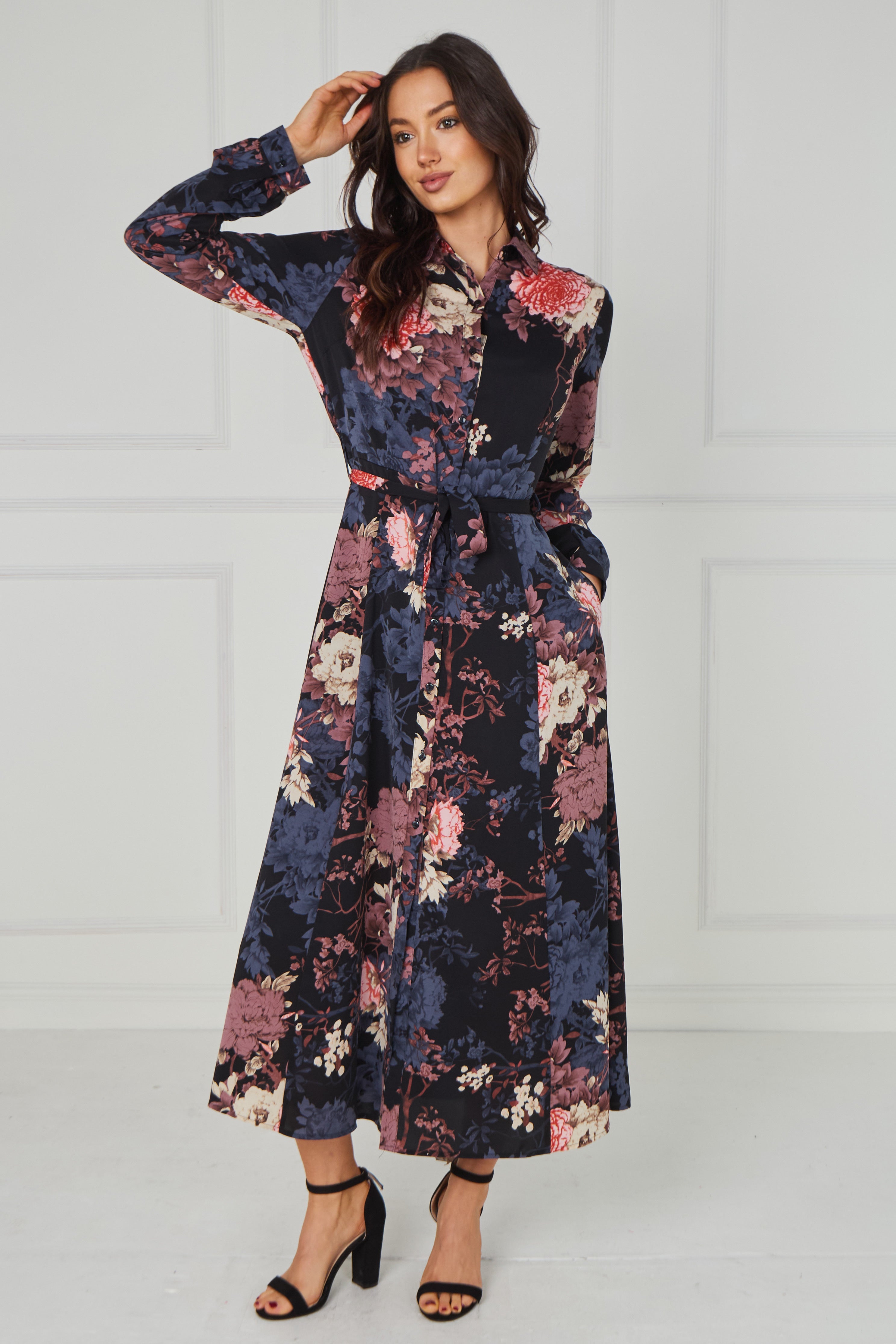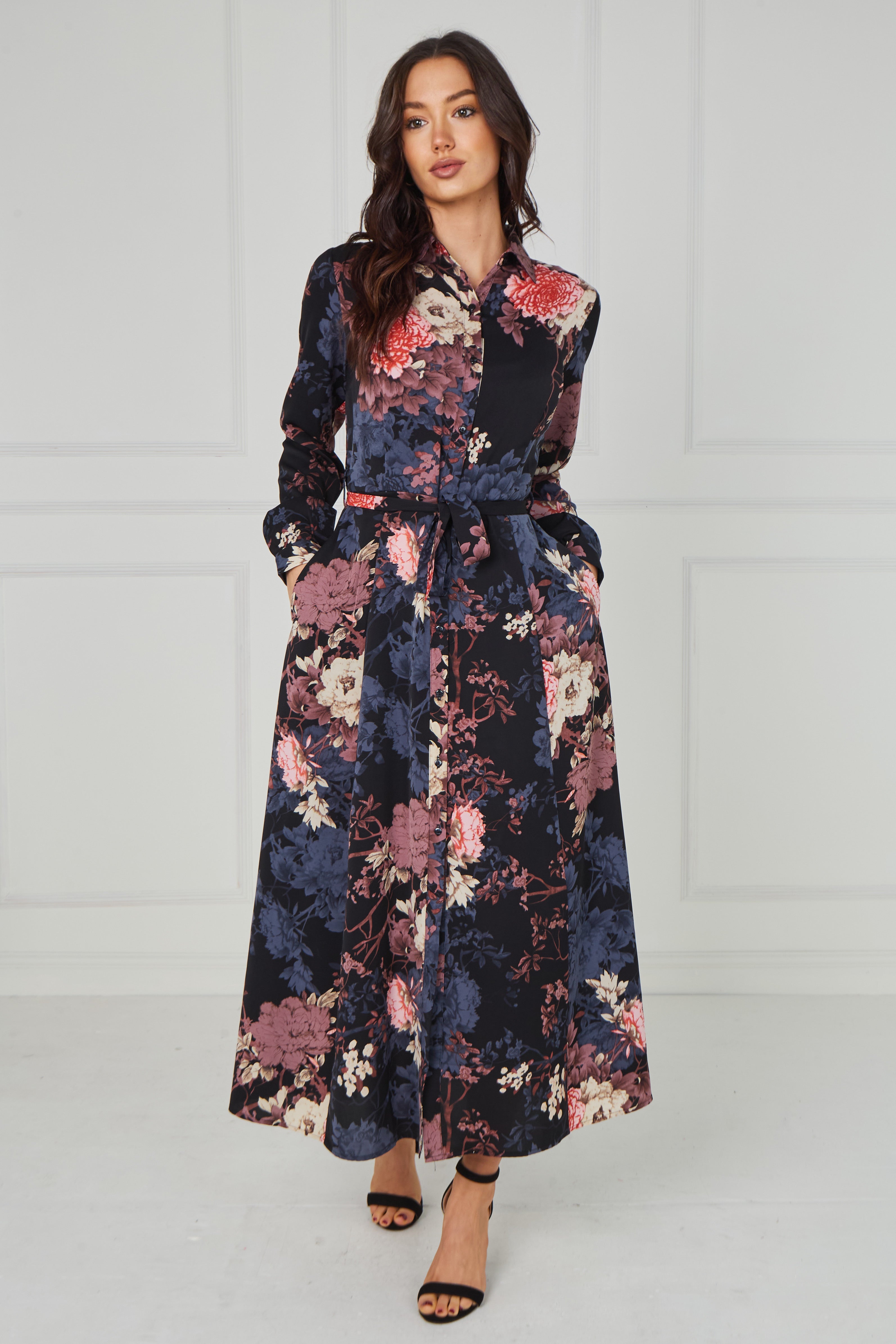 Elegant and timeless, the Navy Vintage Bloom Printed Maxi Shirt Dress features a deep navy base adorned with romantic floral prints in soft blush, dusty rose, muted blue, and warm ivory tones. Designed with a classic shirt collar, button-through front, and long sleeves, it offers a refined yet effortless silhouette. The self-tie waist belt enhances the shape, while the flowing maxi-length skirt creates graceful movement with every step. Finished with two side pockets for added practicality, this versatile piece is perfect for both polished daytime styling and elevated evening occasions.