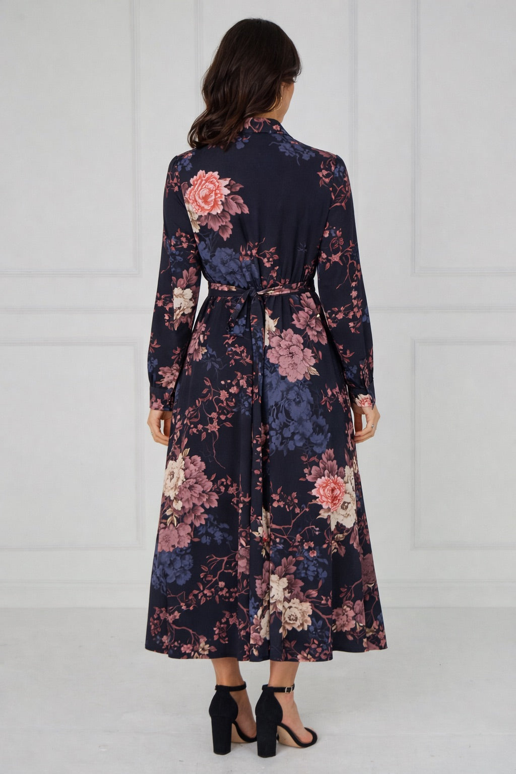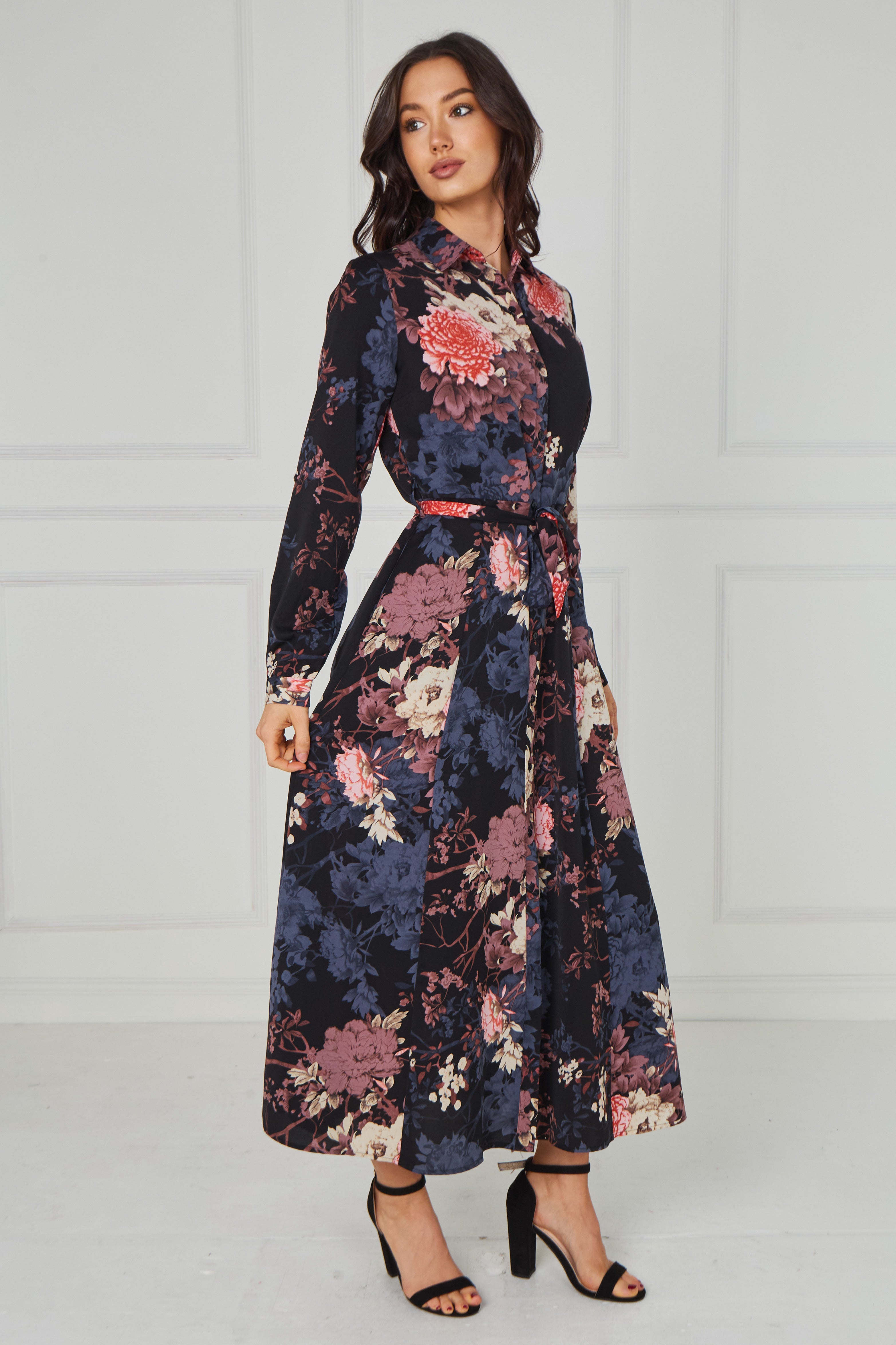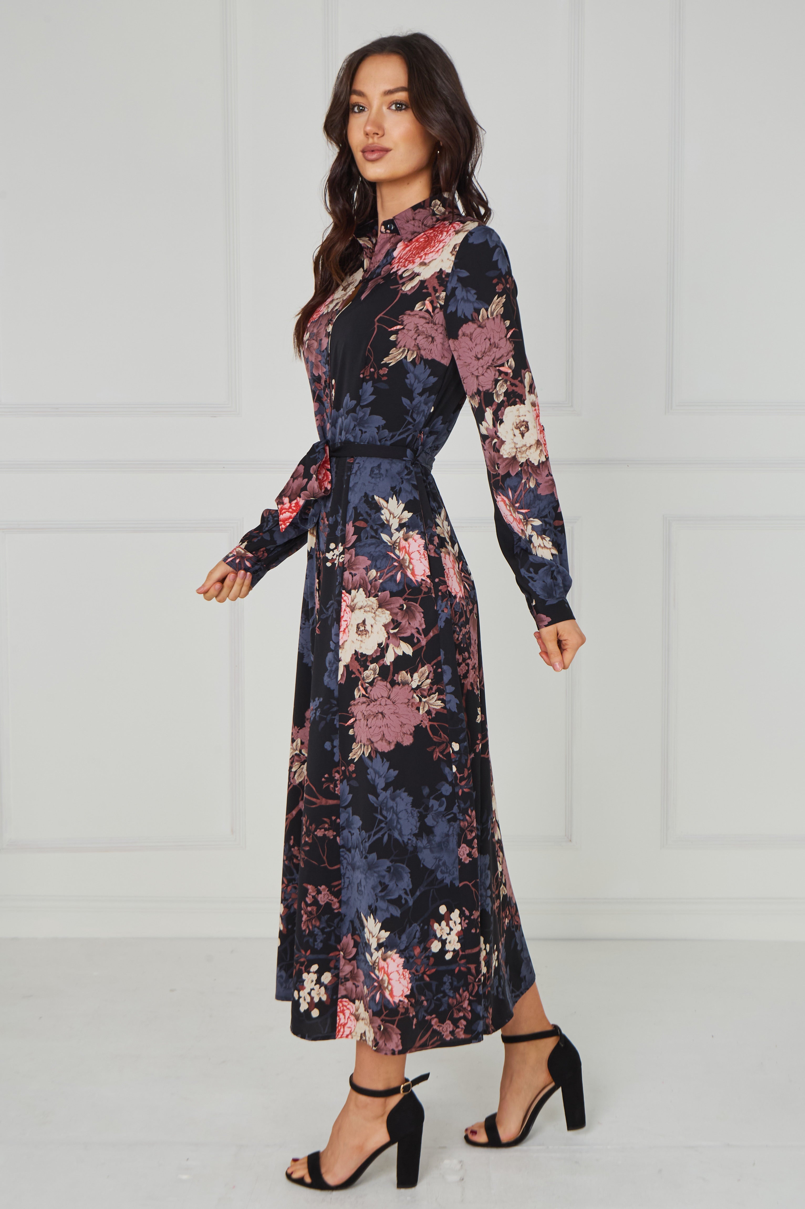 Elegant and timeless, the Navy Vintage Bloom Printed Maxi Shirt Dress features a deep navy base adorned with romantic floral prints in soft blush, dusty rose, muted blue, and warm ivory tones. Designed with a classic shirt collar, button-through front, and long sleeves, it offers a refined yet effortless silhouette. The self-tie waist belt enhances the shape, while the flowing maxi-length skirt creates graceful movement with every step. Finished with two side pockets for added practicality, this versatile piece is perfect for both polished daytime styling and elevated evening occasions.