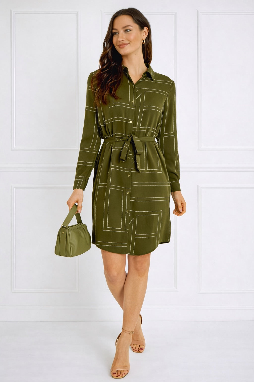 Olive Geometric Print Belted Mini Shirt Dress