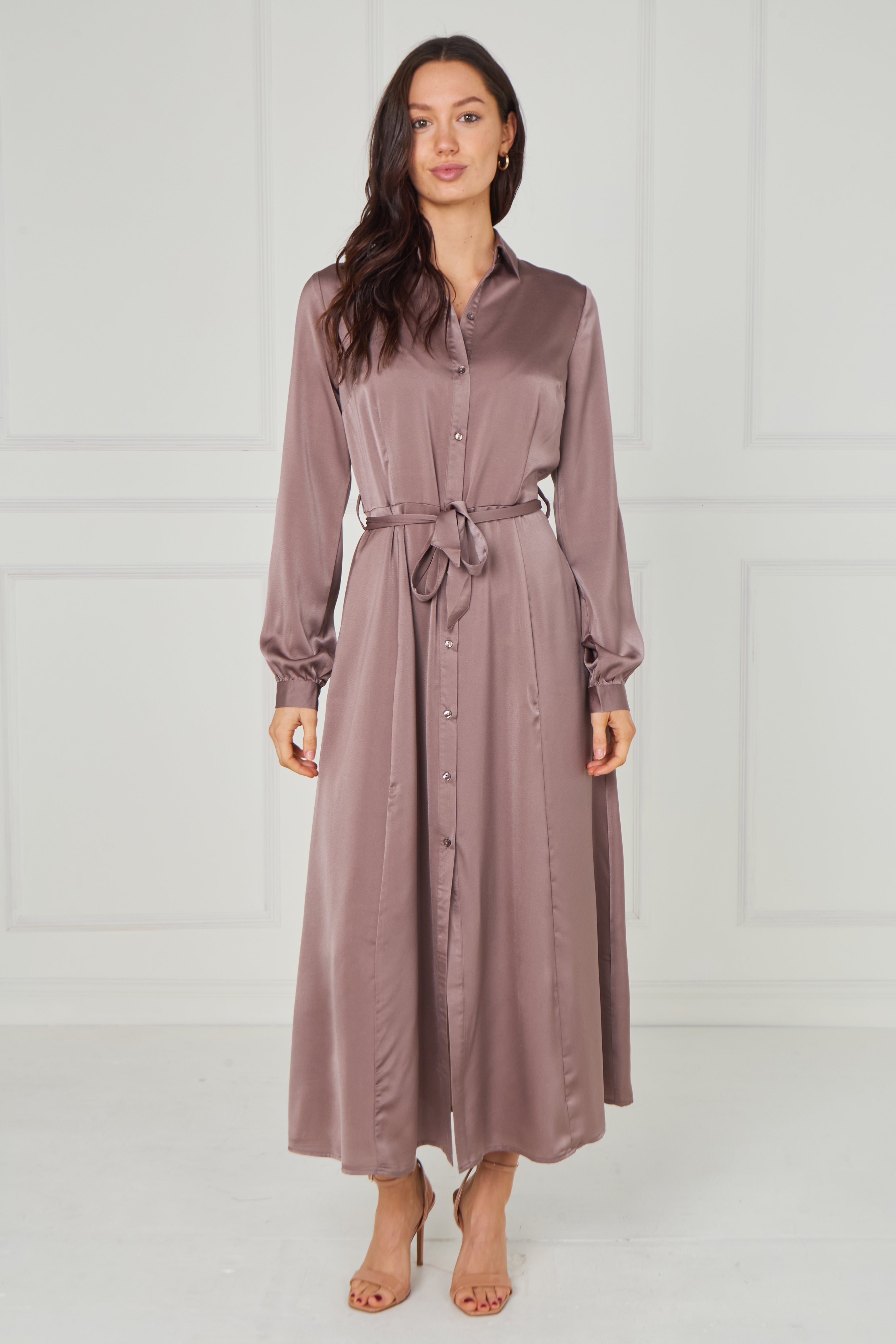 Dusty Rose Taupe Velvety Satin Maxi Shirt Dress