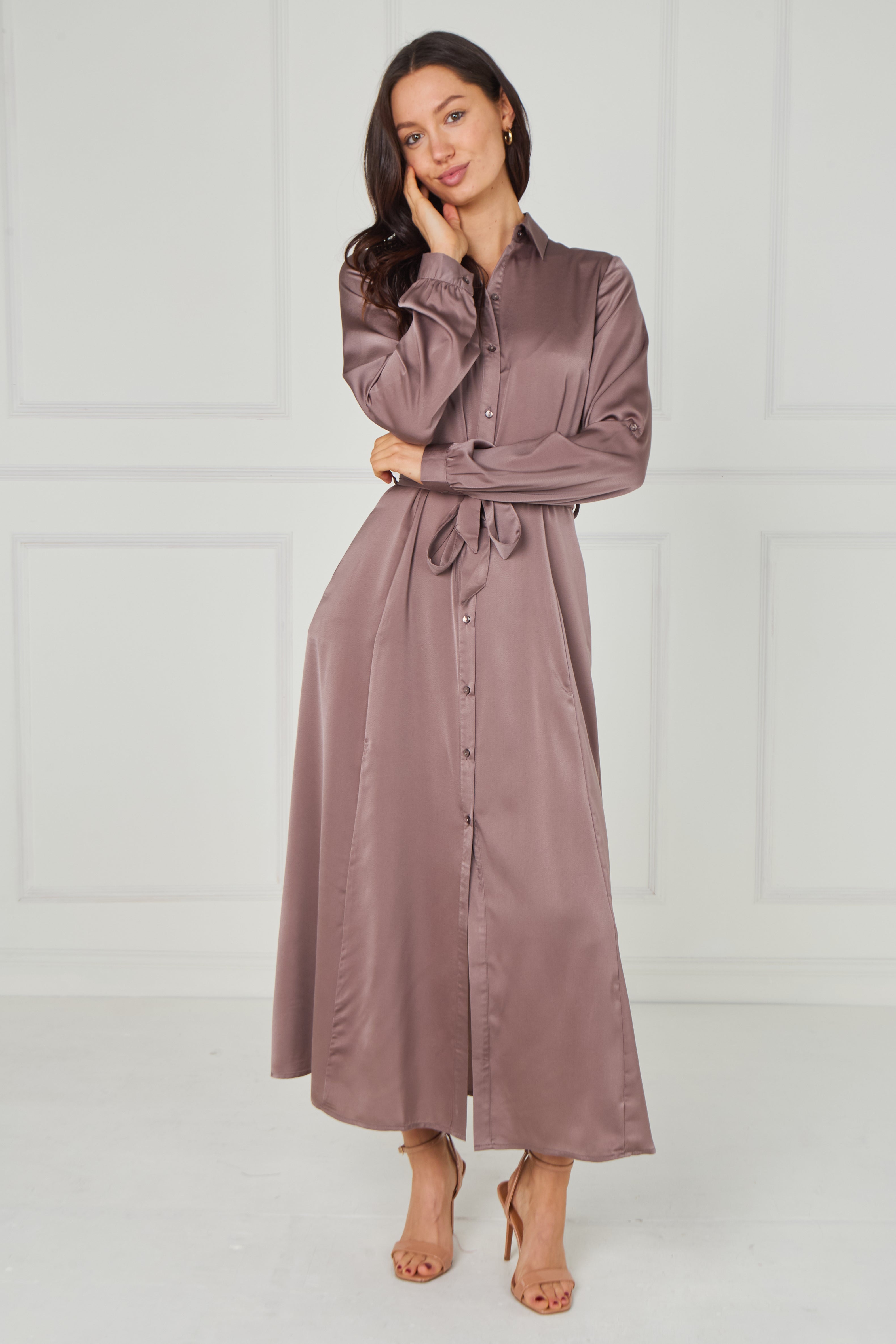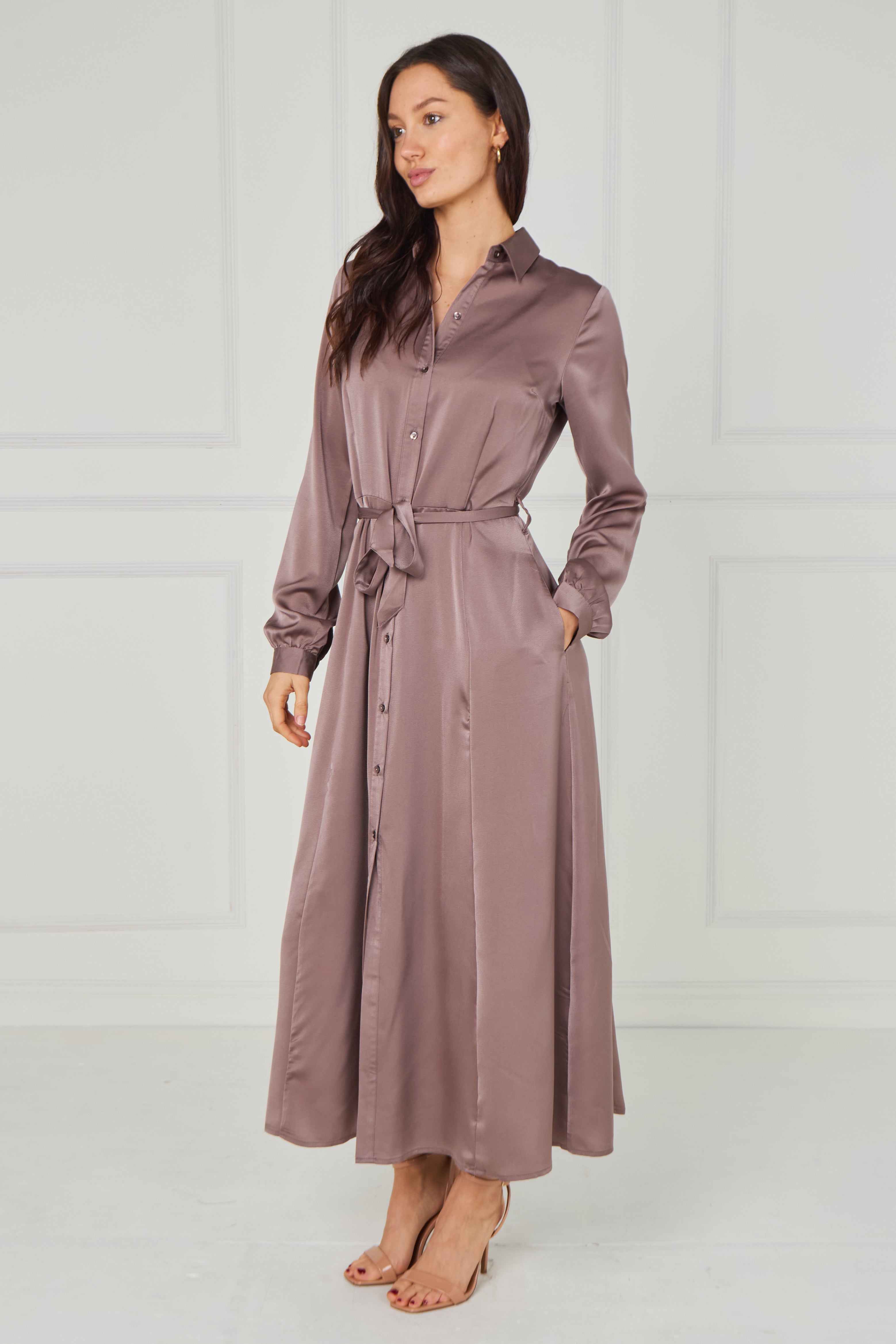 Elegant and refined, the Dusty Rose Taupe Velvety Satin Maxi Shirt Dress features a sophisticated muted taupe base with subtle dusty rose undertones, enhanced by a smooth velvety satin finish that gives a soft, light-catching sheen. Designed with a classic shirt collar, full button-through front, and long sleeves with gently gathered cuffs, it creates a timeless and flattering silhouette. The self-tie waist belt defines the waist beautifully, while the flowing maxi-length skirt drapes gracefully with movement. Finished with two side pockets for added practicality, this versatile piece transitions effortlessly from polished daytime wear to elevated evening styling.