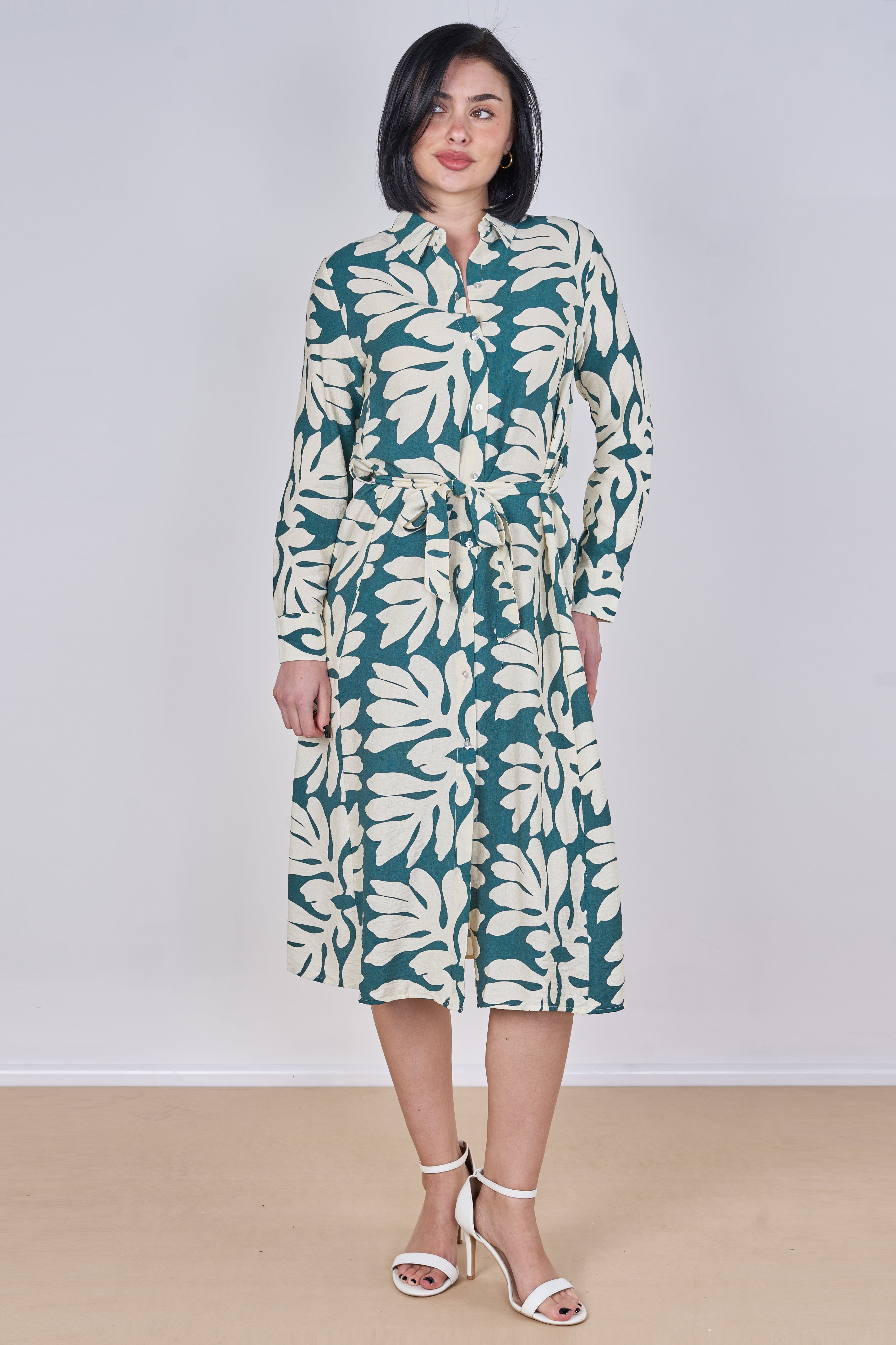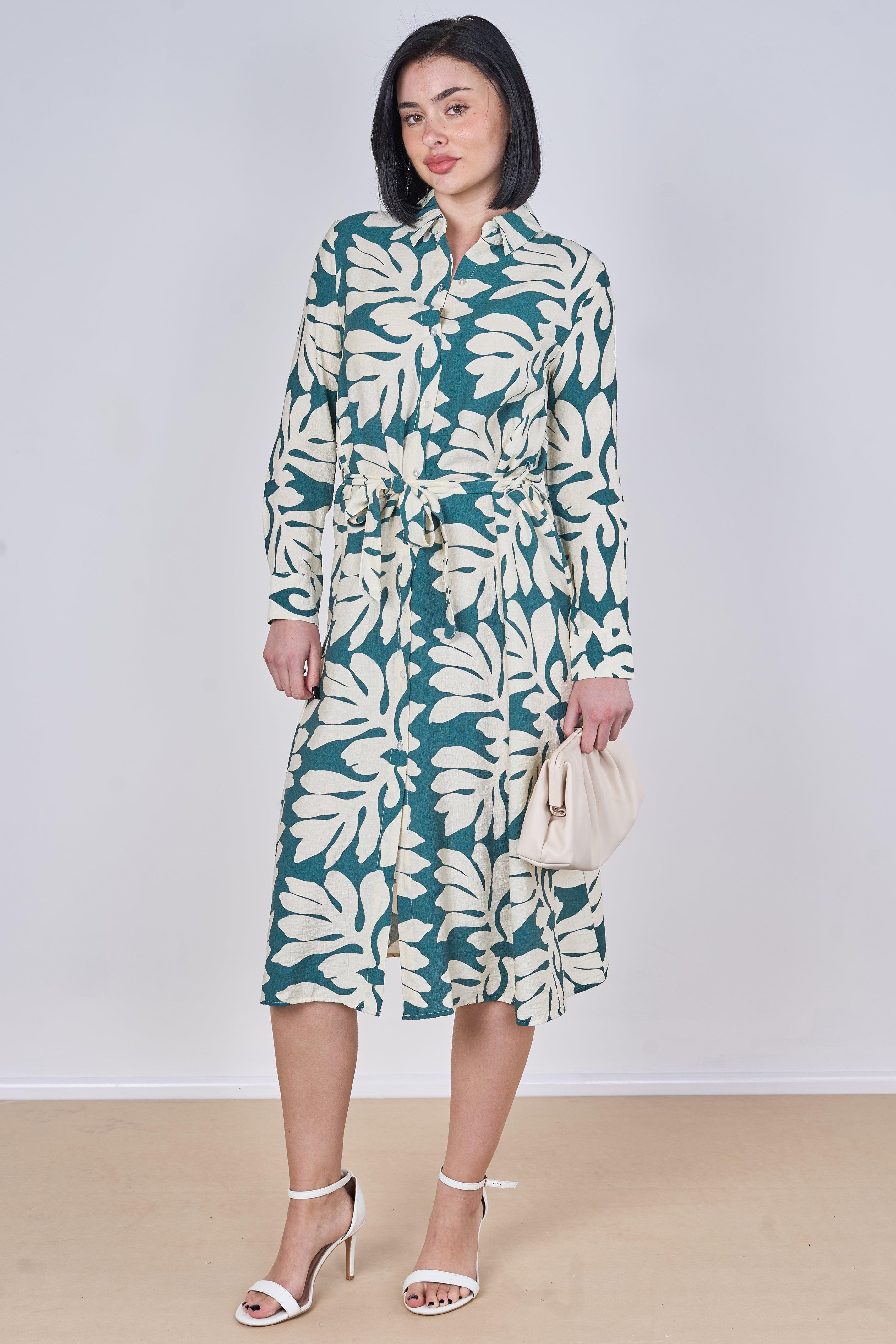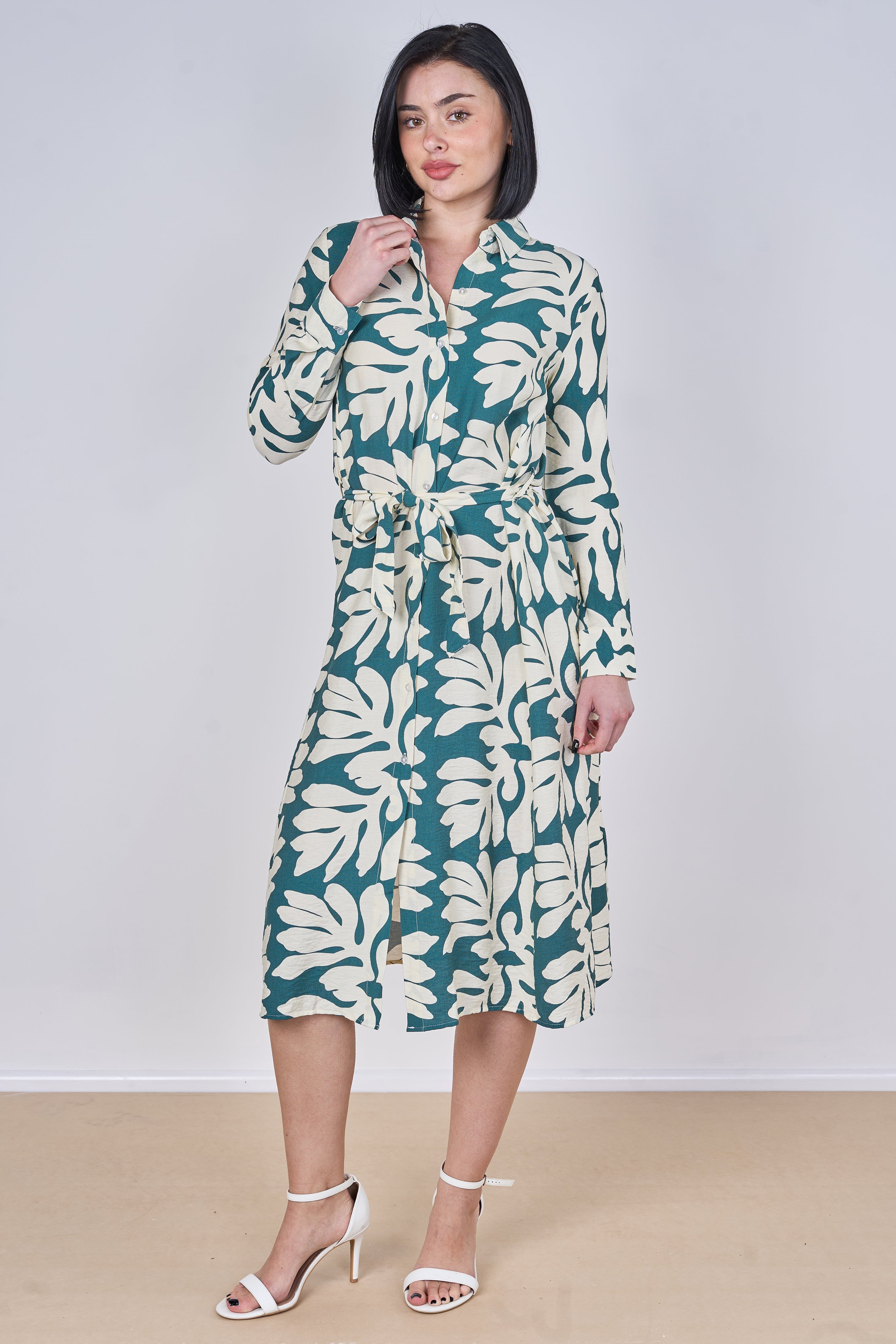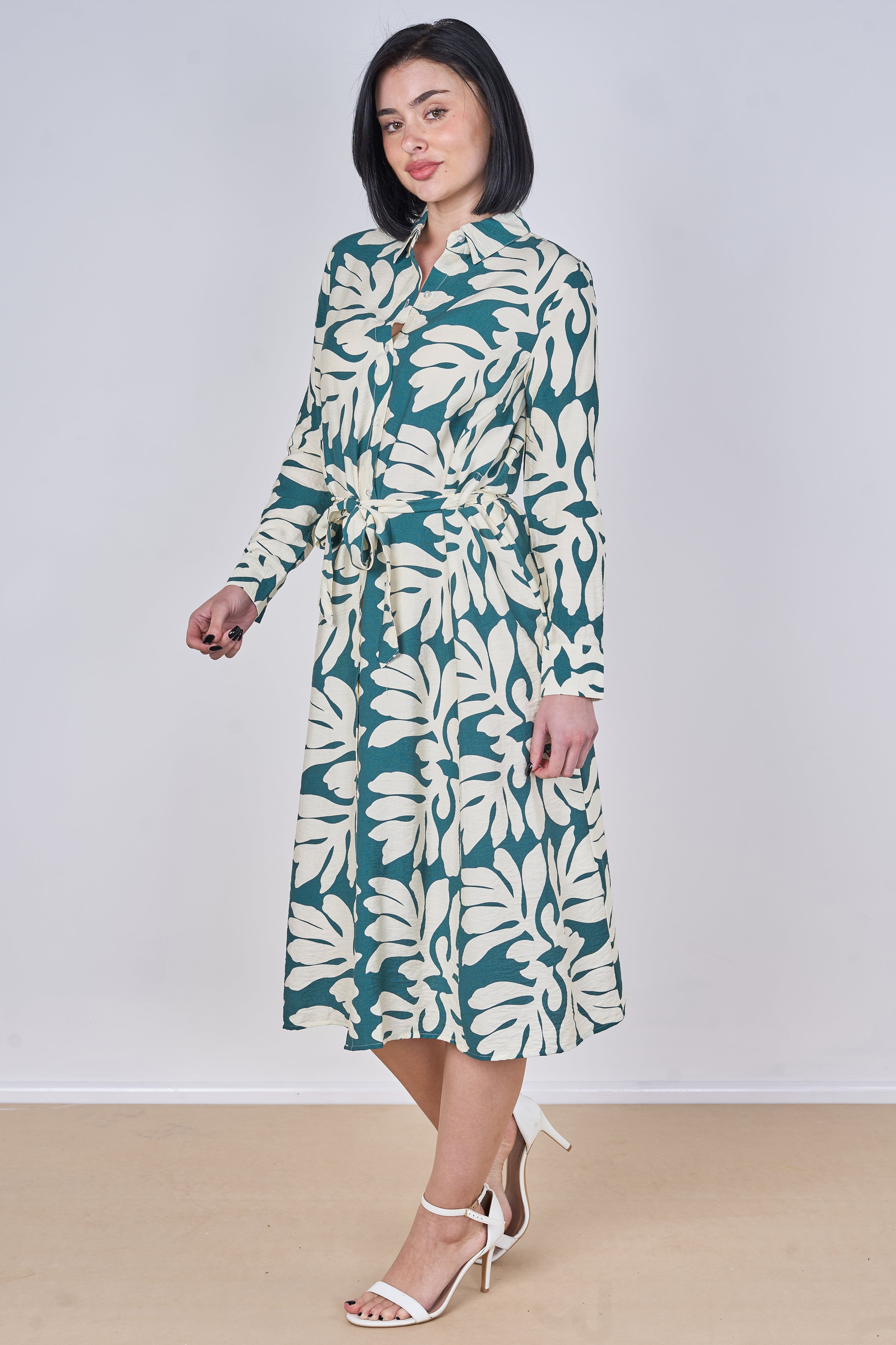 Effortlessly stylish with a fresh, nature-inspired touch, this teal leaf print belted midi shirt dress is perfect for elevating your everyday wardrobe. Featuring a classic shirt collar and button-front fastening, it is designed with an adjustable tie waist belt to create a flattering silhouette while ensuring all-day comfort. The long sleeves with buttoned cuffs and elegant midi length offer a versatile and feminine look suitable for both casual and smart occasions, while two side pockets add a practical and convenient finish. Style it with heels for a polished look or pair it with flats for an easy, relaxed outfit.