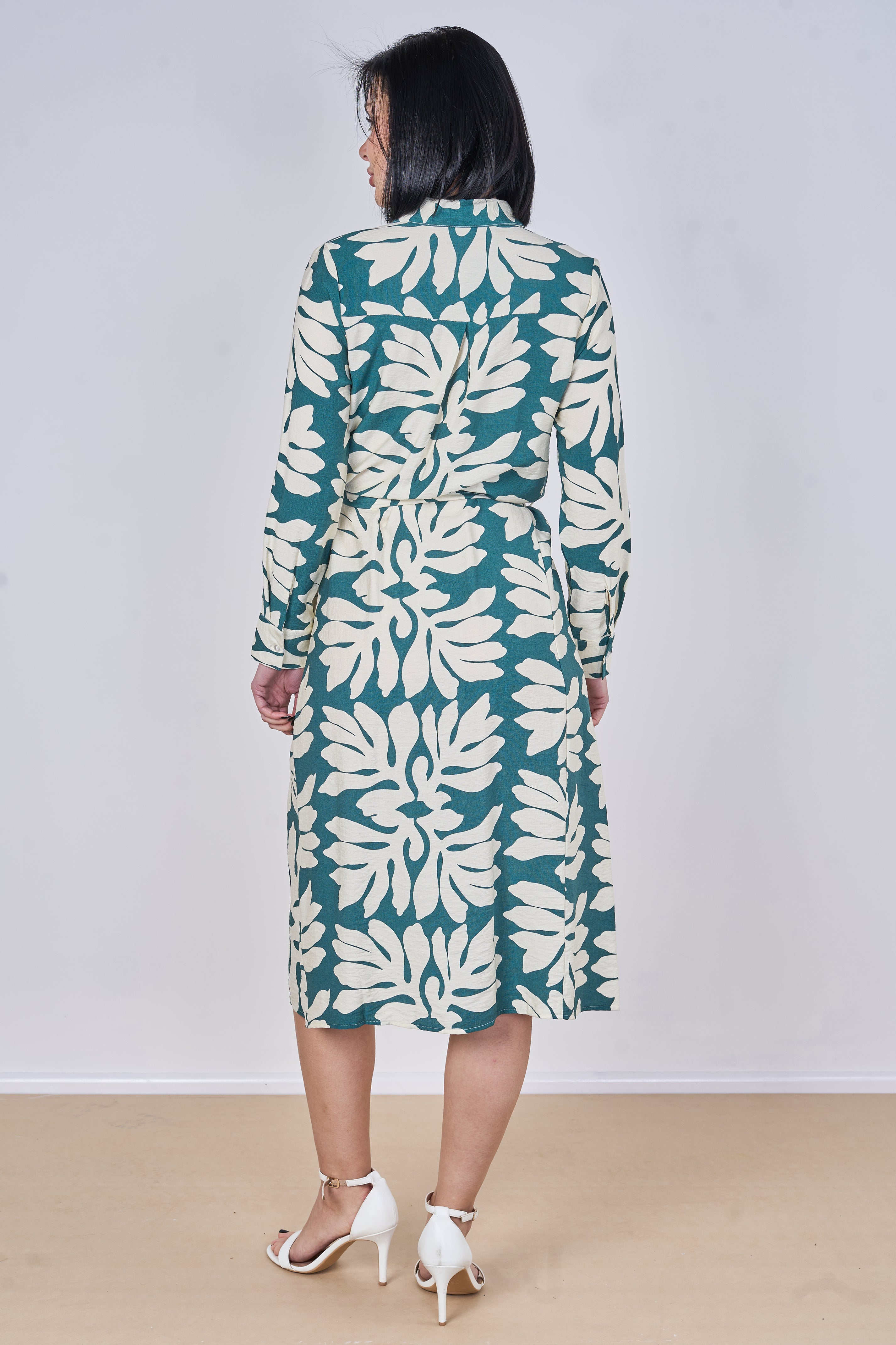 Teal Leaf Print Belted Midi Shirt Dress