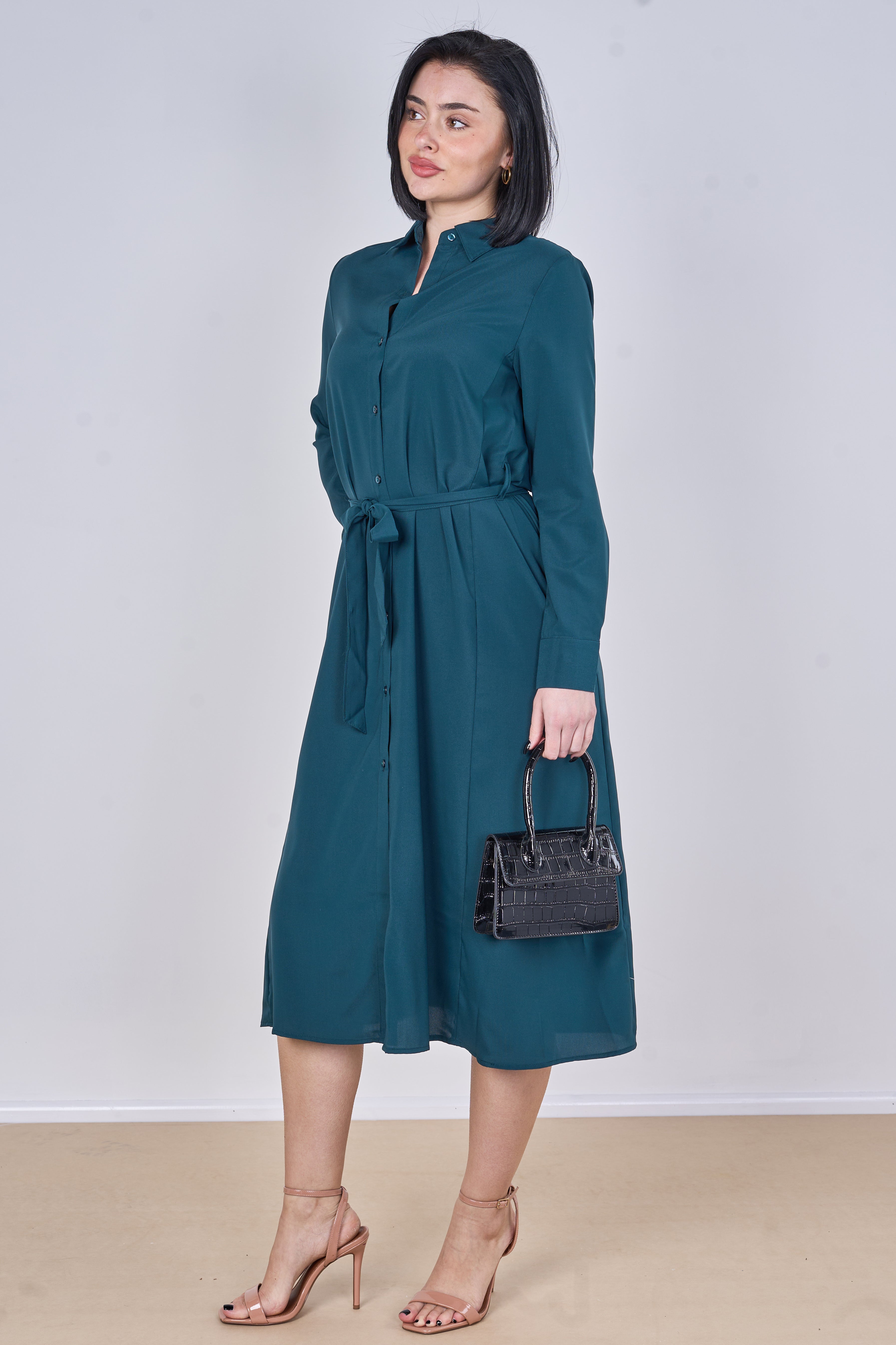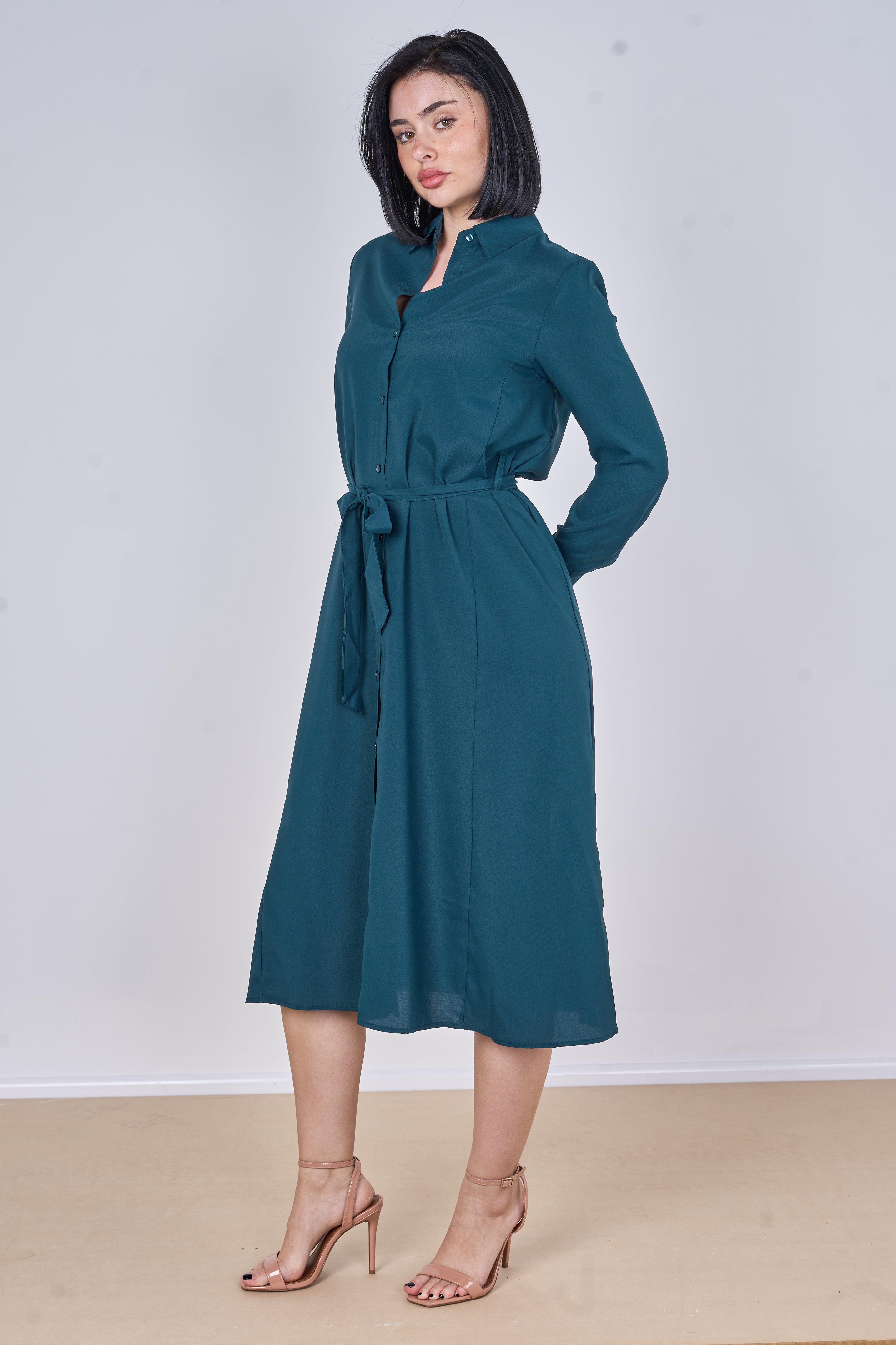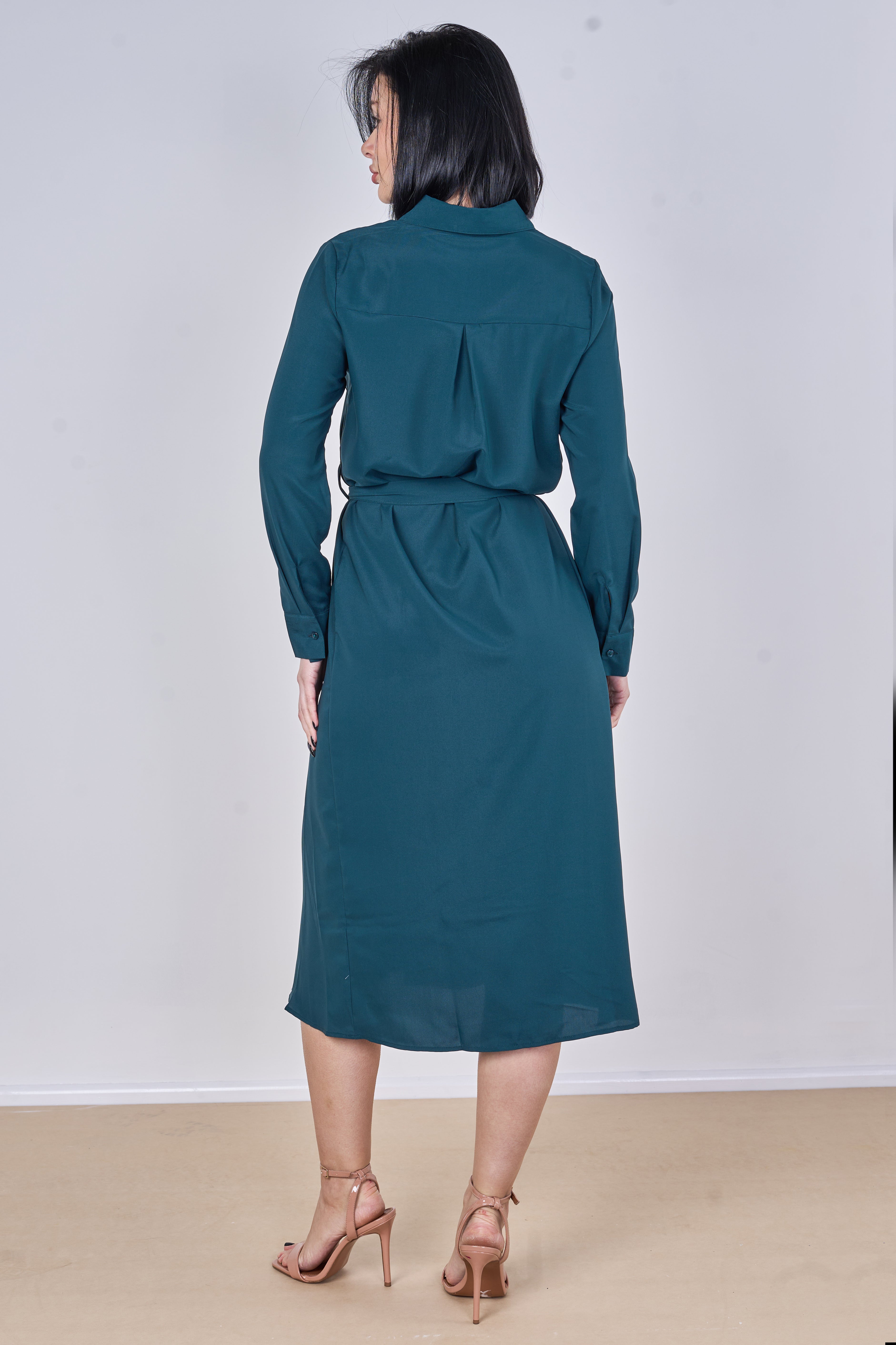 Teal Plain Belted Midi Shirt Dress