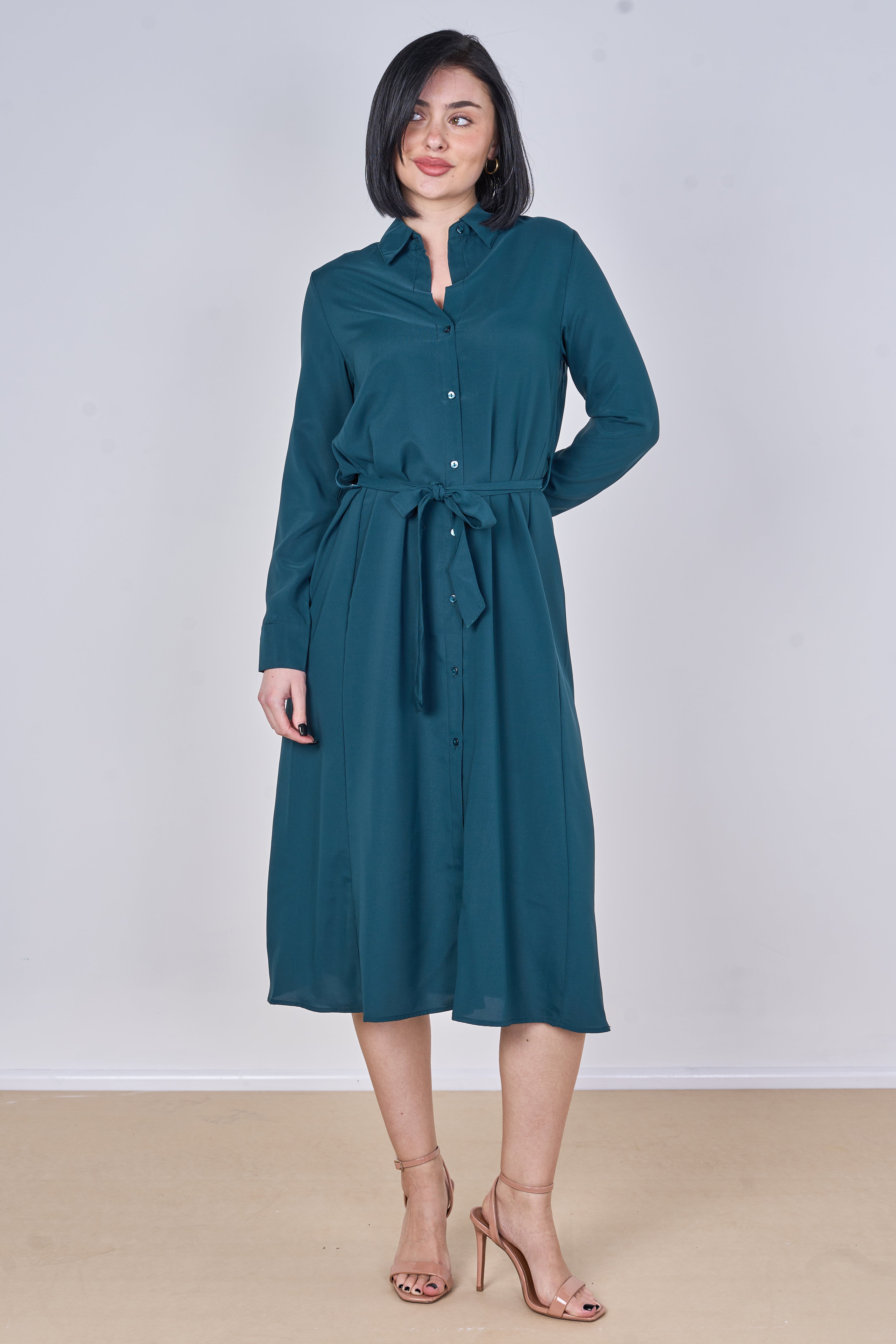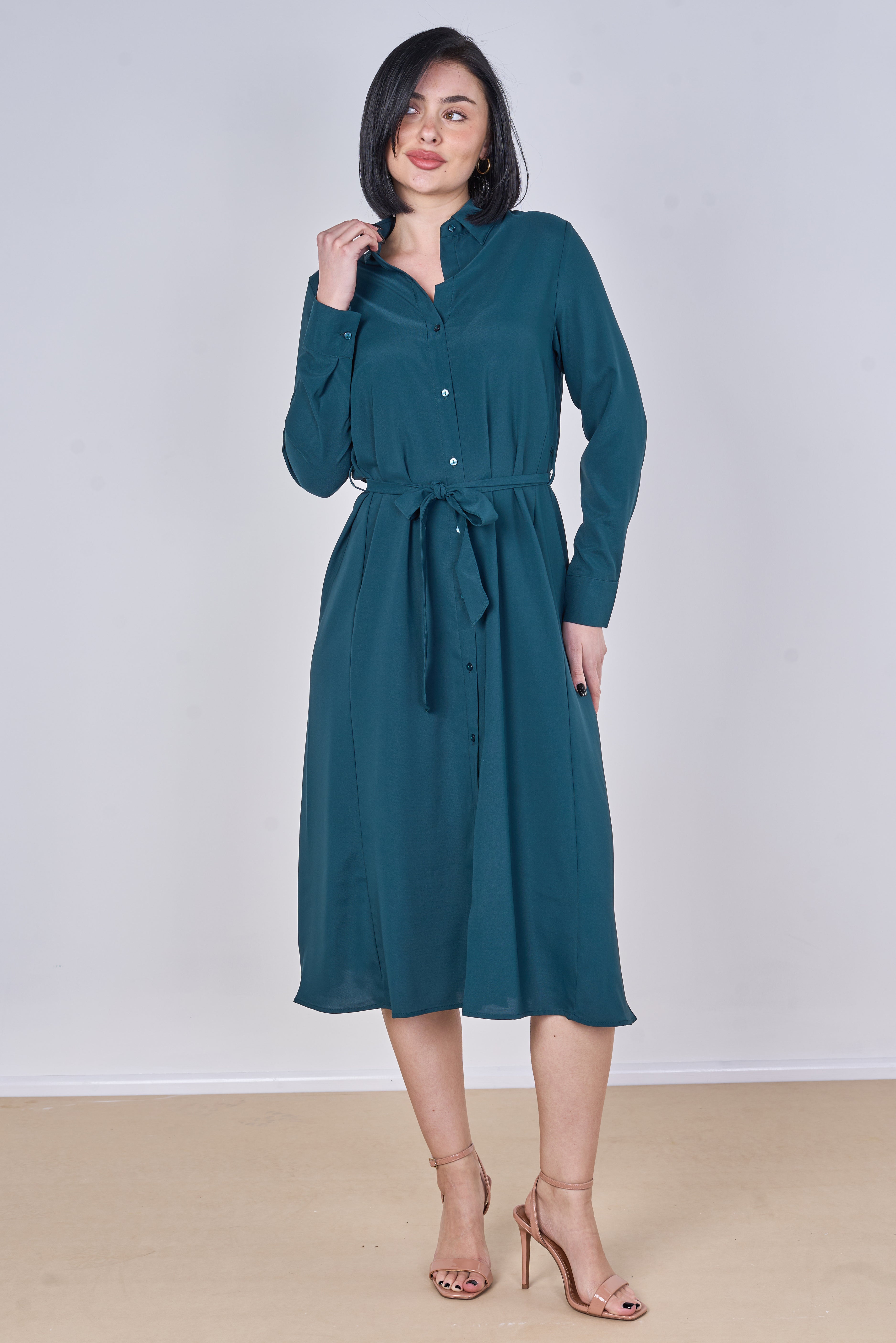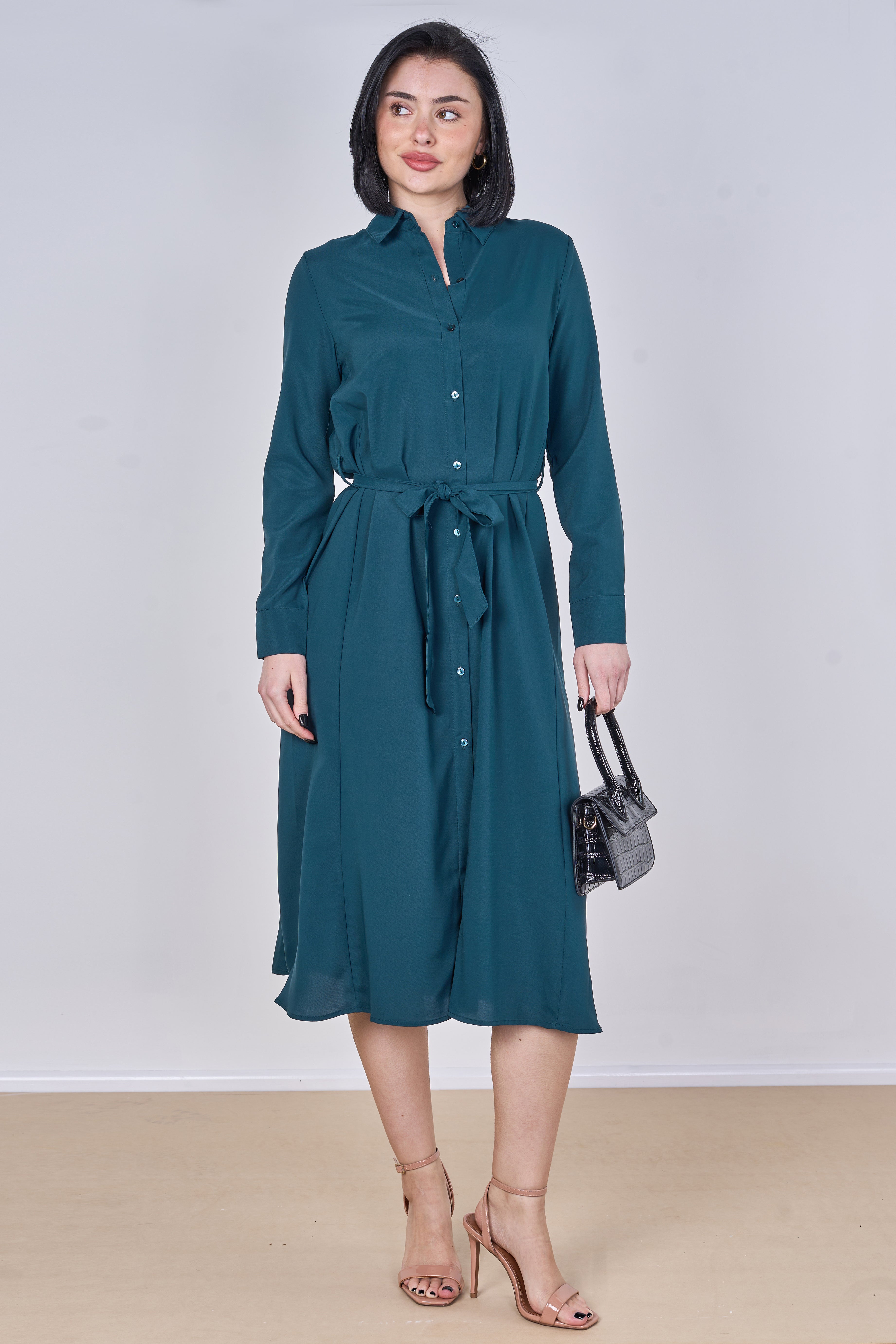 Teal Plain Belted Midi Shirt Dress